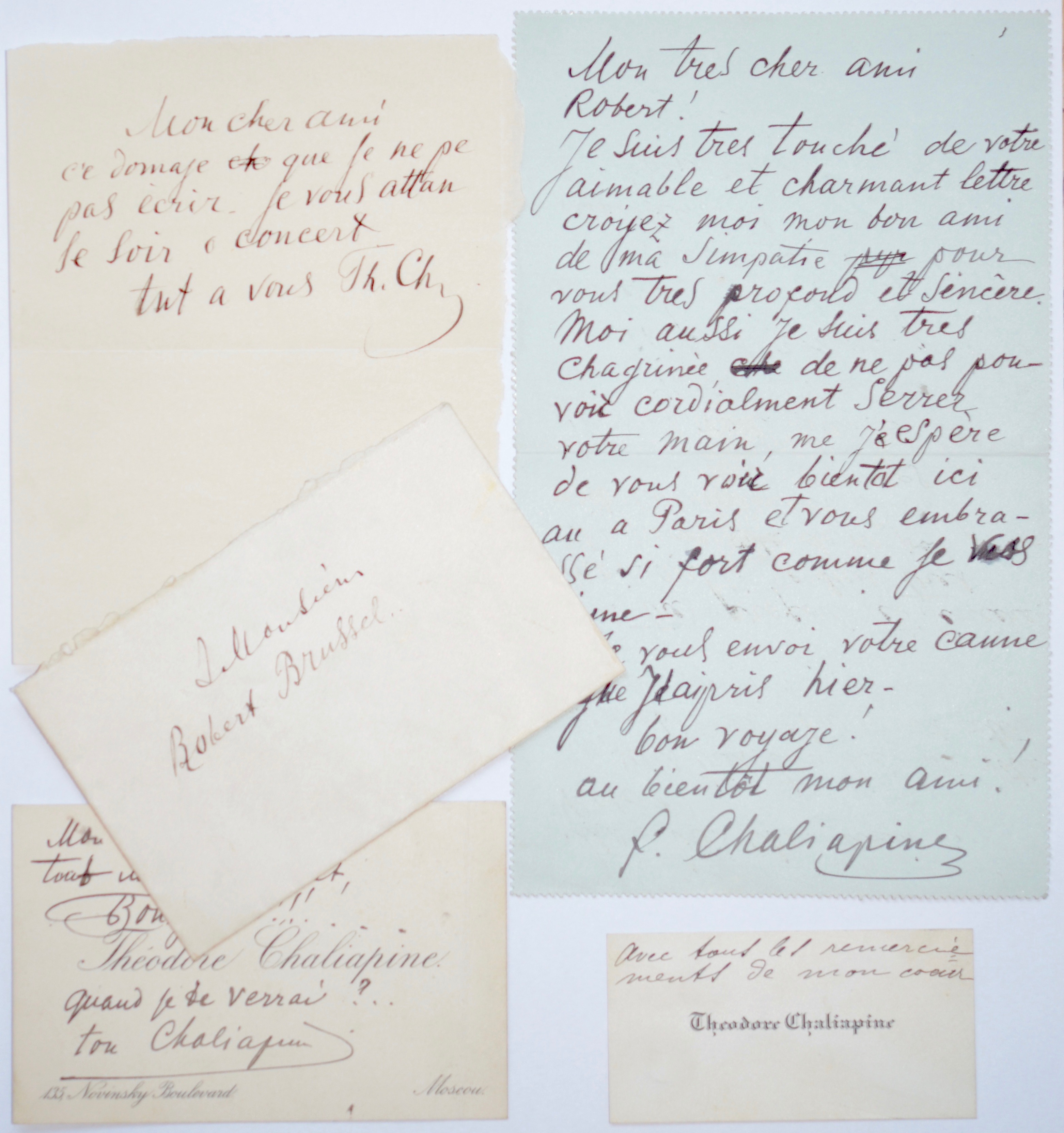 Fédor Chaliapine (Kazan, 1873/1938)Petite correspondance amicale de Fedor Chaliapine au critique Robert Brussel, grand défenseur des Ballets russes et qui participa à l'organisation du Sacre du Printemps en 1913. Dans une première courte lettre, Chaliapine se montre encore peu familier avec la langue française. "Mon cher ami, ce domage que je ne pe pas ecrir. Je vous attan se soir o concert. Tut a vous. Th. Ch.". Une seconde lettre est écrite sur carte pneumatique du château de Plaisance à Monte-Carlo. Je suis très touché de votre aimable et charmant lettre croyez moi mon bon ami de ma simpatie pour vous très profond et sincère. Moi aussi je suis très chagrinée de ne pas pouvoir cordialement serrer votre main, me j'espère de vous voir bientôt ici ou a Paris et vous embrassé si fort comme je vous aime. Je vous envoi votre canne que j'ai pris hier [...]". Une troisième écrite sur sa carte de visite à son adresse moscovite : "Mon cher Brussel! Tout mes compliment, Bon jours!!!... Quand je te verrai?... Ton Chaliapine".