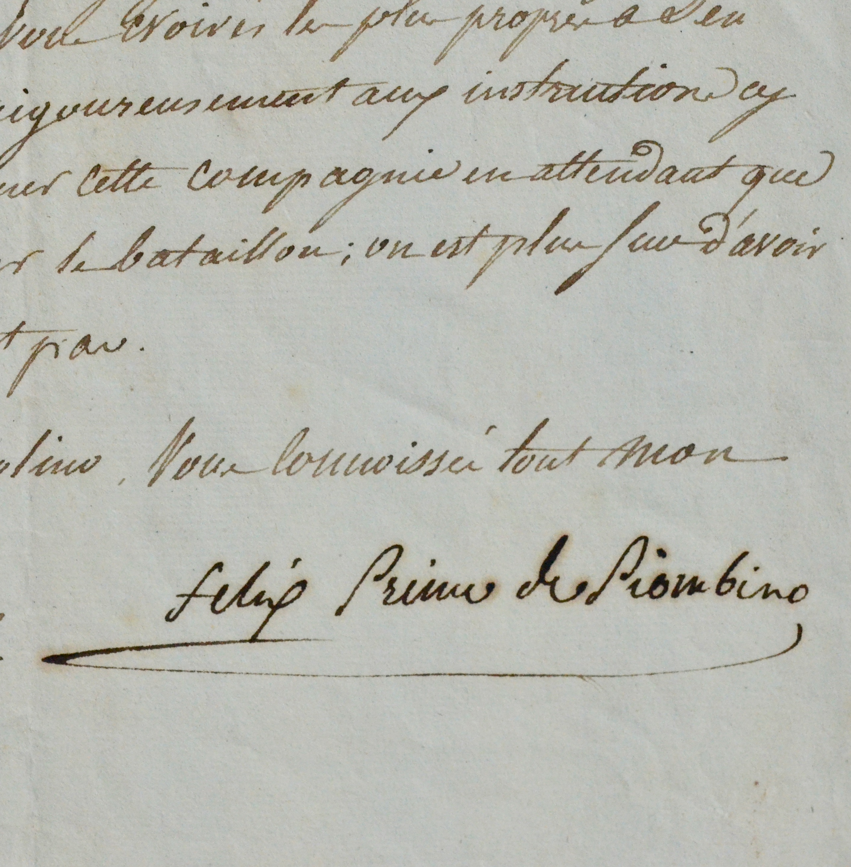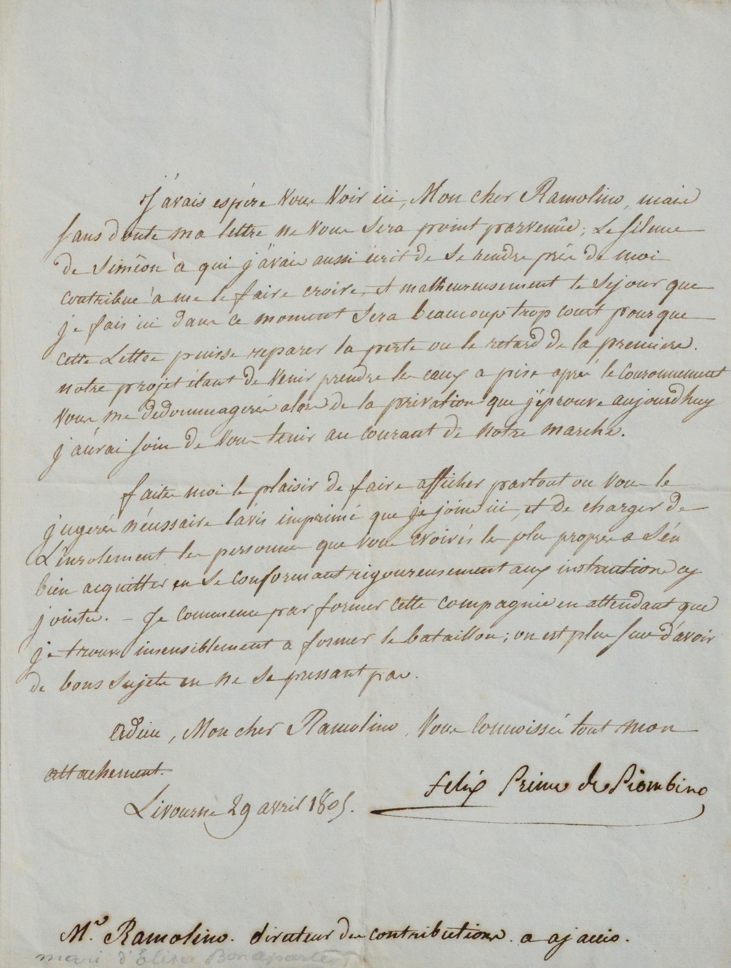 Félix Baciocchi (Ajaccio, 1762/1841)Sa dernière lettre s'est probablement égarée "le silence de Siméon à qui j'avais aussi écrit de se rendre près de moi contribue à me le faire croire [...]". Il considère que sa seconde lettre arrivera trop tard pour réparer le dommage. Il ajoute "[...] notre projet étant de venir prendre les eaux à Pise après le couronnement [probablement de Napoléon comme Roi d'Italie, 17 mars 1805] vous me dédommagerez alors de la privation que j'éprouve aujourd'hui, j'aurai soin de vous tenir au courant de notre marche. En attendant, M. Ramolino voudra bien faire afficher partout où il lui semblera bon un avis imprimé que je joins ici, de charger de l'enrôlement la personne que vous croirés la plus propre à s'en bien acquitter en se conformant rigoureusement aux instructions cy-jointes. Je commence par former cette compagnie en attendant que je trouve insensiblement à former le bataillon; on est plus sur d'avoir de bons sujets en ne se pressant pas".