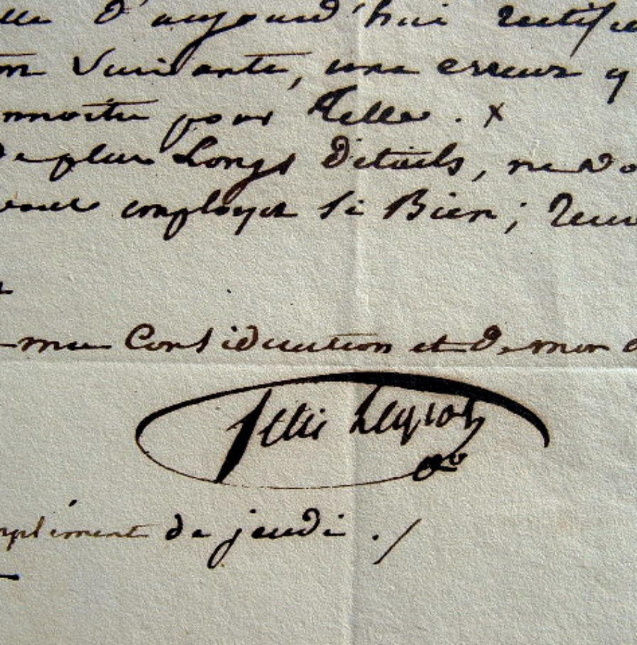 «Loin d'avoir provoqué l'article qui me concerne dans votre journal d'hier, je ea désavoue de toutes mes forces. L'accomplissement d'un devoir a été dans ces derniers jours une chose trop commune pour mériter d'être citée». (Lettre datée du 13 août, sans doute de 1830, le Dr Legros ayant été très actif dans le secours des blessés, pendant la Révolution de juillet 1830).