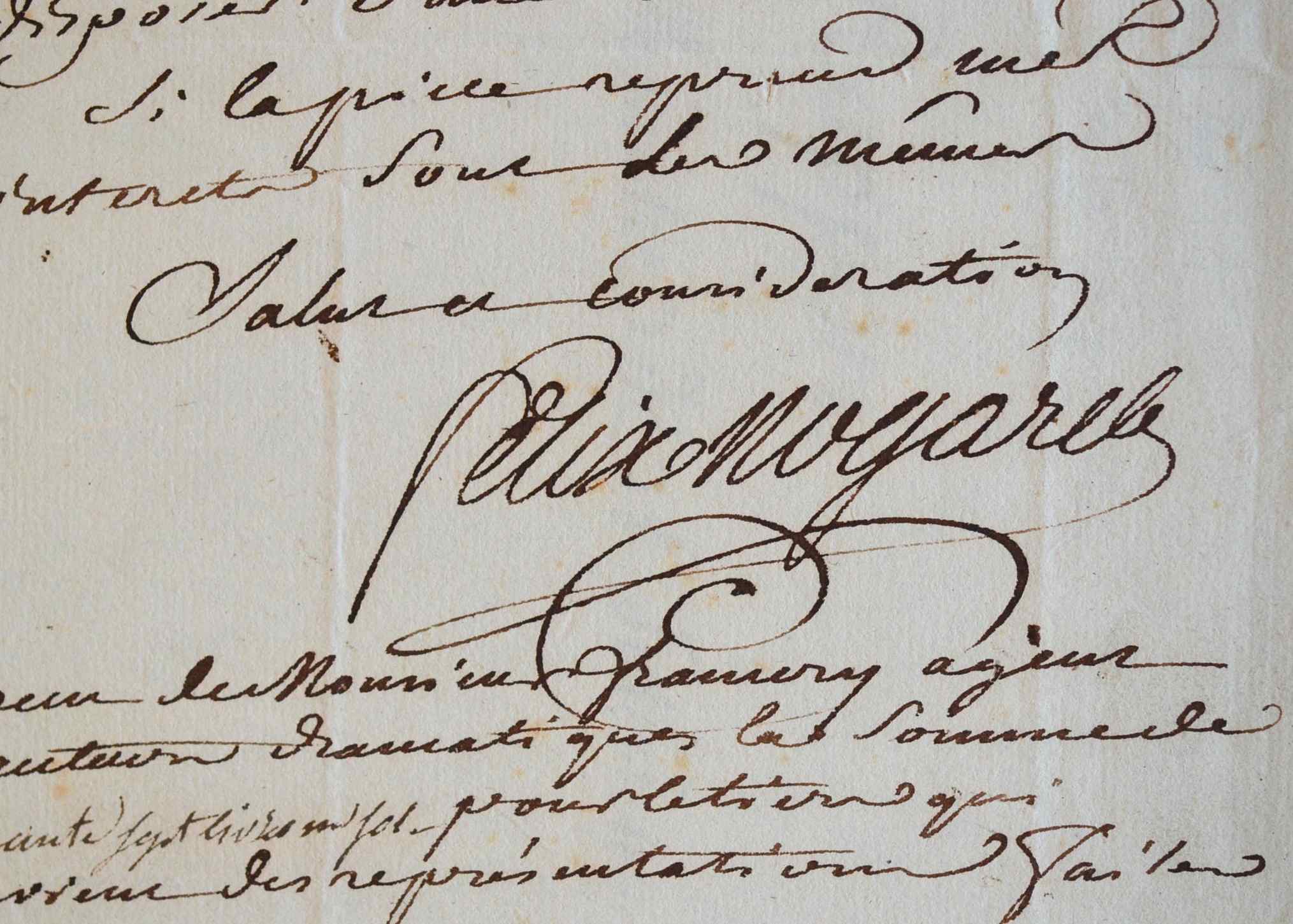 Par cette lettre, Félix Nogaret réclame son «revenu de représentation» pour son mélodrame Dugay-Trouin, auprès de Nicolas-Etienne Framery, grand précurseur du droit d'auteur pour les dramaturges. 47 livres et 1 sol lui sont immédiatement remis.