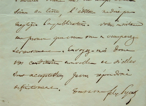 Le sachant très occupé, il hésitait à lui donner un nouveau travail. «Car si l'auteur donne tout son temps et ses soins au livre, l'éditeur ne doit pas négliger la publication. Votre insistance me prouve que vous vous en occuperez sérieusement». Il lui demande ses conditions.