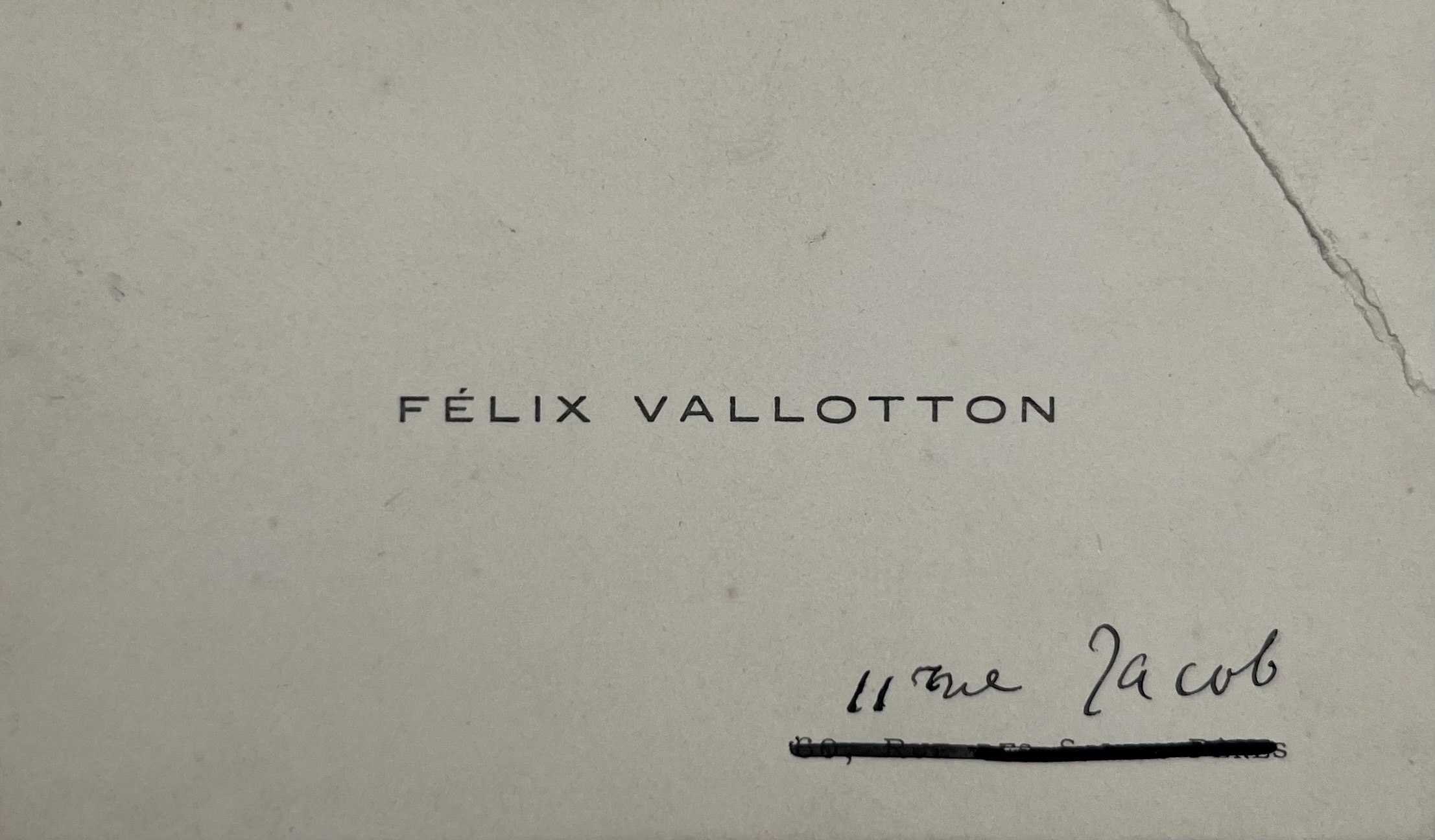 Au recto de la carte, sous son nom imprimé, Vallotton a modifié son adresse "11 rue Jacob".