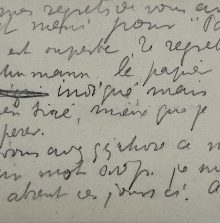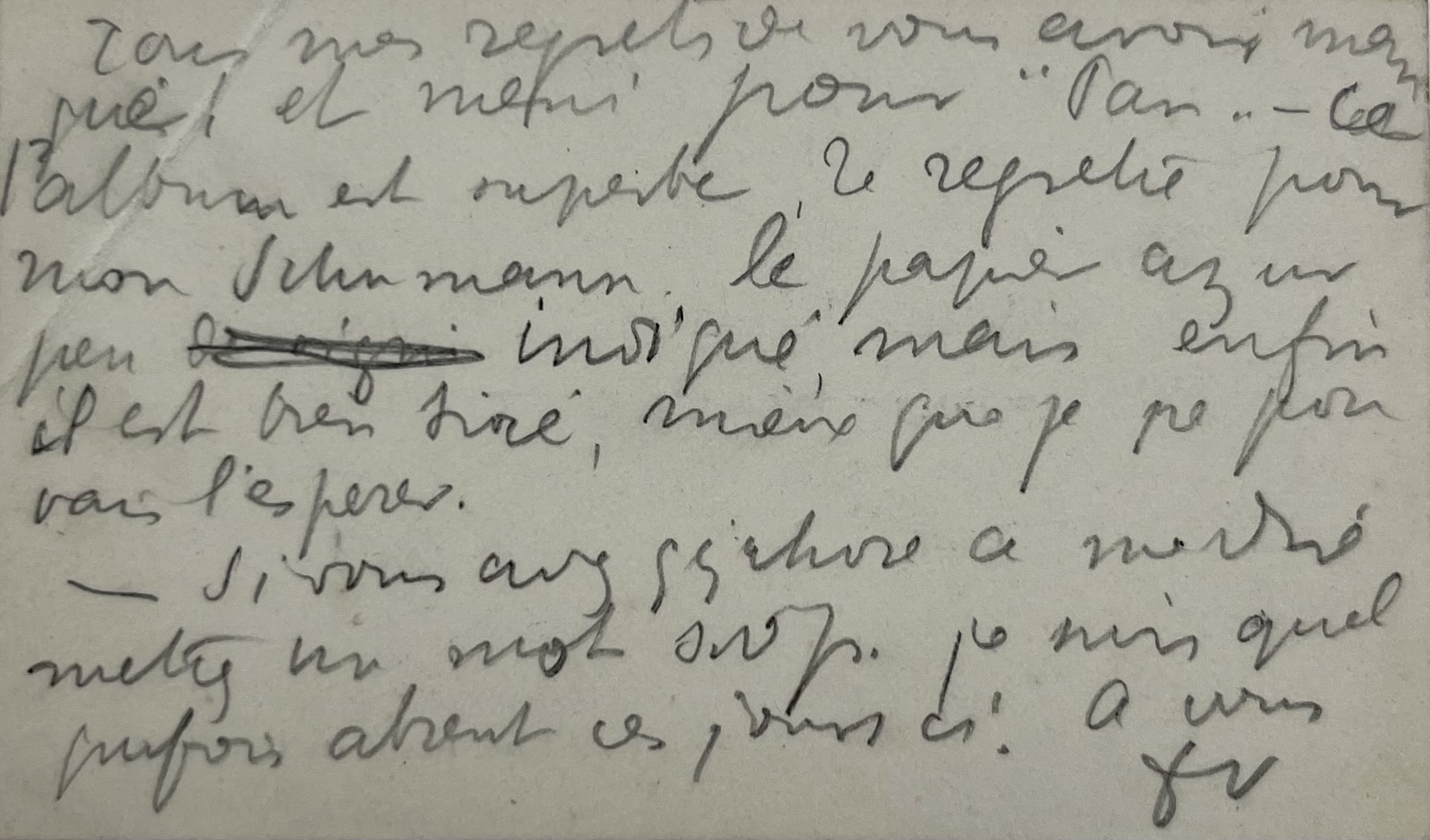 "Tous mes regrets de vous avoir manqué et merci pour "Pan". Cet album est superbe, je regrette pour mon Schumann le papier assez peu indiqué mais enfin il est très bien tiré, mieux que je ne pouvais l'espérer. Si vous avez qqchose à me dire mettez un mot s.v.p. je suis quelquefois absent ces jours-ci ! A vous. FV".