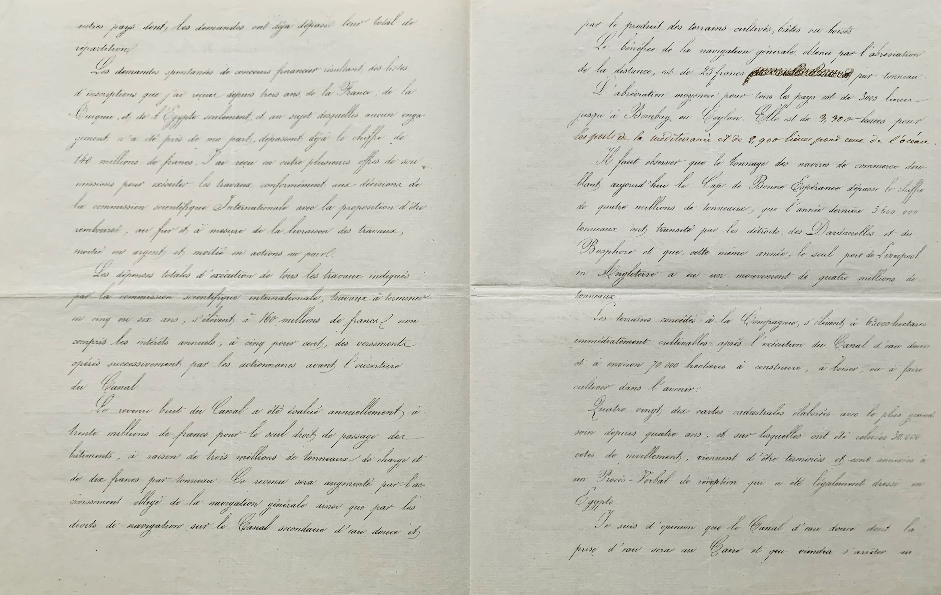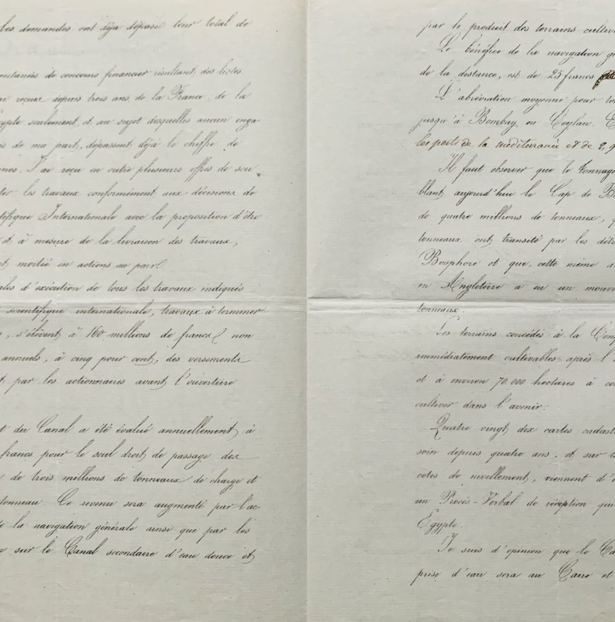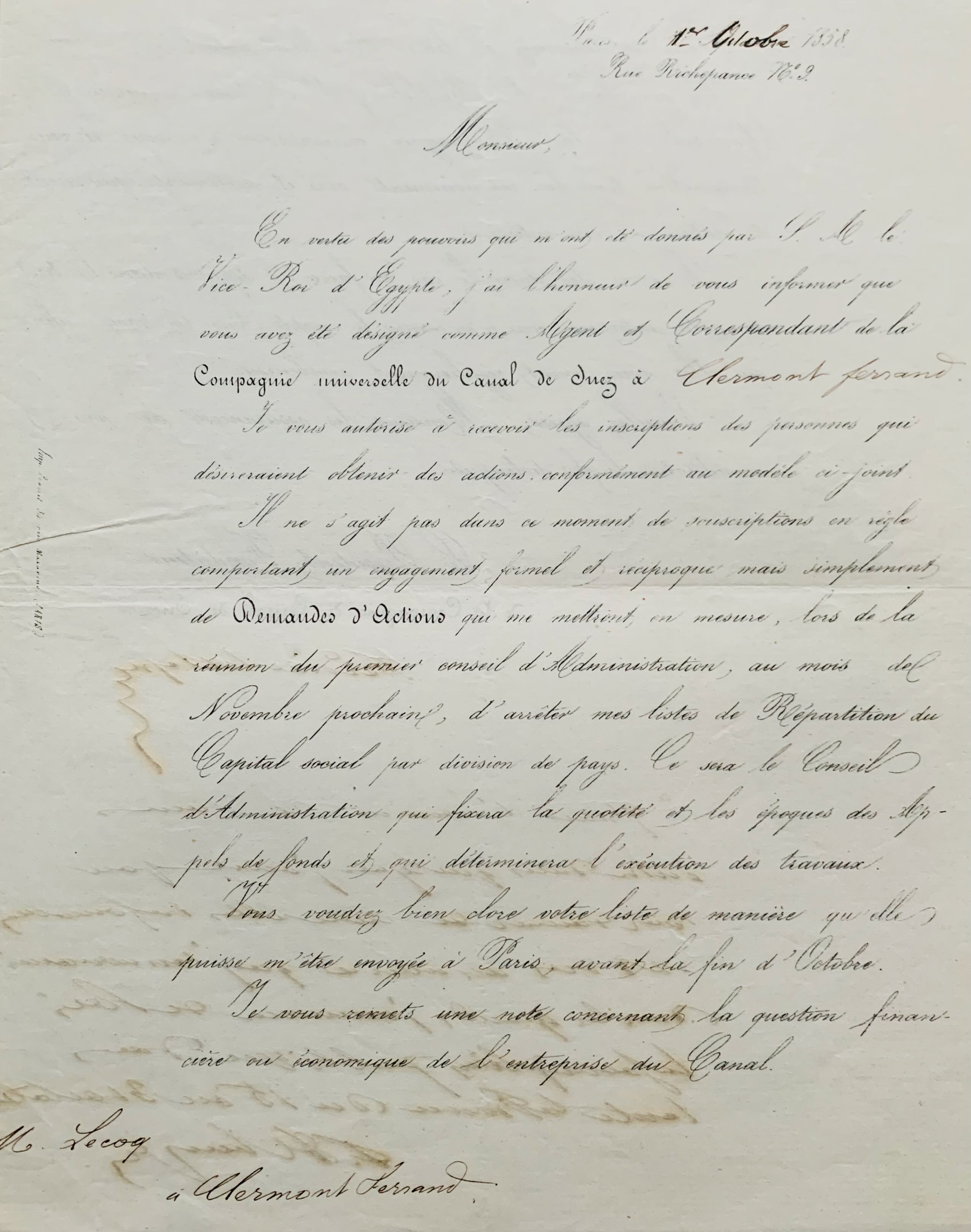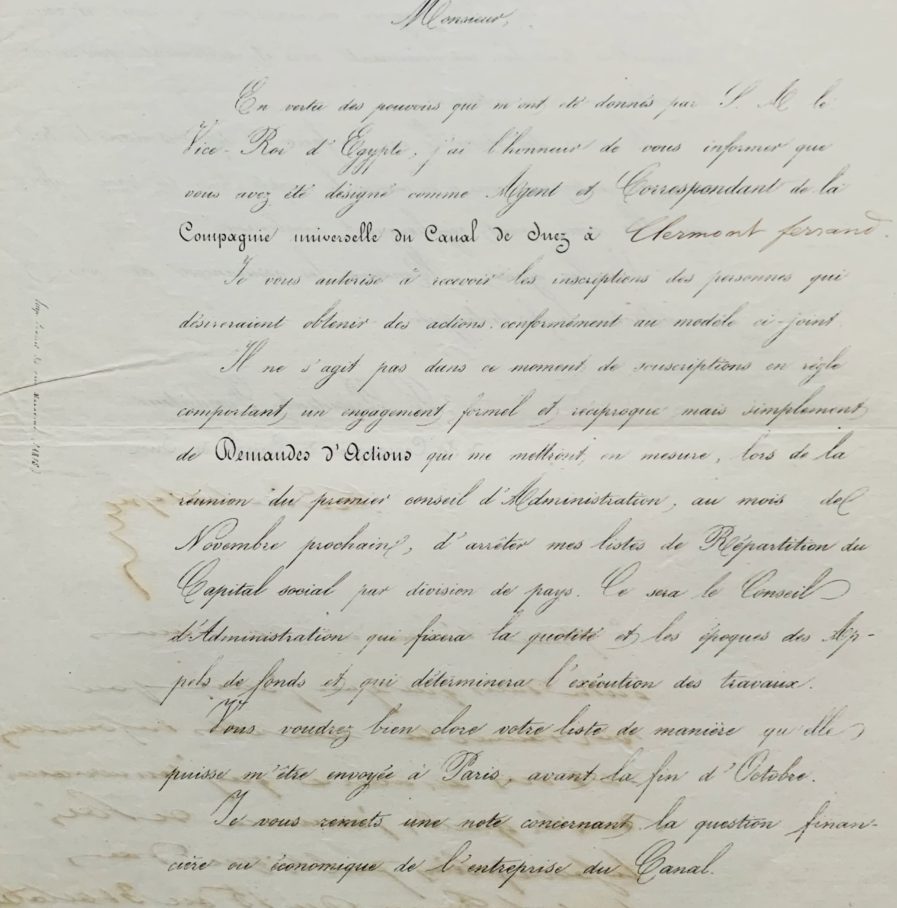 Ferdinand de Lesseps (Versailles, 1805/1894)Deux lettres circulaires apostillées et signées par Ferdinand de Lesseps, nommant Henri Lecoq agent et correspondant de la Compagnie universelle du Canal de Suez à Clermont-Ferrand. Il lui donne des instructions pour recueillir des actions et, dans une "note sur la question économique de l'entreprise du Canal maritime de Suez", le renseigne sur le financement de l'entreprise et des travaux.