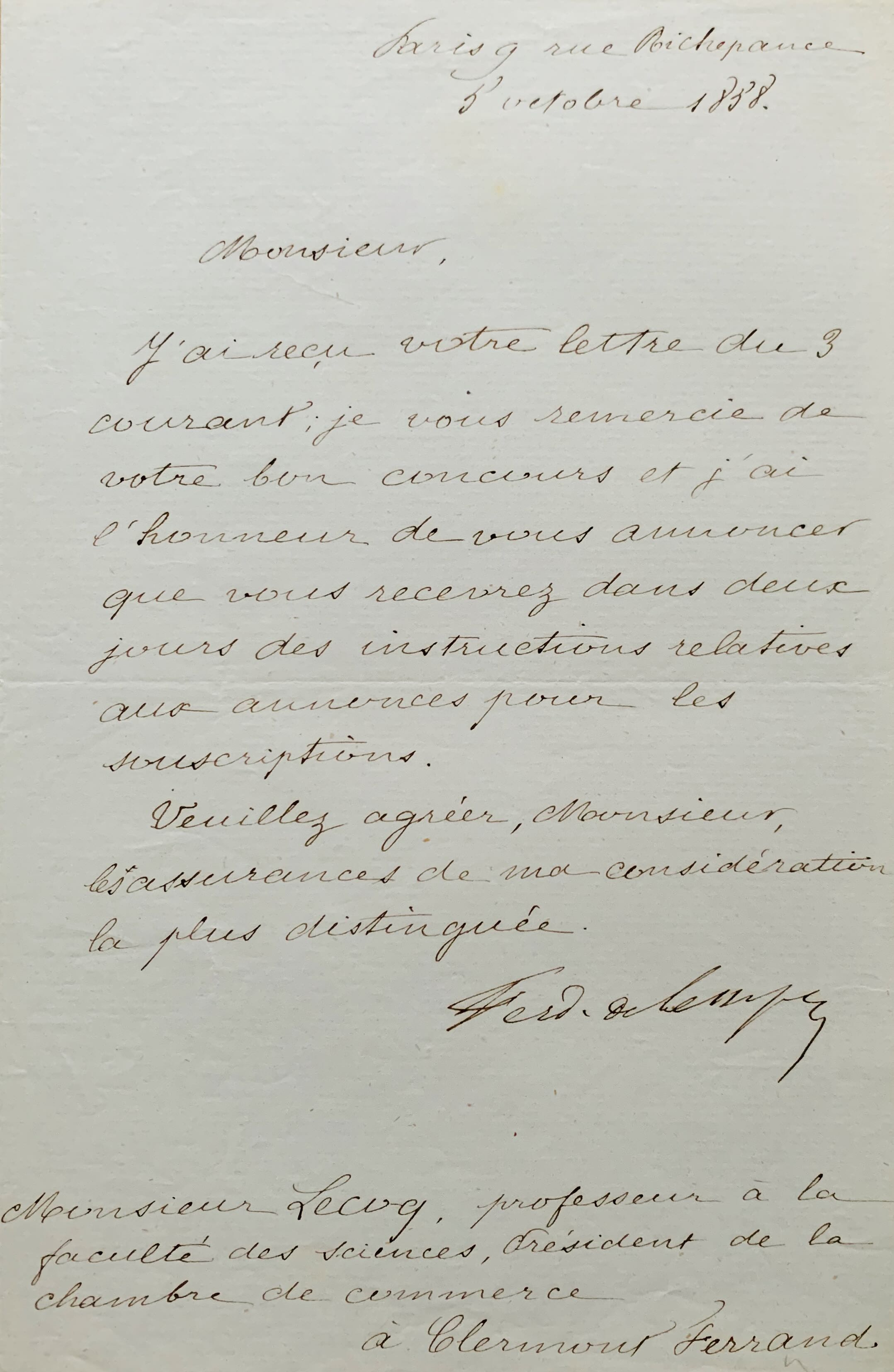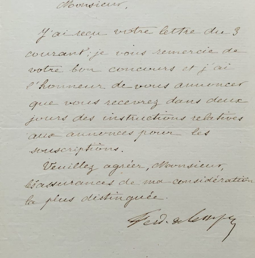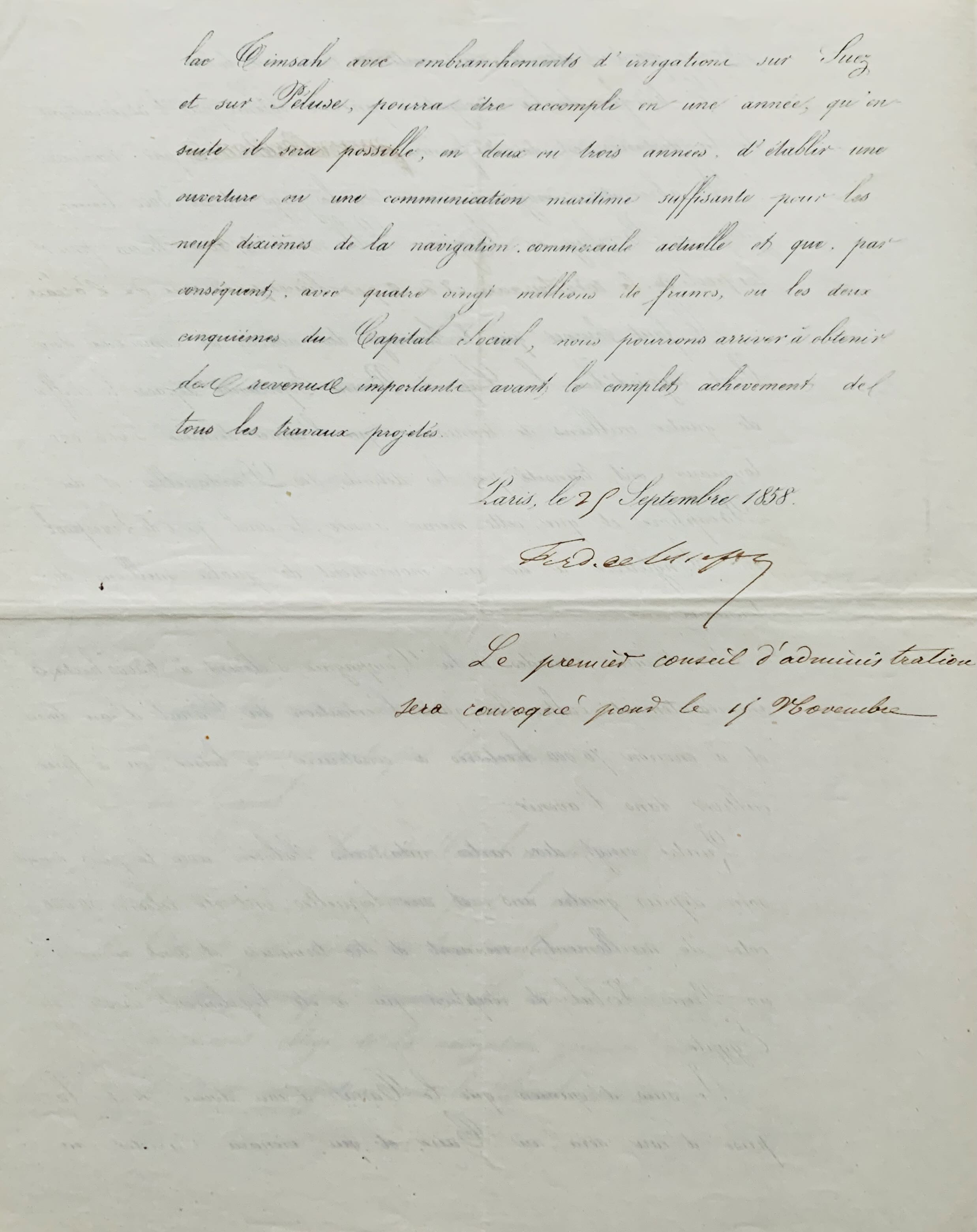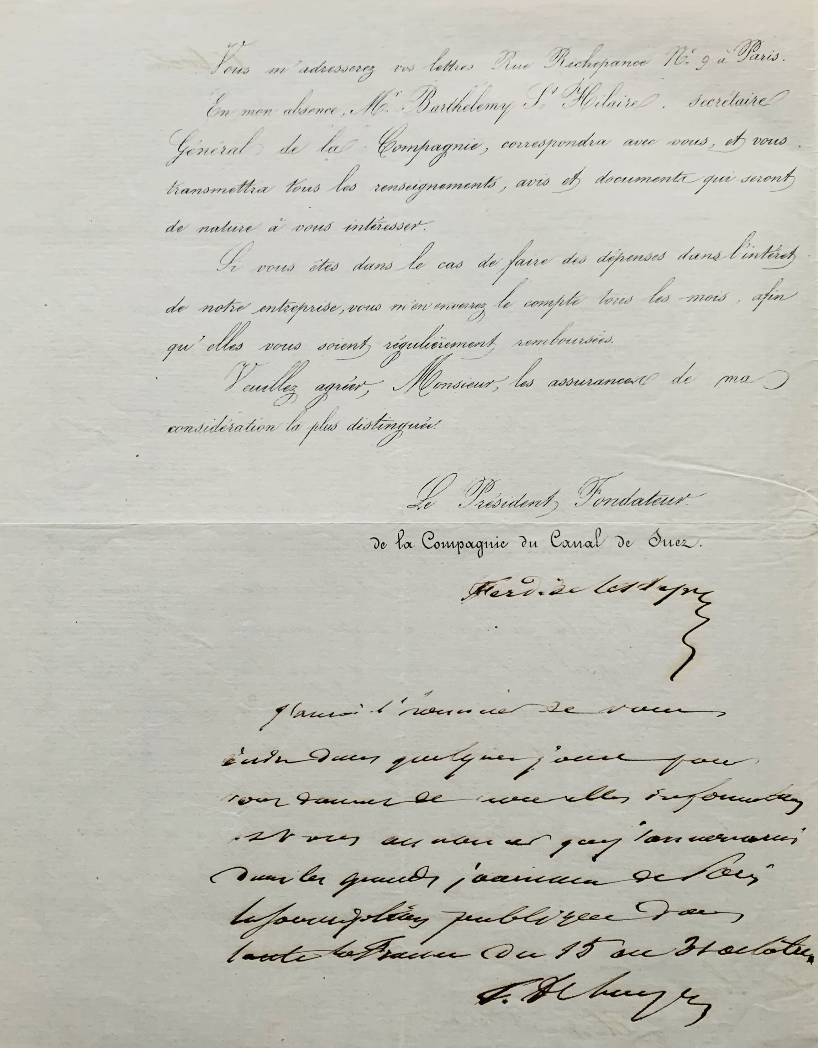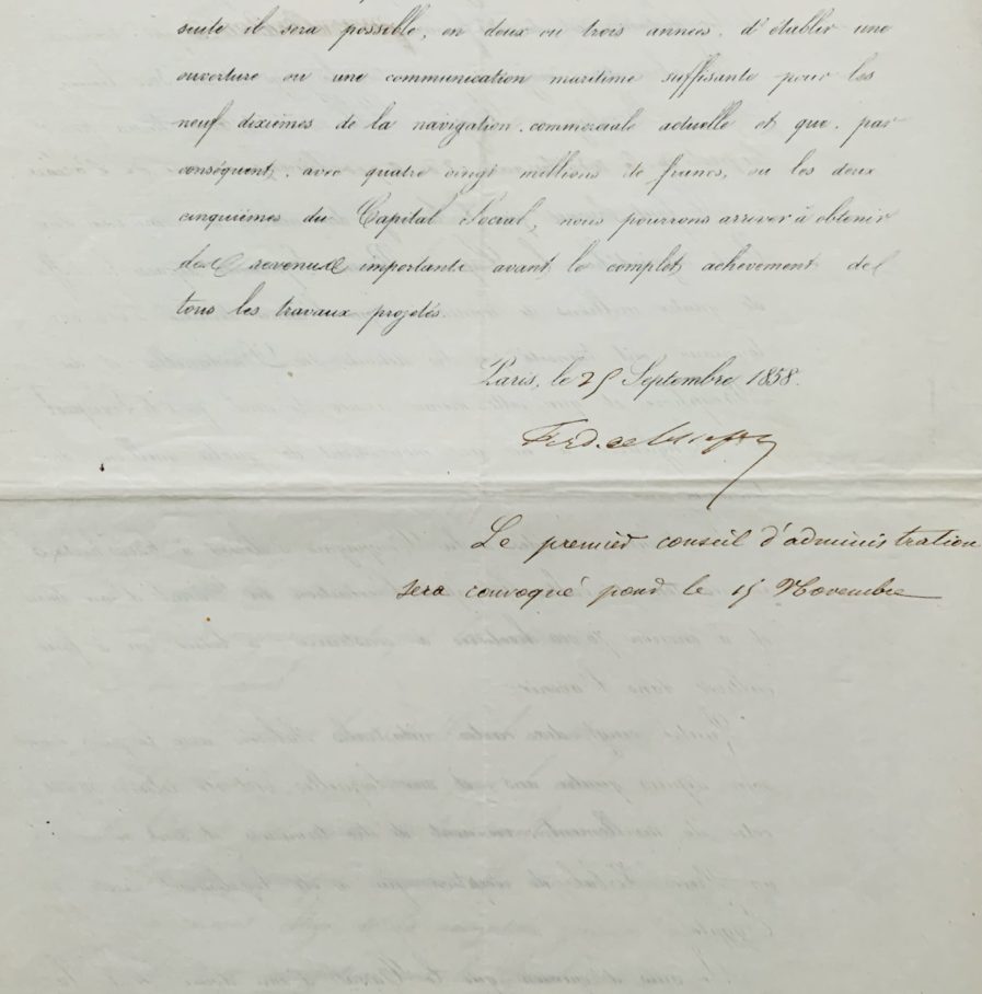 Ferdinand de Lesseps complète de sa main : "J'aurai l'honneur de vous écrire dans quelques jours pour vous donner de nouvelles informations et vous annoncer que j'annoncerai dans les grands journaux de Paris la souscription publique dans toute la France du 15 au 31 octobre. F. de Lesseps".