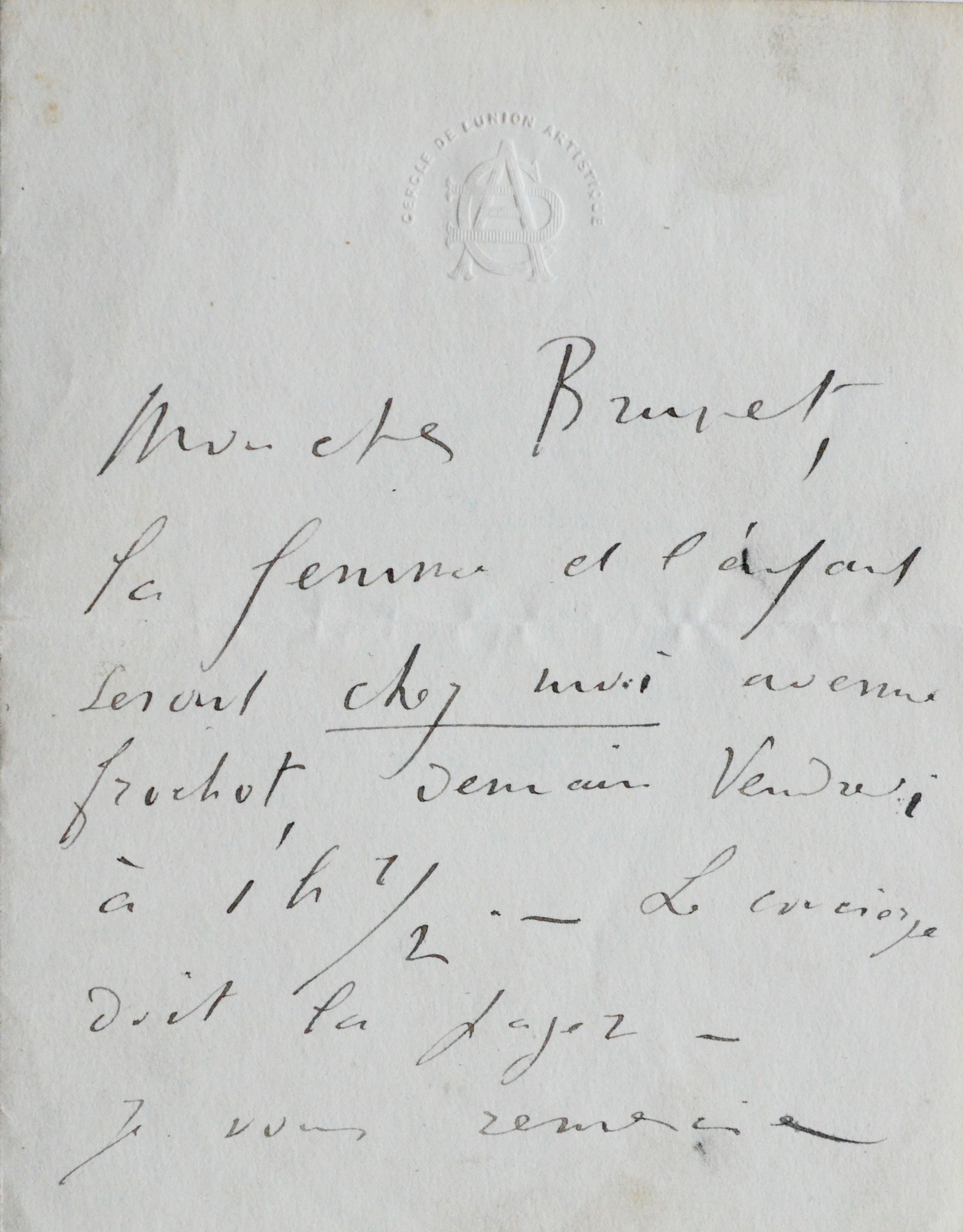 Encre brune sur double feuillet de papier vergé filigrané "Original Turkey Mill Kent". En-tête gaufré "Cercle de l'union artistique".
