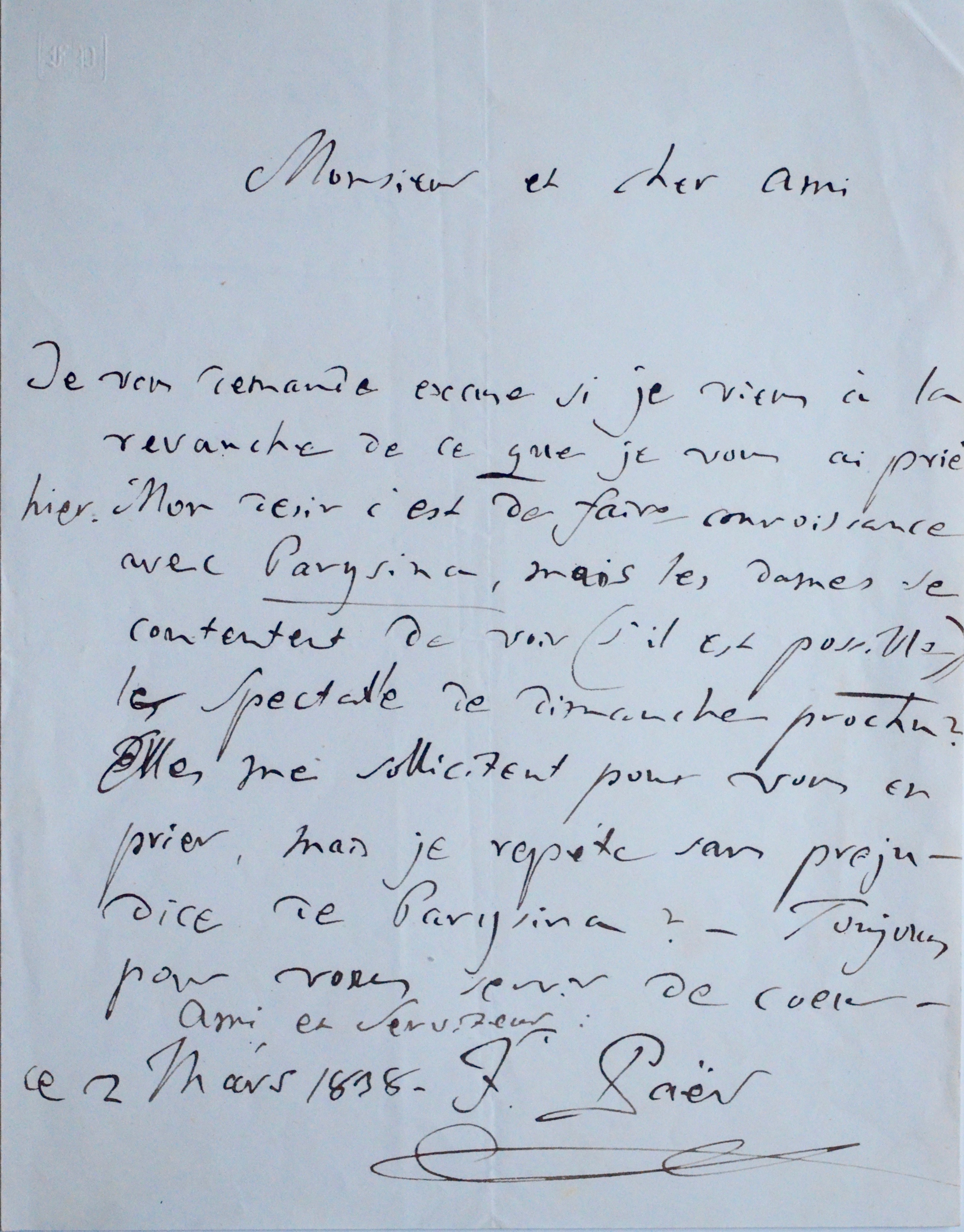 Il réitère sa demande. "Mon désir c'est de faire connaissance avec Parysina, mais les dames se contentent de voir (s'il est possible) le spectacle de dimanche prochain ? Elles me sollicitent pour vous en prier, mais je répète sans préjudice de Parysina. Toujours pour vous servir de coeur. Ami et serviteur".