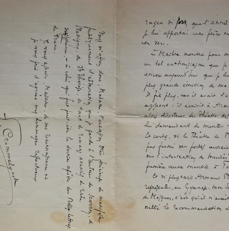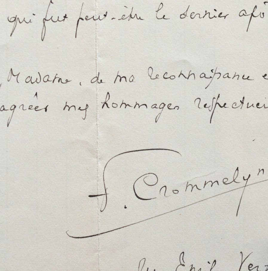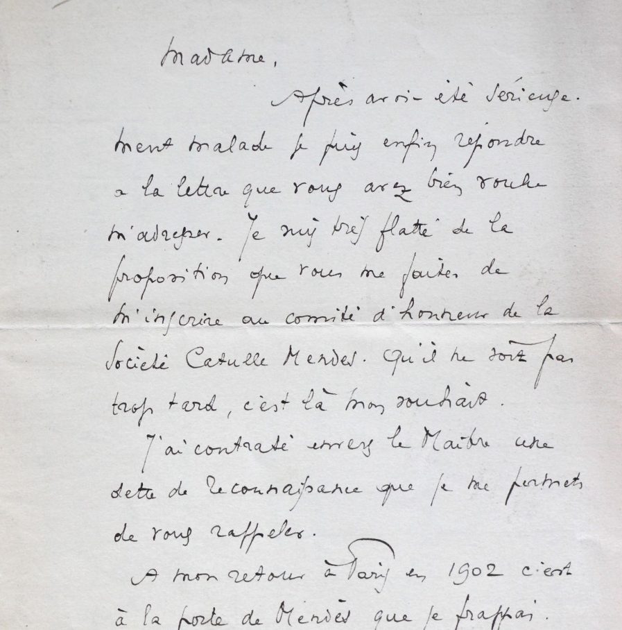 Fernand Crommelynck (Paris, 1886/1970)Fernand Crommelynck accepte avec plaisir de faire partie du comité d'honneur de la Société Catulle Mendès, et lui rend hommage pour l'aide qu'il lui apporta au début de sa carrière. "J'ai contracté envers le Maître une dette de reconnaissance que je me permets de vous rappeler. A mon retour à Paris en 1902, c'est à la porte de Mendès que je frappai. J'avais à peine 15 ans. Il voulut bien écouter mes premiers essais et m'encouragea si fort, que l'année suivante je lui apportai une pièce en 5 actes et en vers. Le Maître montra pour mon oeuvre un tel enthousiasme que je puis dire encore aujourd'hui que je lui dois la plus grande émotion de ma vie littéraire. Il fit plus, car il avait l'enthousiasme agissant : il écrivit à Armand Bour, alors directeur du Théâtre des Poètes, lui demandant de monter la pièce [...]".