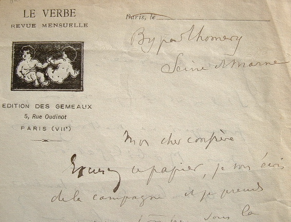 « Excusez ce papier, je vous écris de la campagne et je prends ce qui me tombe sous la main. Tout très réfléchis, je regrette que vous n'ayez pas suivi mon indication [...] La fin en paraît néronnienne aujourd'hui. Ce n'était qu'un encouragement dans le feu de la guerre [...]. Pourquoi ne mettez vous pas Mobilisation, les tambours, les sourds tambours [...]». Le recueil de poème La Couronne Douloureuse est publié par Pasquelle en 1917.