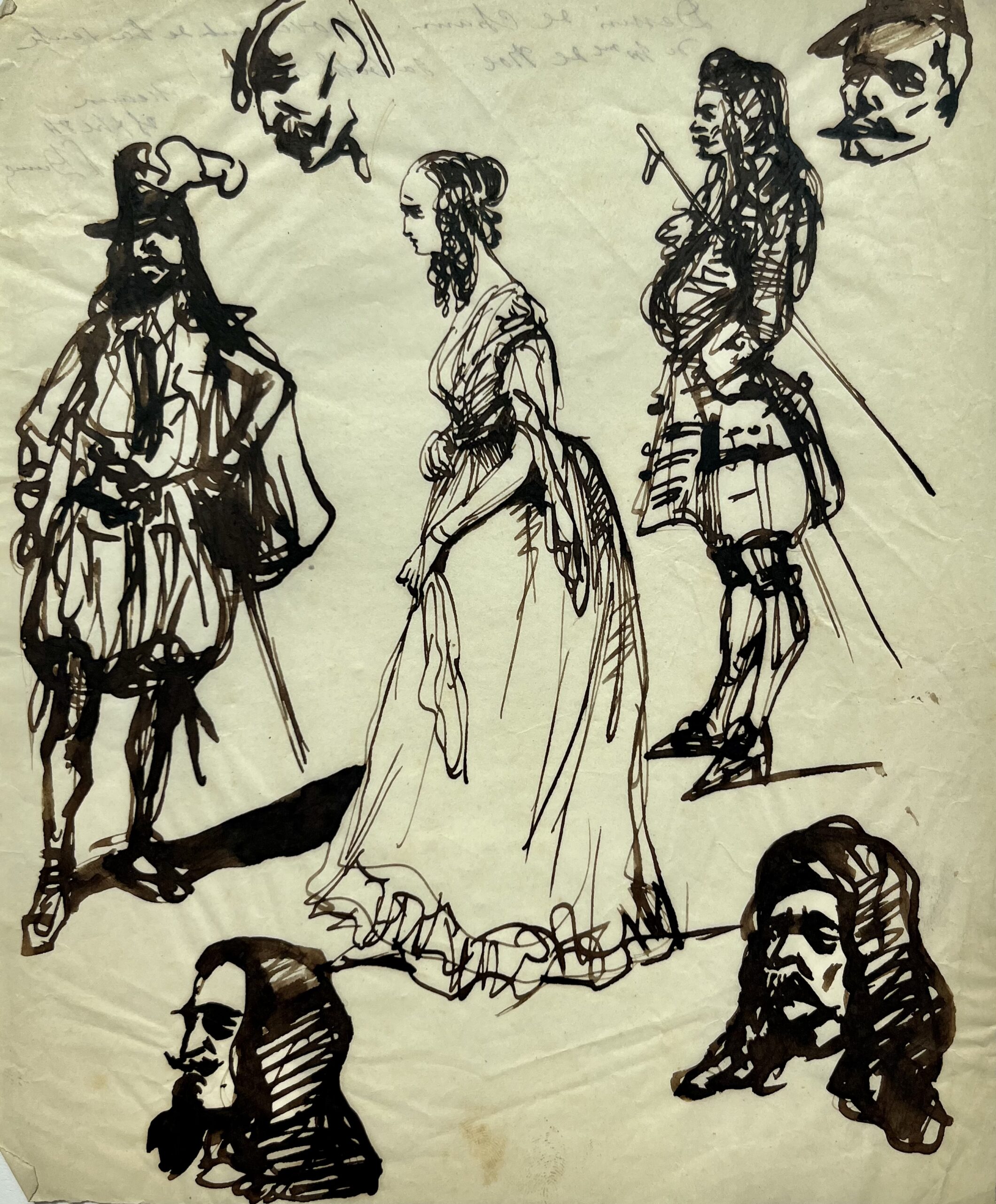 Sur une feuille, à la plume et à l'encre noire, le caricaturiste Cham a croqué 7 personnages : trois sont en pied (deux hommes portant épée et une femme en robe longue) et quatre études de têtes d'hommes à moustache.