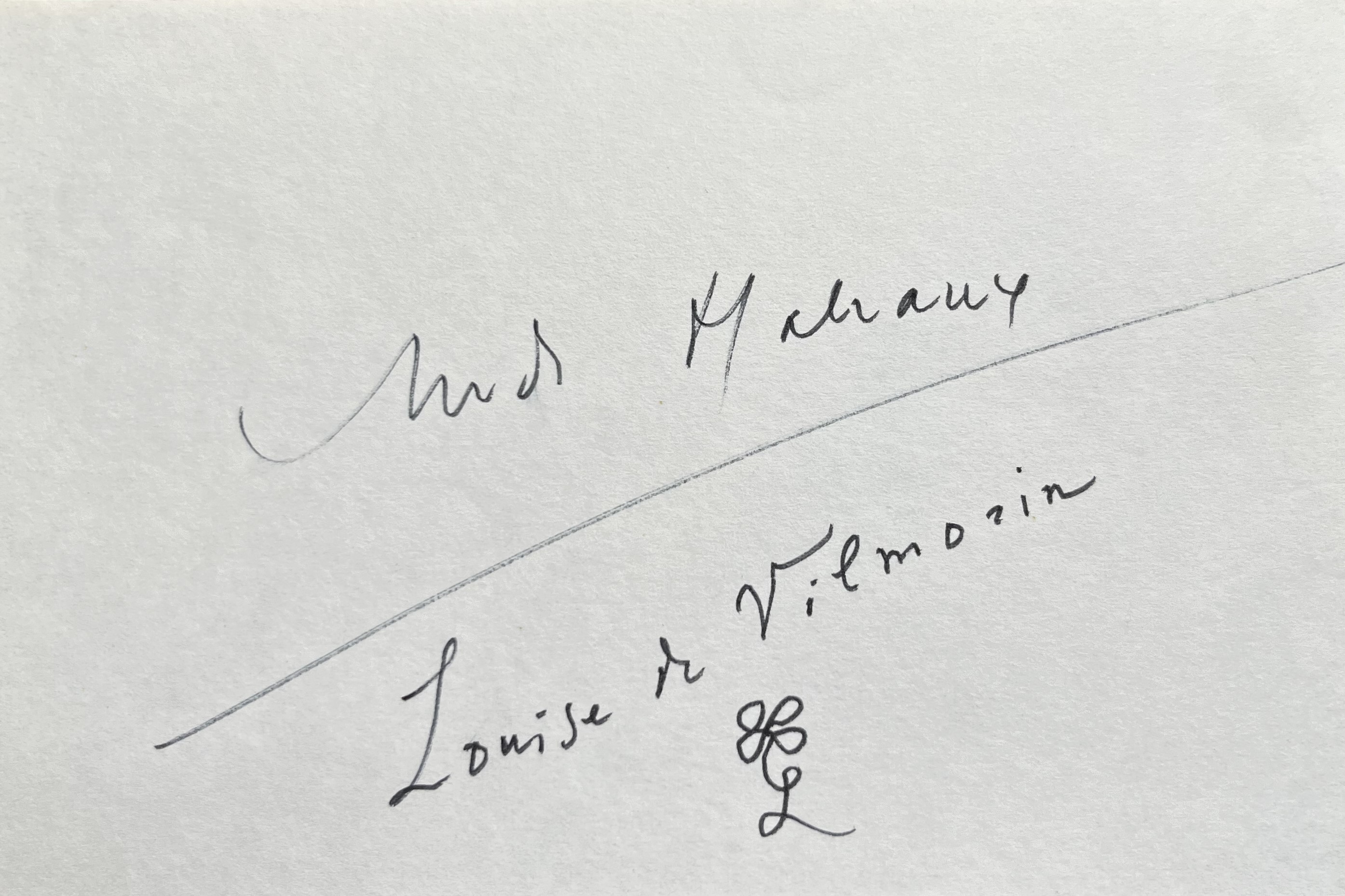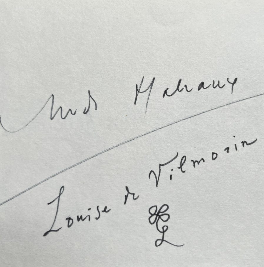 Sur un feuillet blanc, signatures autographes au feutre noir d'André Malraux et de Louise de Vilmorin (avec, en dessous, un L majuscule surmonté d'un trèfle à quatre feuilles).