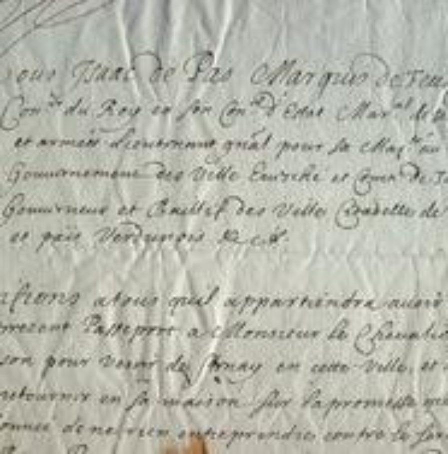 Feuquières signe ce passeport permettant au chevalier de Sanson de «venir de Stenay en cette ville et de là s'en retourner en sa maison sur la promesse qu'il nous a donnée de ne rien entreprendre contre le service du Roy [...]». (Gouverneur de Verdun, Feuquières bat les Espagnols à Stenay, en 1652).