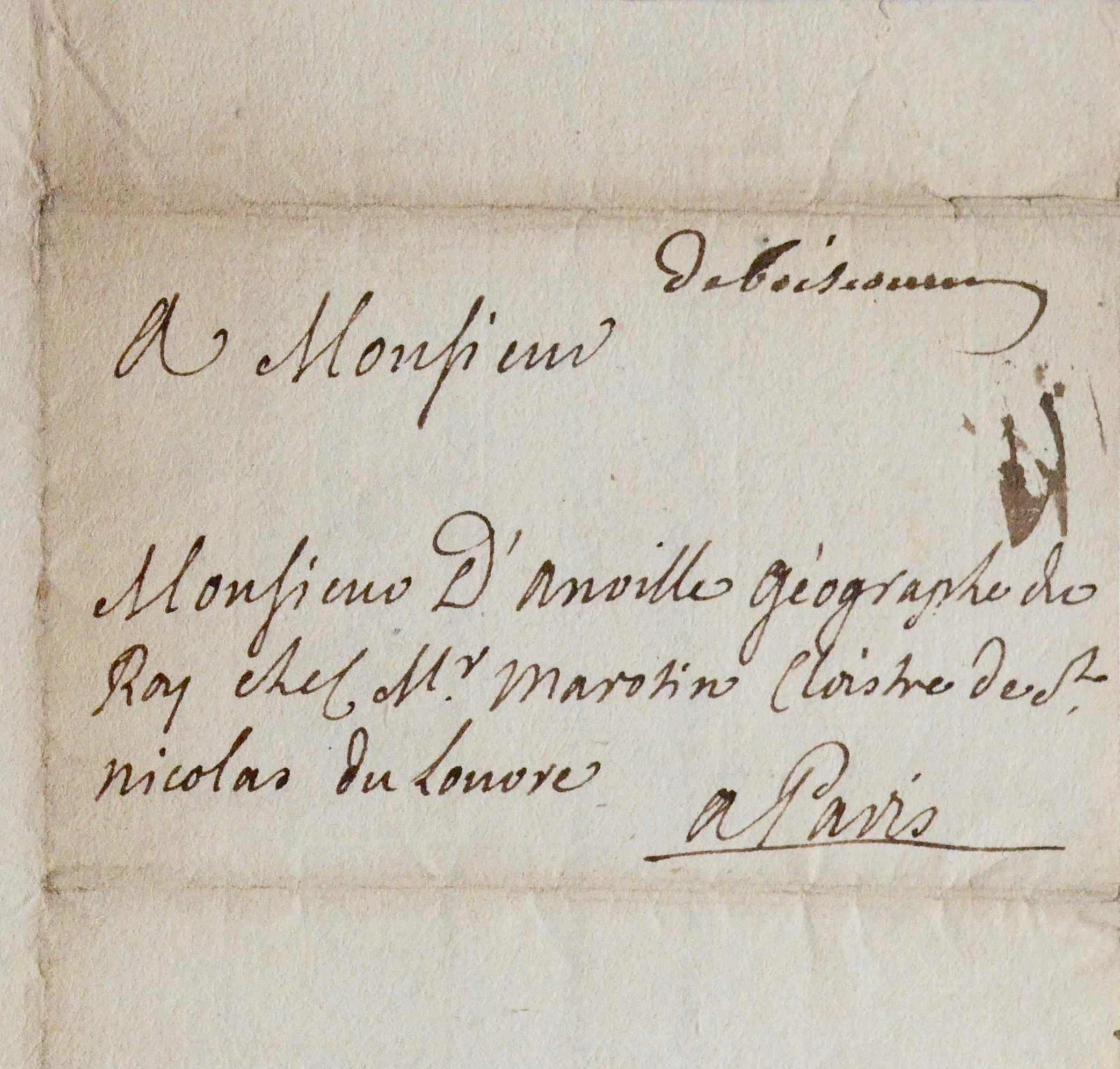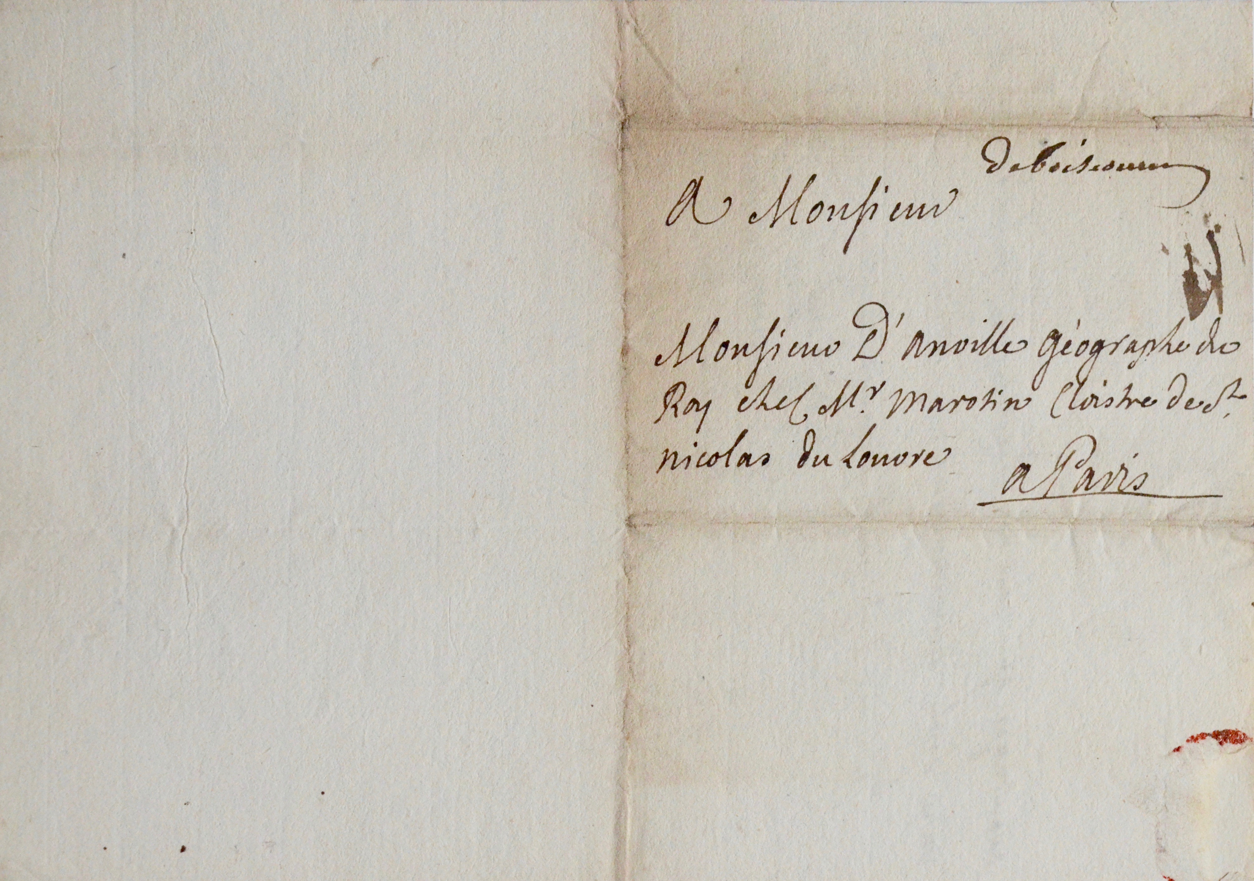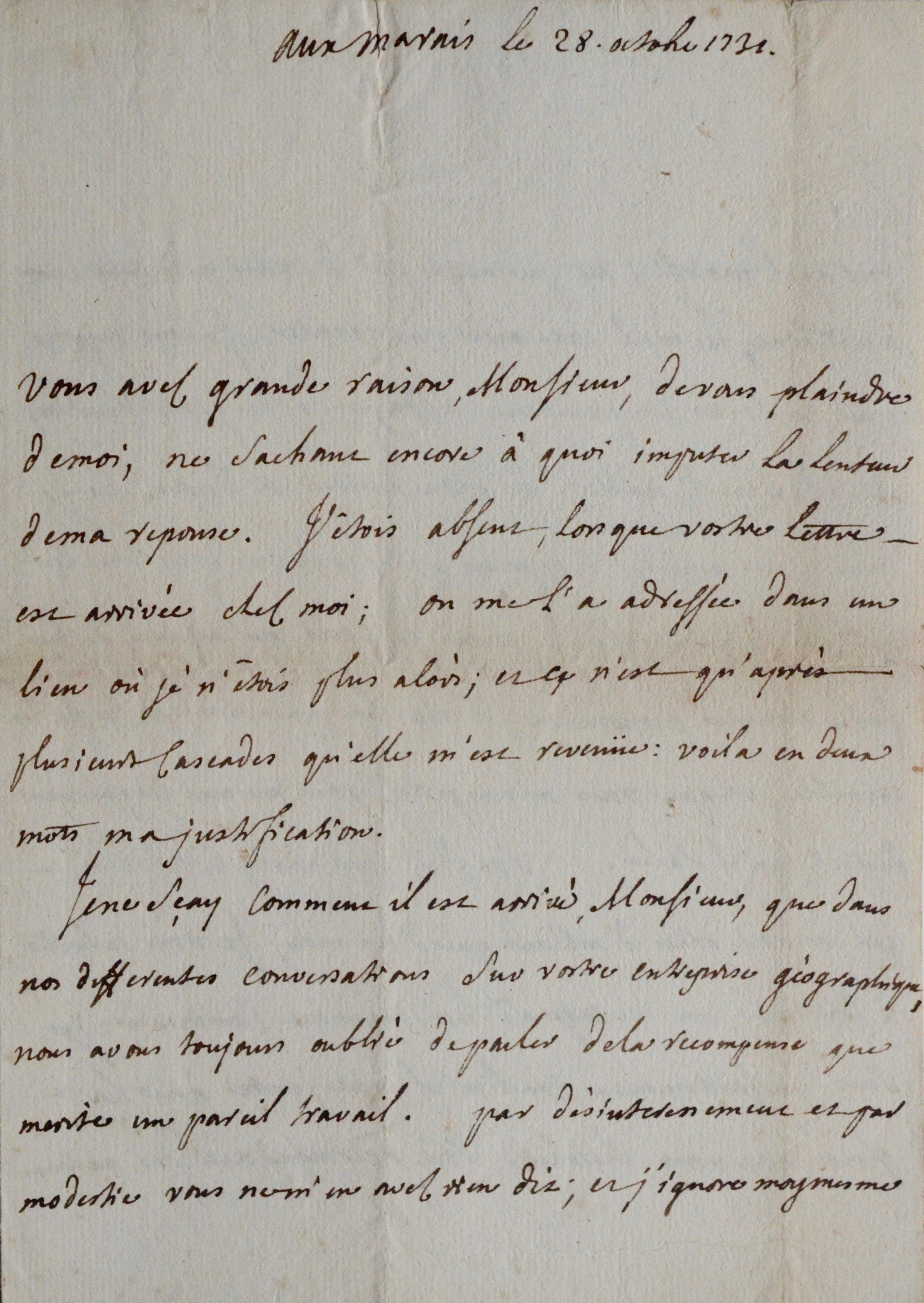 "Je ne sçay comment il est arrivé, Monsieur, que dans nos différentes conversations sur votre entreprise géographique, nous avons toujours oublié de parler de la récompense que mérite un pareil travail. Par désintéressement et par modestie vous ne m'en avez rien dit ; et j'ignore moy mesme par quel motif j'ay pu négliger de vous prévenir. Après tout, le mal est aisé à réparer. Je vous repons [sic] que ce sera la première affaire dont j'entretiendray M. le Duc D'Antin à mon arrivée à Paris ; et je puis vous assurer d'avance qu'il entrera dans tout ce qui lui sera proposé [...]". Néanmoins, avant d'avoir cette discussion, Foncemagne sollicite une conversation à ce sujet avec D'Antin. Il exhorte ensuite son correspondant à "continüer un ouvrage si heureusement commencé : je sens parfaittement [sic] combien il est juste que la gloire que vous cherchez soit accompagnée des autres avantages que vous ne cherchez pas : on les devrait à vostre seul désintéressement [...]".
