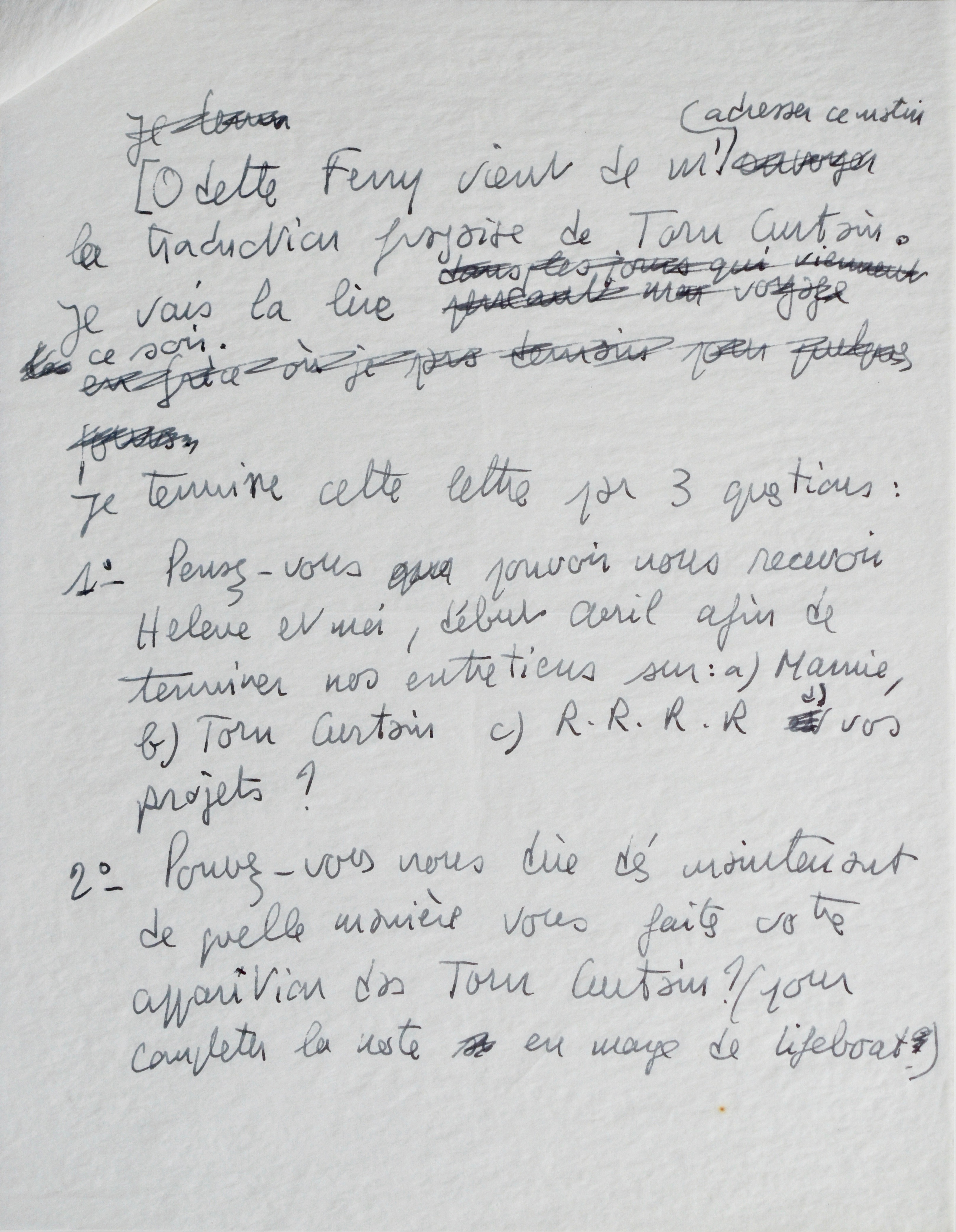 "Odette Ferry vient de m'adresser ce matin [l'ouvrage, biffé] la traduction française de Torn Curtain. Je vais la lire [dans les jours qui viennent, pendant mon voyage en Grèce où je pars demain pour quelques jours, biffé] ce soir."