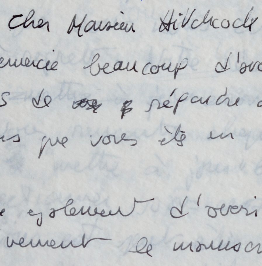 Etant donné que nous n'avons fait Helen et moi qu'un travail [de journaliste, biffé] journalistique et qu'il s'agit [bien, biffé] en fait d'un livre d'Alfred Hitchcock nous pouvons bien vous avouer que nous dorons ce livre, au point même que nous nous en séparons à regret. Notre rêve serai [de le mettre à jour sans cesse, biffé] de vous rencontrer chaque année pour en "mettre à jour" le [livre, biffé] manuscrit, le perfectionner sans cesse. [...]