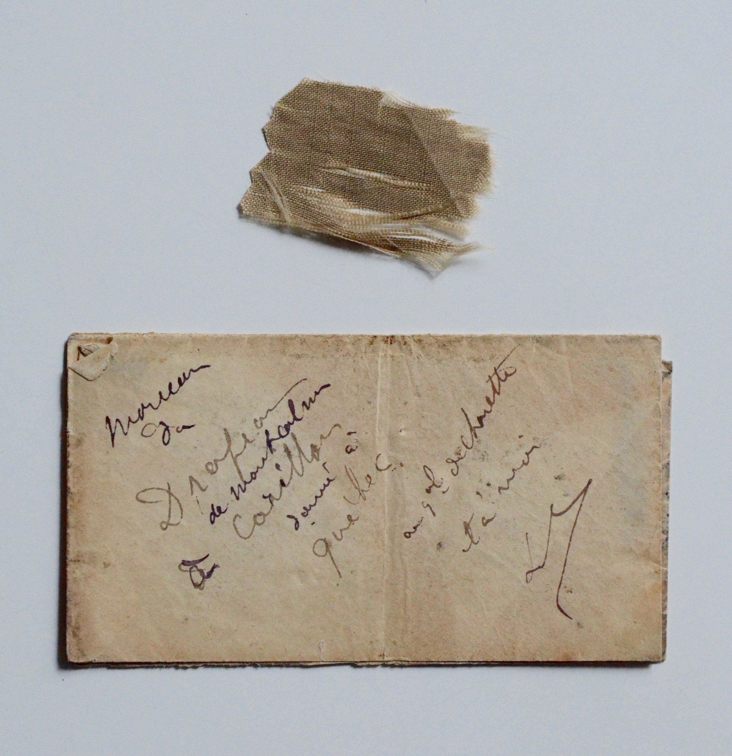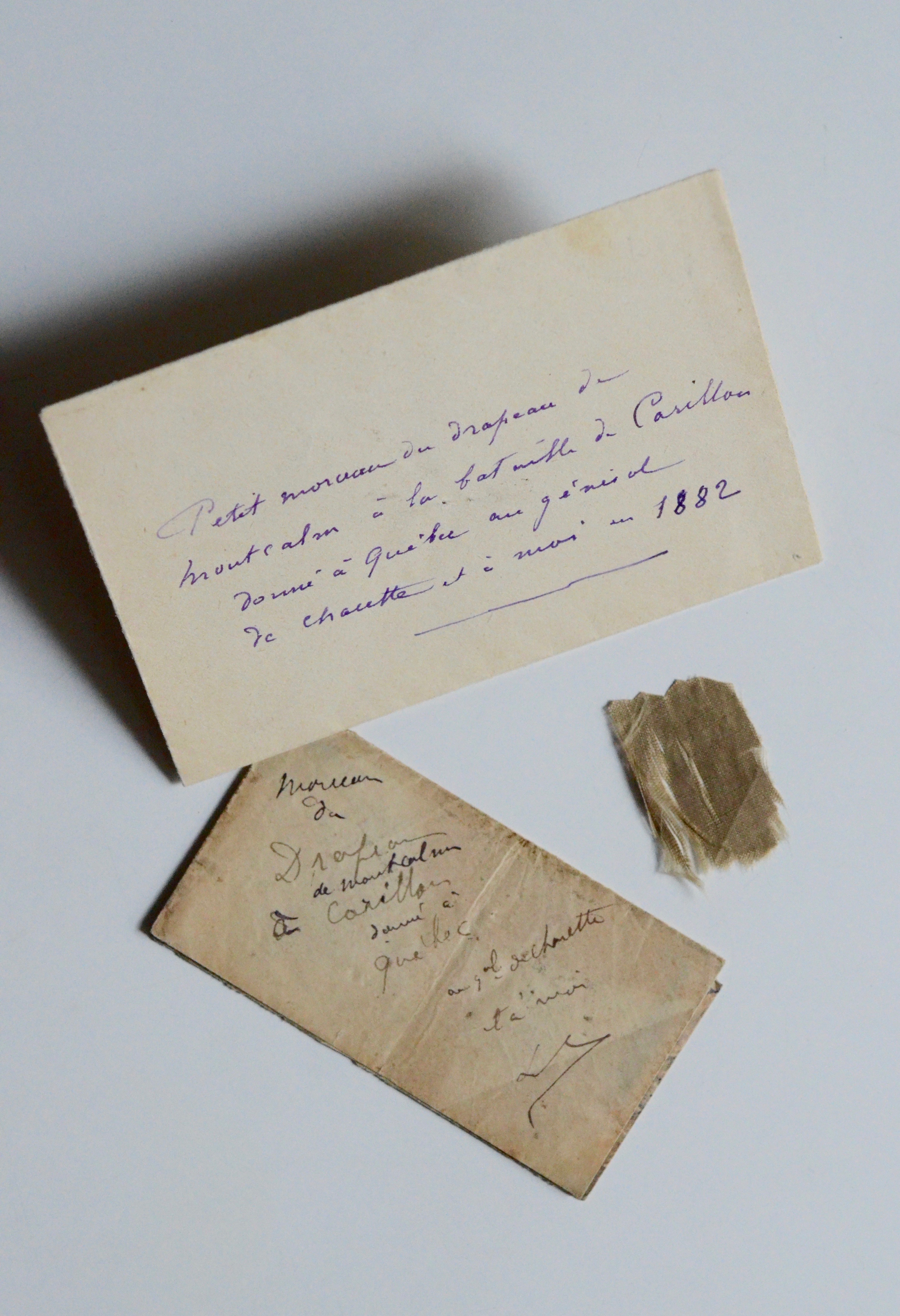 Tissus de soie mesurant 30 x 20 mm, conservé dans une enveloppe fragile. Cette dernière porte la note manuscrite paraphée d’un membre de la famille La Rochefoucauld : "Morceau du drapeau de Montcalm à Carillon, donné à Québec au gal de Charette et à moi. LR". [Le général Athanase de Charette de La Contrie (1832-1911) vint au Québec pour recruter des Zouaves et une grands fresque le représente à la cathédrale Marie-Reine du monde à Montréal].