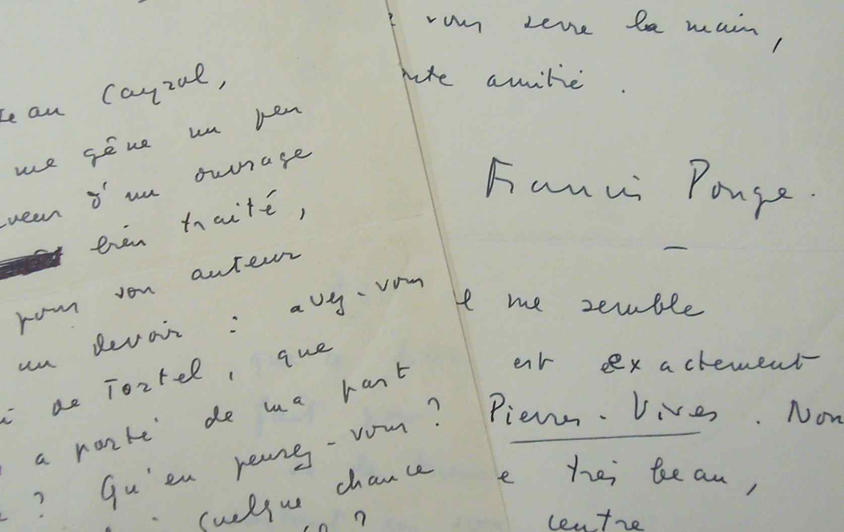 Francis Ponge (Montpellier, 1899/1988)Francis Ponge intervient auprès de Jean Cayrol pour faire éditer aux éditions du Seuil, le poète avignonnais Jean Tortel (1904/1993). "Bien qu'il me gêne un peu d'insister en faveur d'un ouvrage où je suis bien traité, mon amitié pour son auteur m'en fait un devoir : avez-vous lu l'Essai de Tortel, que Sollers vous a apporté de ma part en décembre? Qu'en pensez-vous? Y a-t-il pour lui quelque chance d'être publié par le Seuil? Notre ami étouffe en province. Il m'interrogeait récemment encore à ce propos. Je ne puis trop le faire attendre, vous comprenez. Bref, un mot me ferait plaisir. Merci. Je me réjouis que nous devions voisiner désormais dans TEL QUEL [...]. Il me semble que ce livre est exactement fait pour Pierres-Vives. Non? Je le trouve très beau, surtout en son centre. (Et, bien sûr, Tortel pourrait réduire à volonté le volume de la seconde partie, en ôtant tel ou tel article, selon vos conseils.) [Sa démarche échouera ; Tortel sera édité par Gallimard, Flammarion, et d'autres éditeurs, mais pas au Seuil].