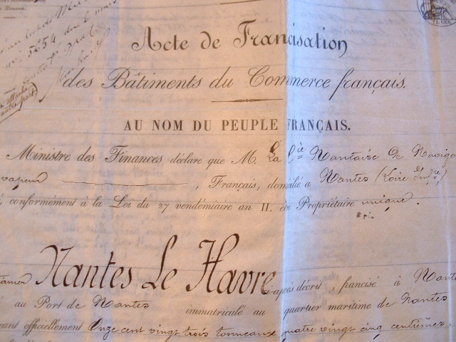 Acte de francisation du steamer Nantes Le Havre, de la Compagnie nantaise de navigation à vapeur, de 73 mètres, jaugeant 1437 tonneaux, construit à Nantes et attaché à ce port. Signé par le ministre des Finances.