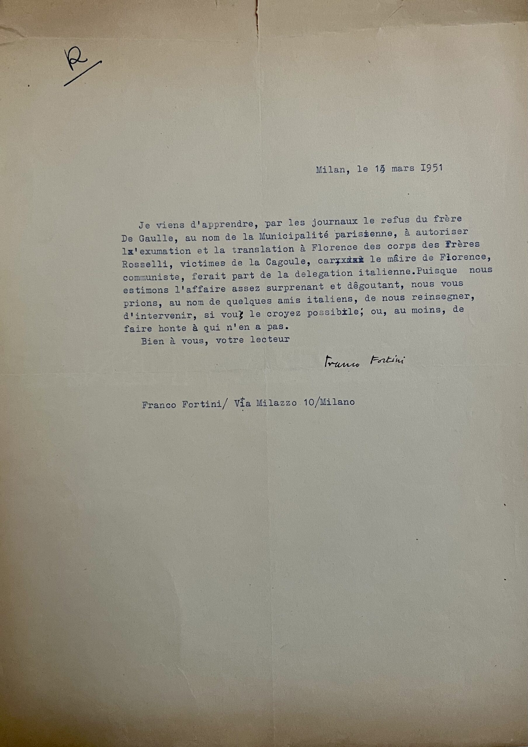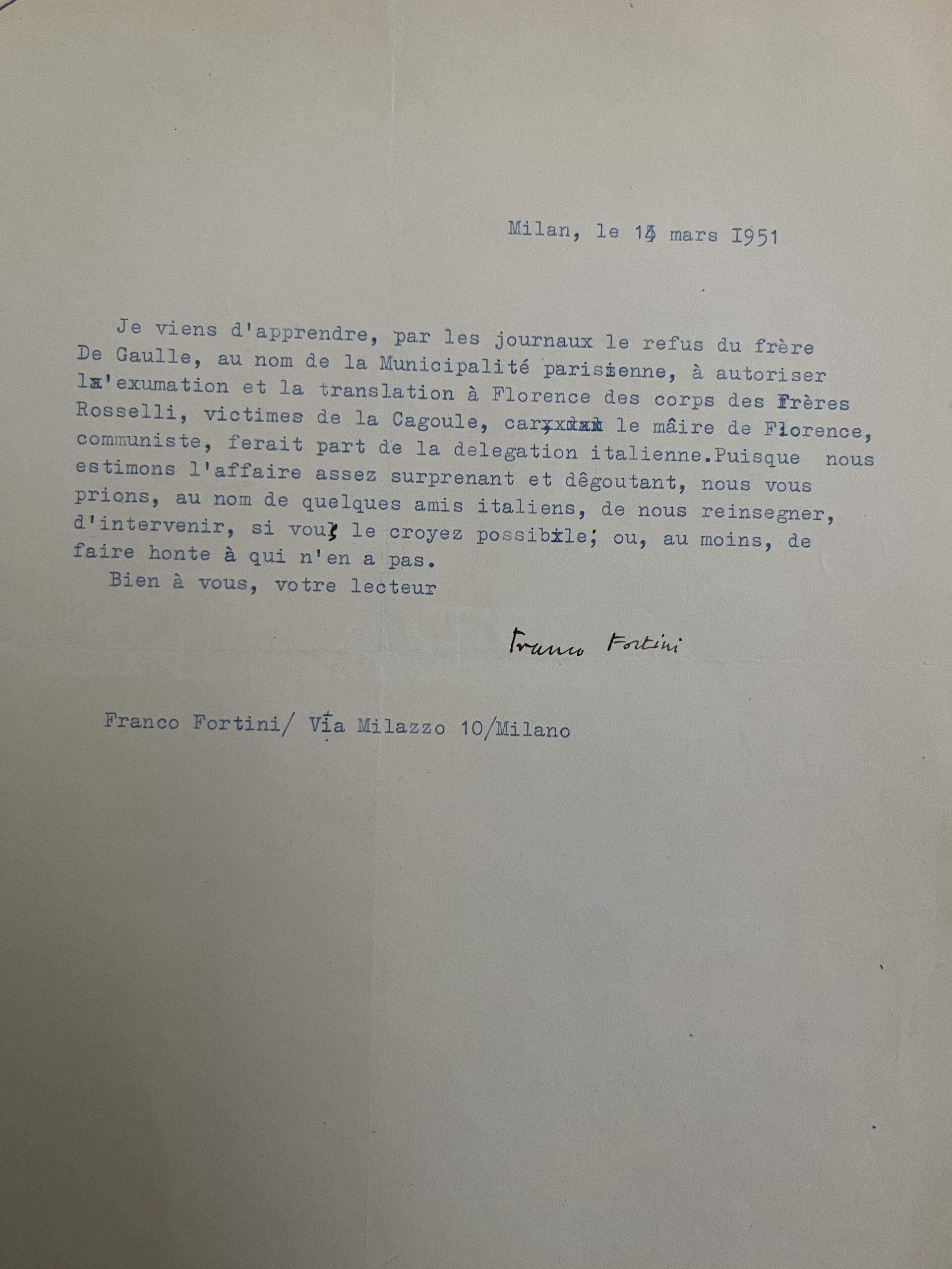 "Je viens d'apprendre, par les journaux le refus du frère De Gaulle, au nom de la Municipalité parisienne, à autoriser l'exumation et la translation à Florence des corps des Frères Rosselli, victimes de la Cagoule, car le maire de Florence, communiste, ferait part de la délégation italienne. Puisque nous estimons l'affaire assez surprenant et dêgoutant, nous vous prions, au nom de quelques amis italiens, de nous reinsegner, d'intervenir, si vous le croyez possible ; ou, au moins, de faire honte à qui n'en a pas".
