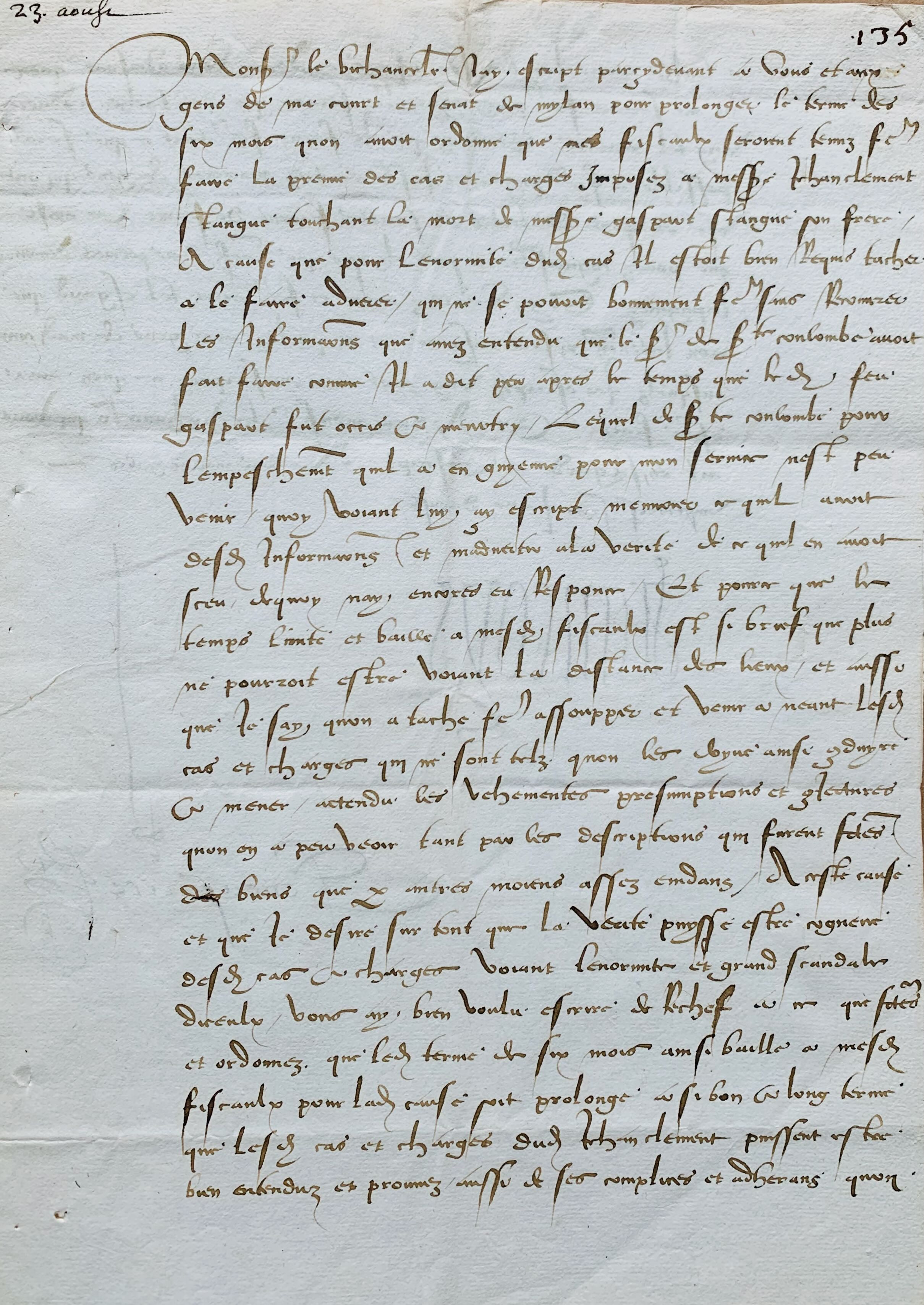 "[...] Les informations que avez entendu que le Sr de Sainte Coulombe avoit fait faire comme il a dit peu après le temps que ledit feu Gaspart fut occis et meurtry lequel dit Ste Coulombe pour l'empeschement qu'il a en Guyenne pour mon. service nest peu venir . Quoi voient lui ay escript mémoire ce qu'il avoit dessus informations et m'avertir à la vérité de ce qu'il en avoit sceu [...]. A ceste cause et que je désire surtout que la verité puysse estre cogneue desdicts cas & charges, volant l'énormité et grand scandale d'iceulx [...]. On ne me saurait faire plus agréable service que de tacher à adhérer une tel meurtre. Et croiez que je feray faire tout ce que sera possible a faire pugnir et justicier telz manieres de gens qui ont usé et usent de telles et semblables façons de faire, car ainsi que povez cognoistre, ce sont choses que Nostre Seigneur ne permet demourer impugniez... ».
