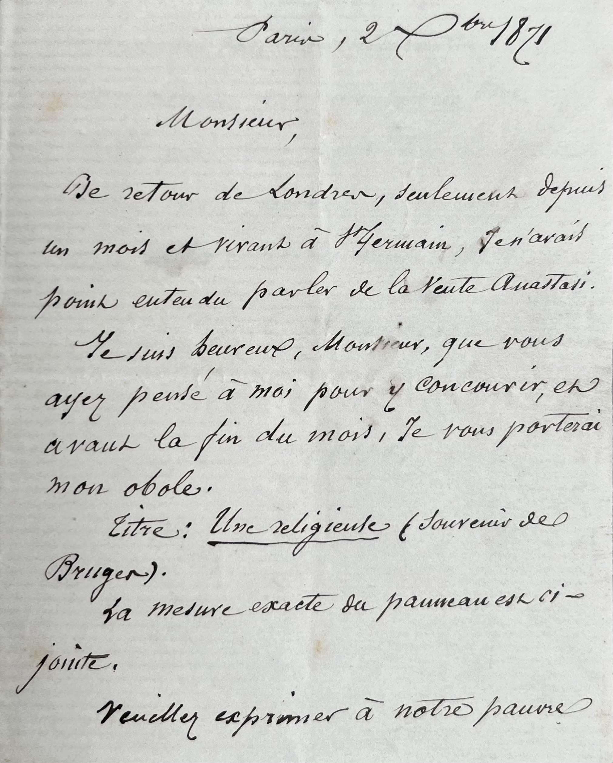 "Je suis heureux, Monsieur, que vous ayez pensé à moi pour y concourir, et avant la fin du mois, je vous porterai mon obole. Titre : Une religieuse (souvenir de Bruges). [...] Veuillez exprimer à notre pauvre camarade tous les sentiments de compassion que m'inspire son état, qui sera peut-être le mien avant peu, hélas ! [...] ».