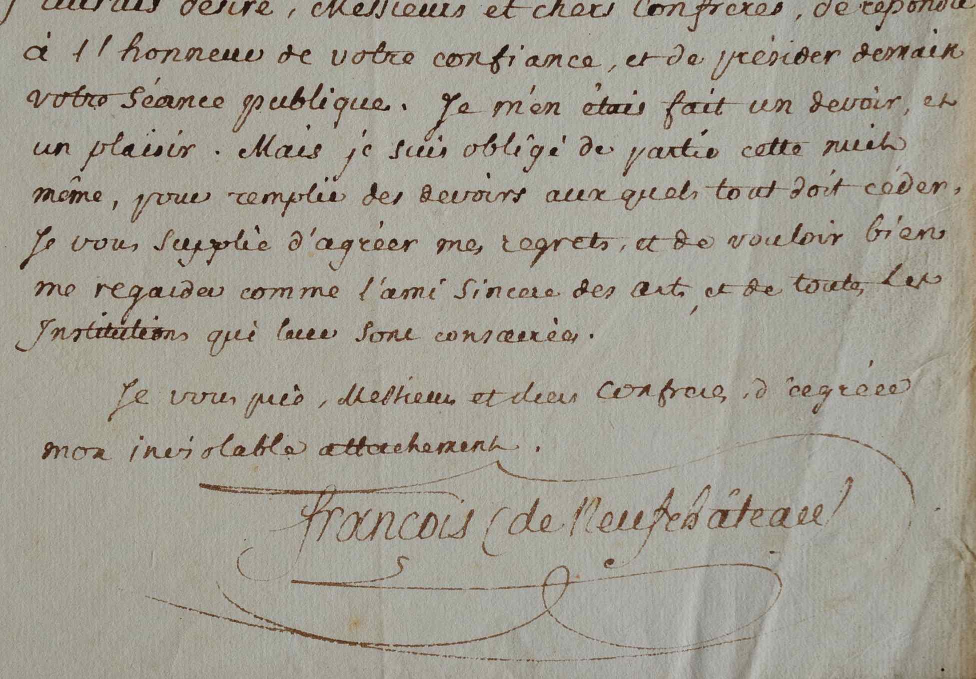 François de Neufchâteau annonce qu'il ne pourra pas présider la prochaine séance de l'Athénée des Arts : «J'aurais désiré, Messieurs et chers confrères, de répondre à l'honneur de votre confiance et de présider demain votre séance publique. Je m'en étais fait un devoir et un plaisir. Mais je suis obligé de partir cette nuit même, pour remplir des devoirs auxquels tout doit céder.» L'Athénée, société savante proposant des cours de sciences et techniques, donna naissance à l'École centrale Paris.