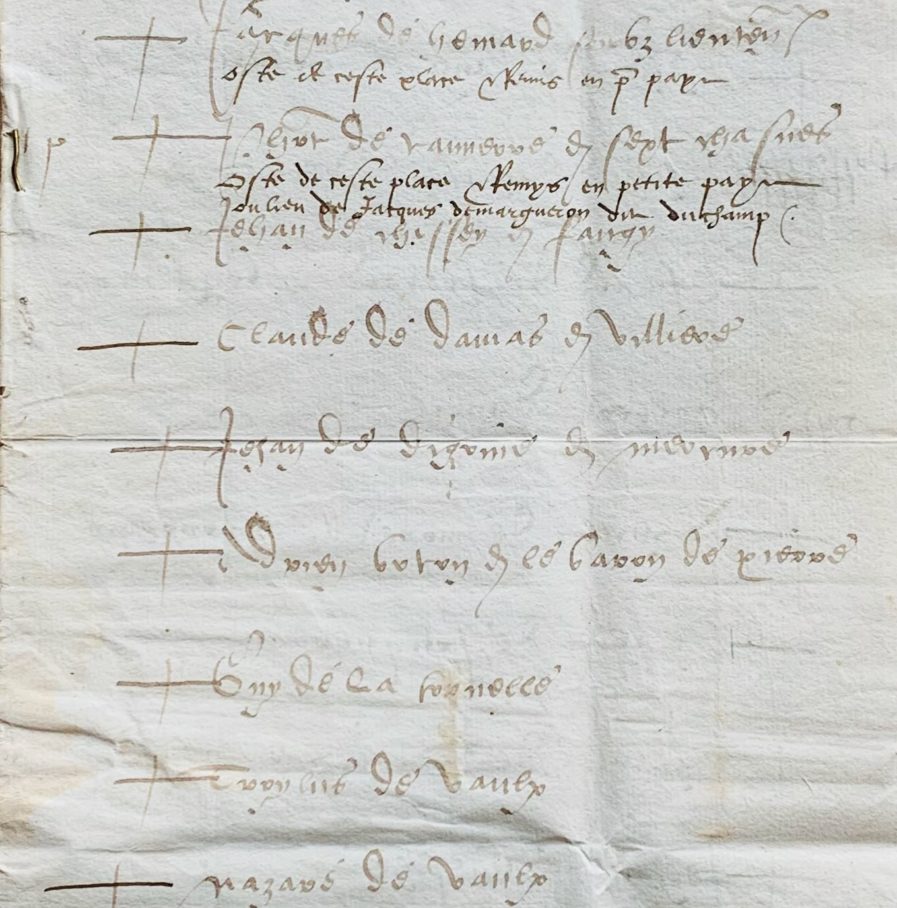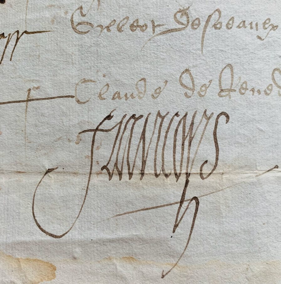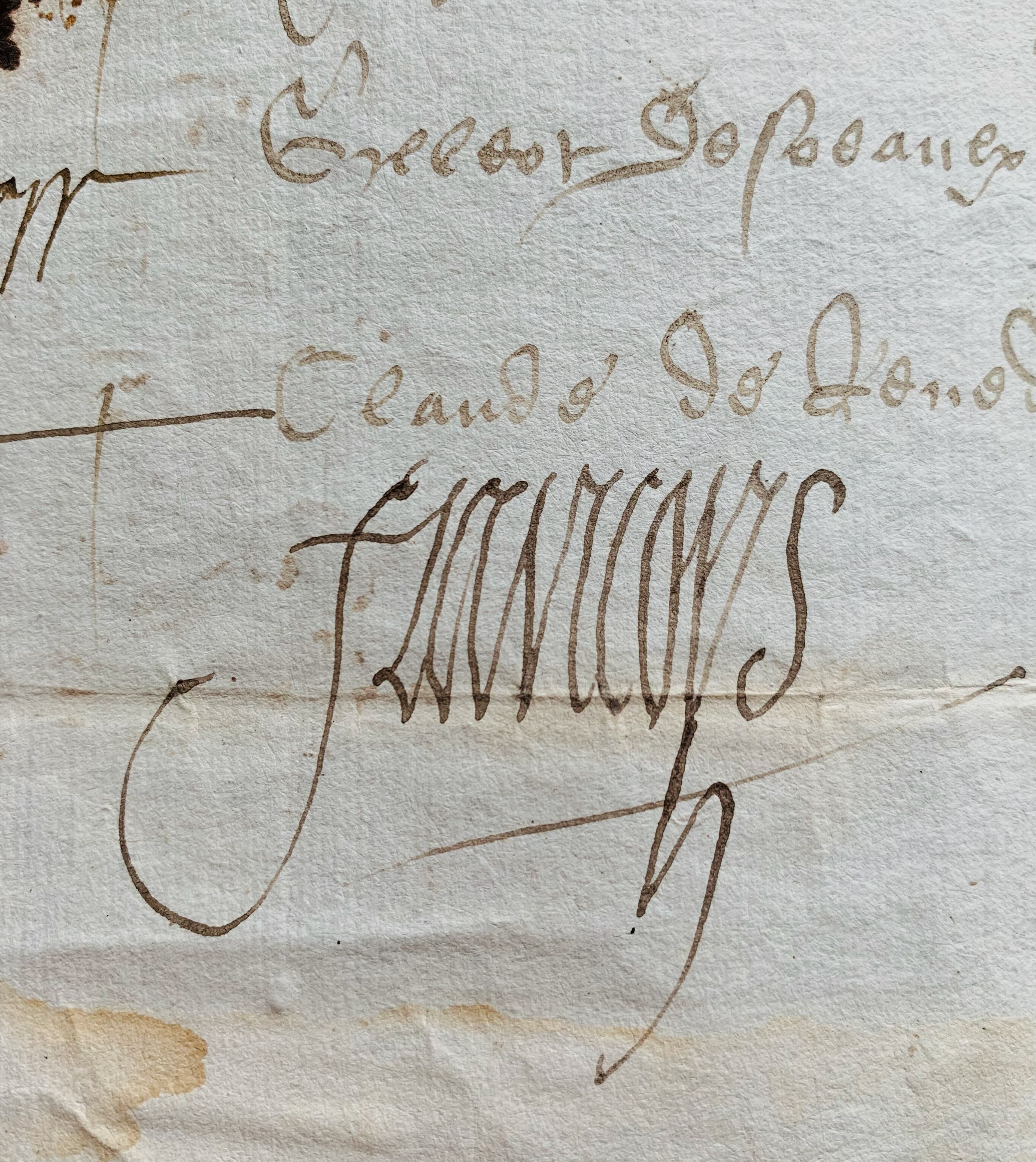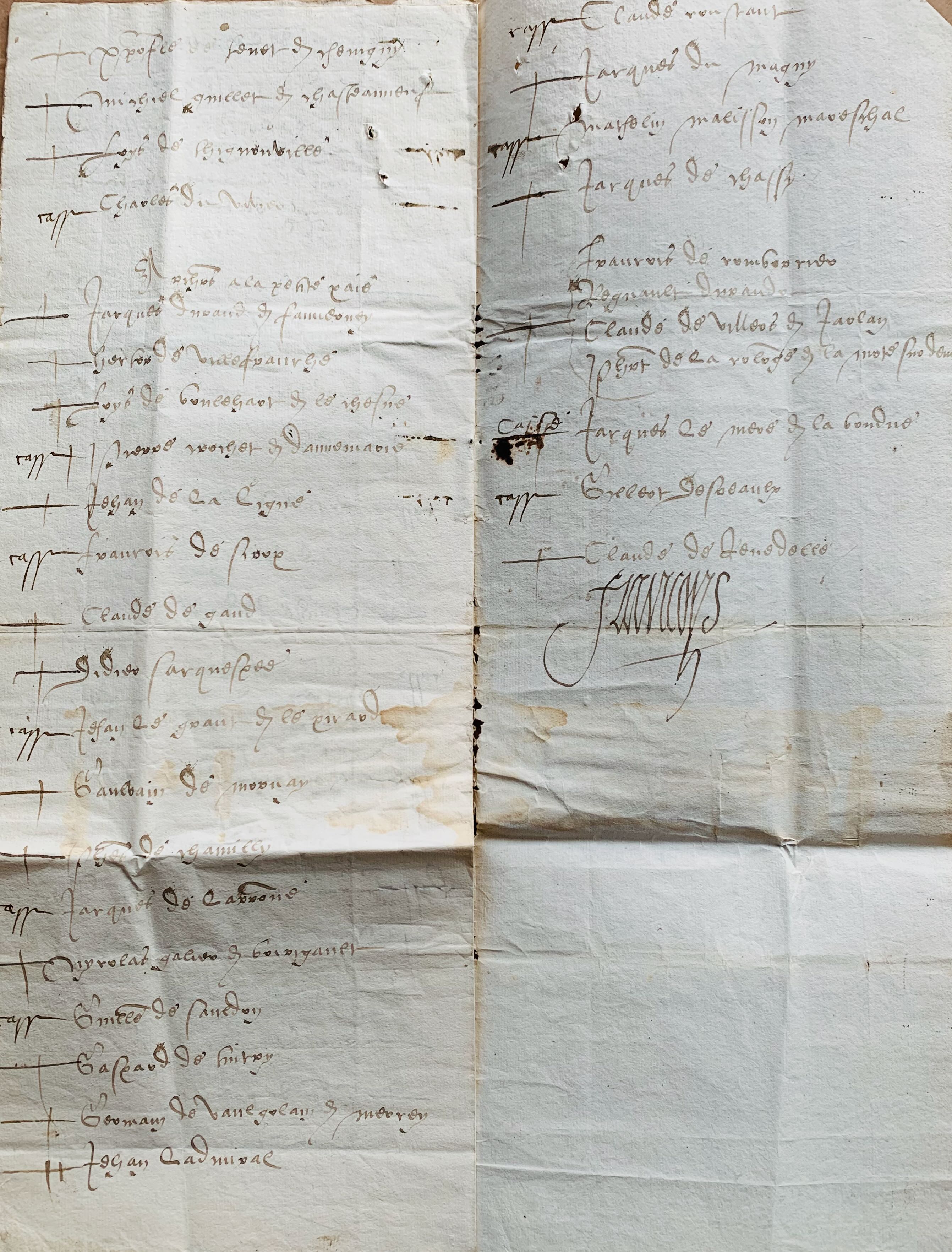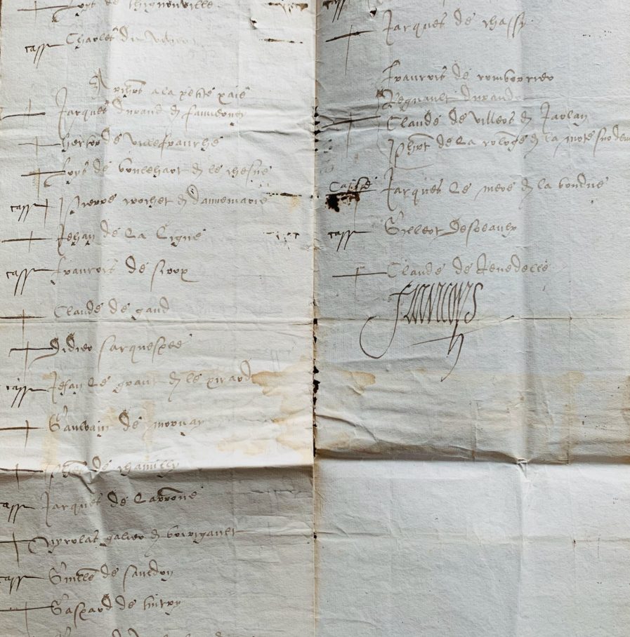 François d'Orléans-Longueville (Chateaudun, 1513/1548)Rolle de la compagnie du marquis de Rothelin, réalisé en 1543, signé par lui.