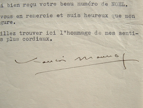 François Mauriac accuse réception du numéro de Noël de Plaisir de France. «Je vous en remercie et suis heureux que mon nom y figure».