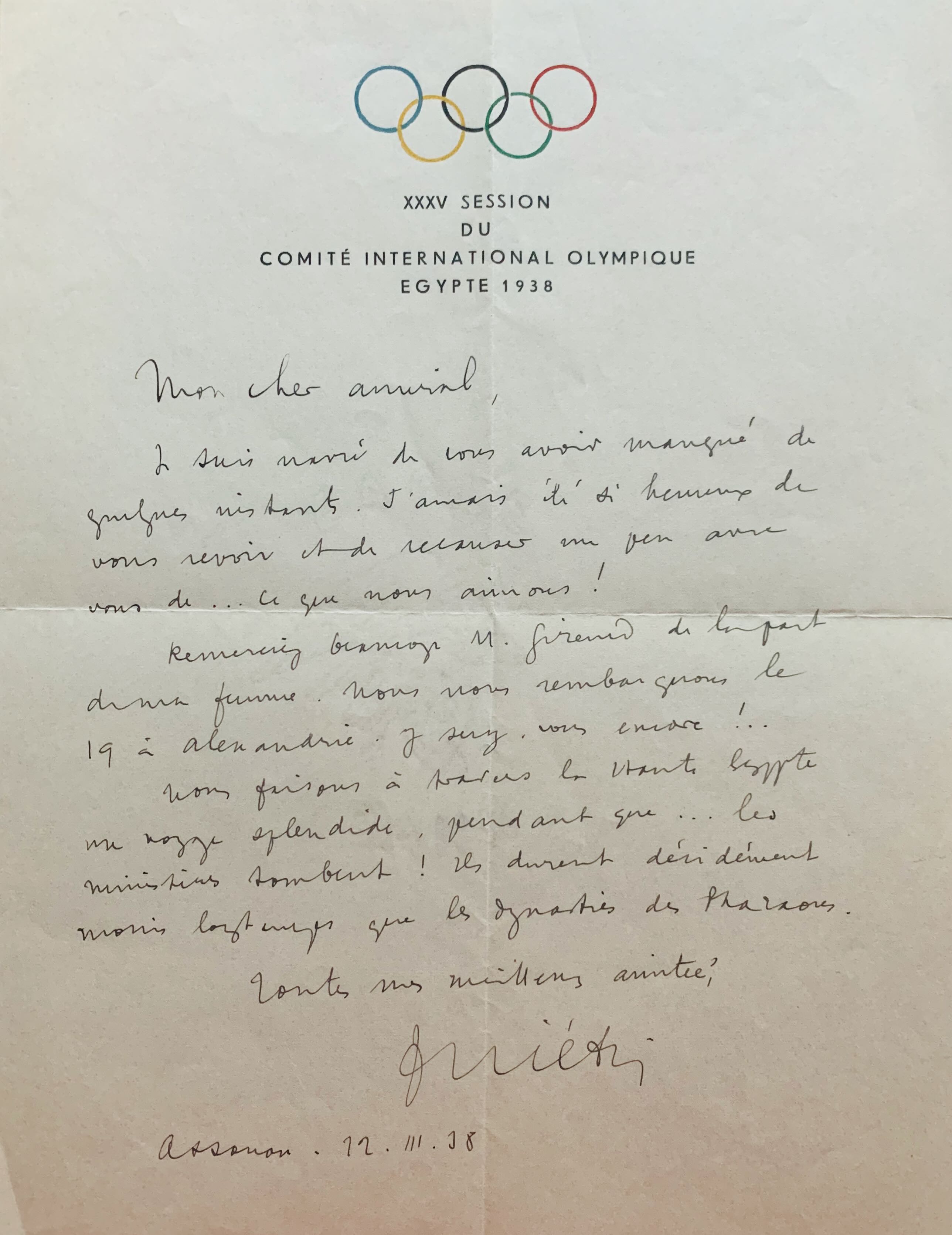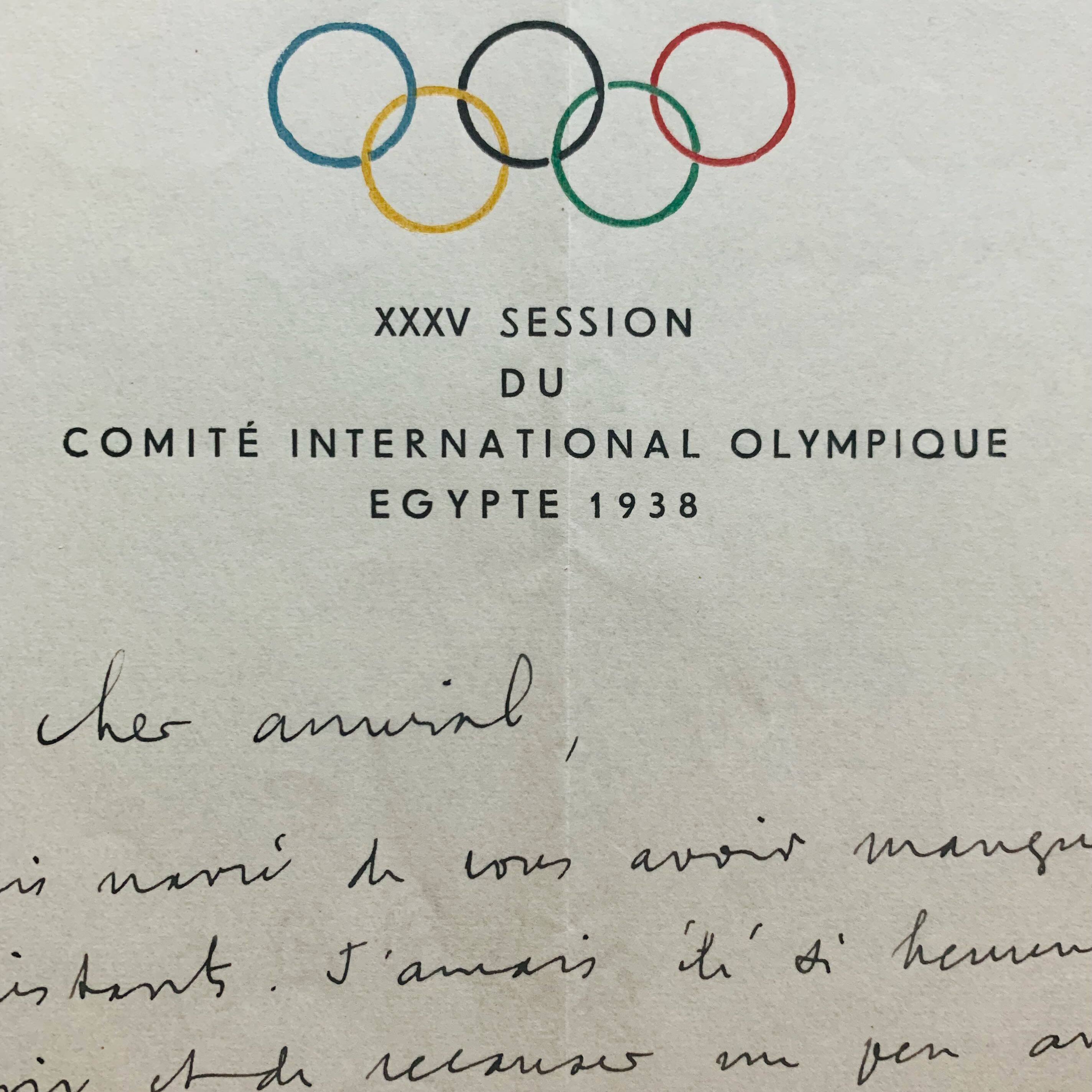 Lettre avec bel en-tête aux anneaux en couleurs "XXXV session du Comité International Olympique Egypte 1938", écrite d'Assouan par François Piétri.