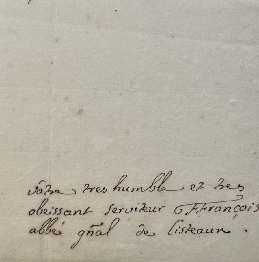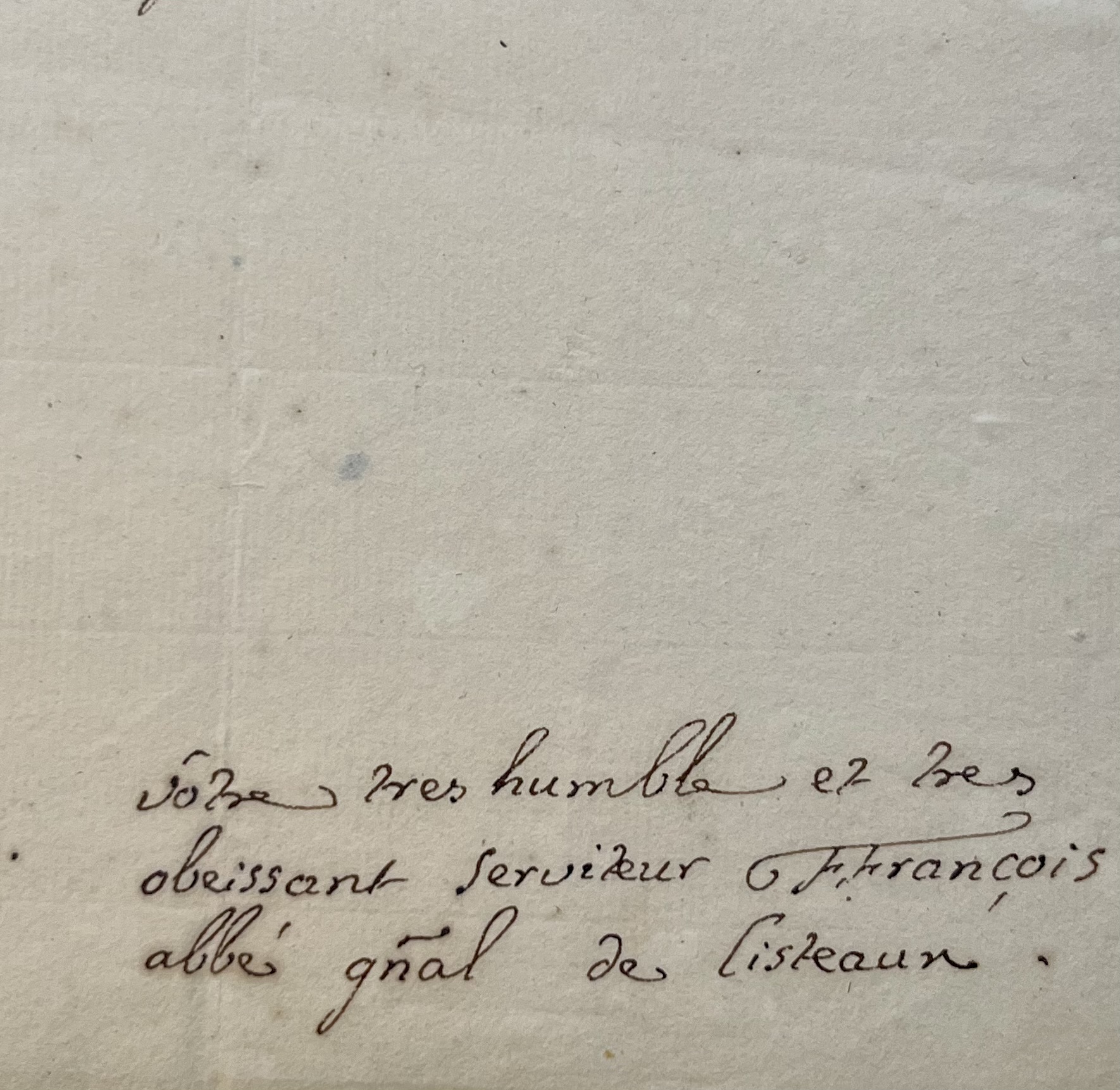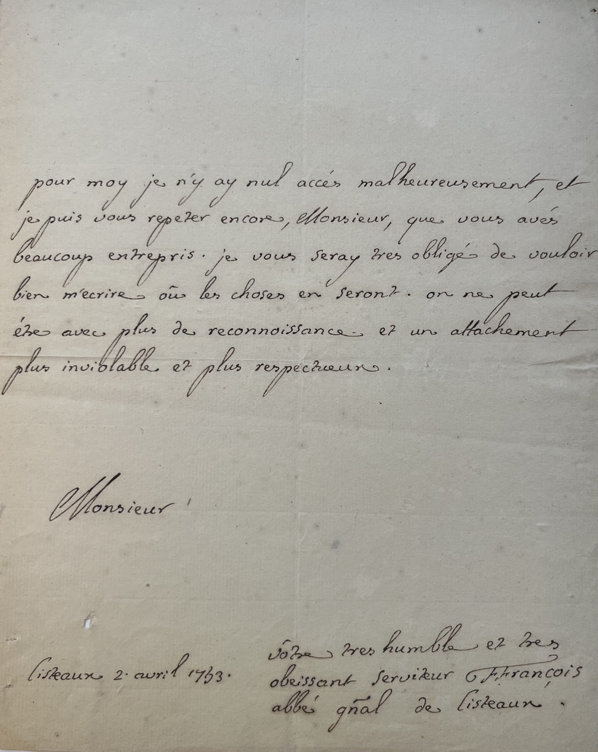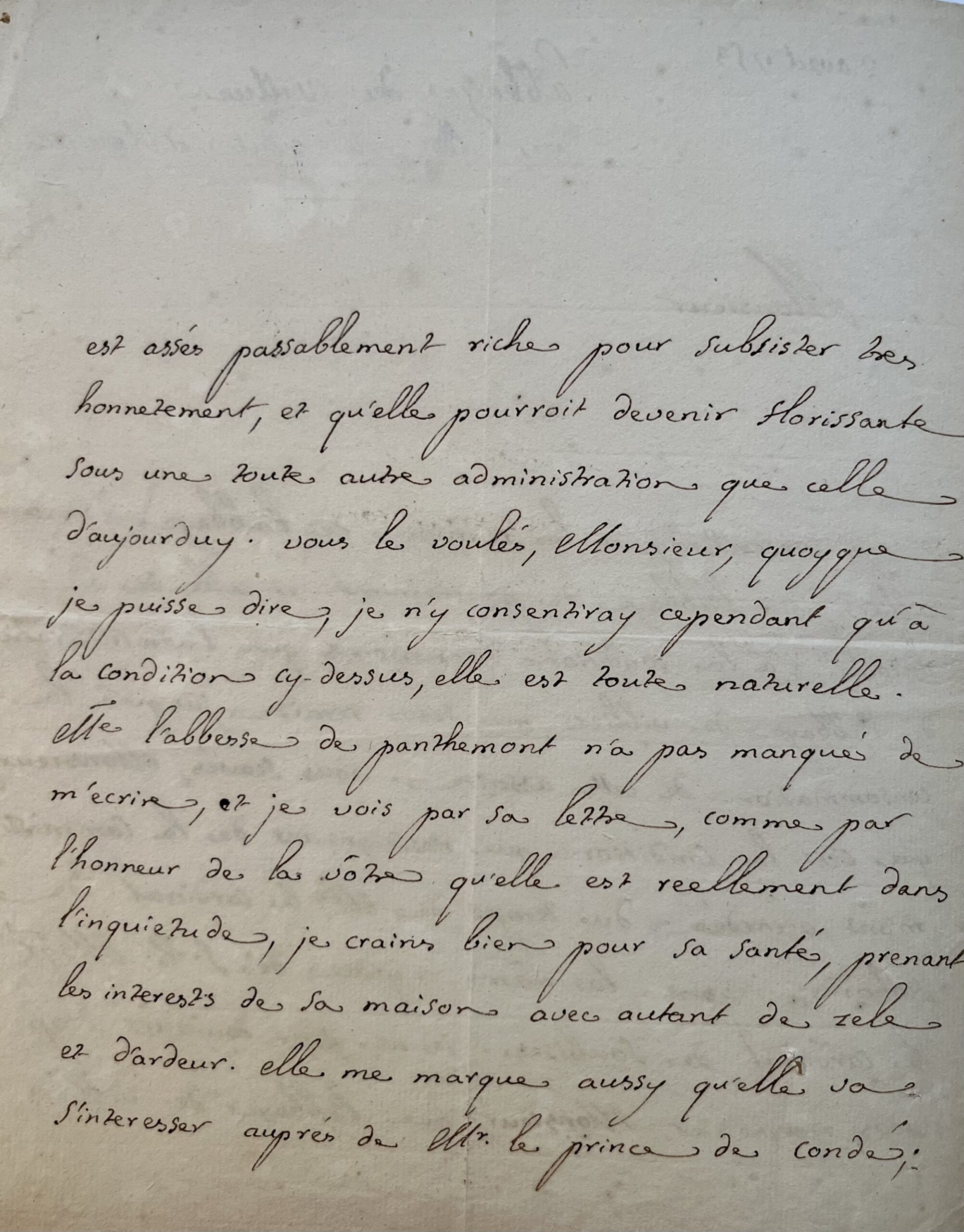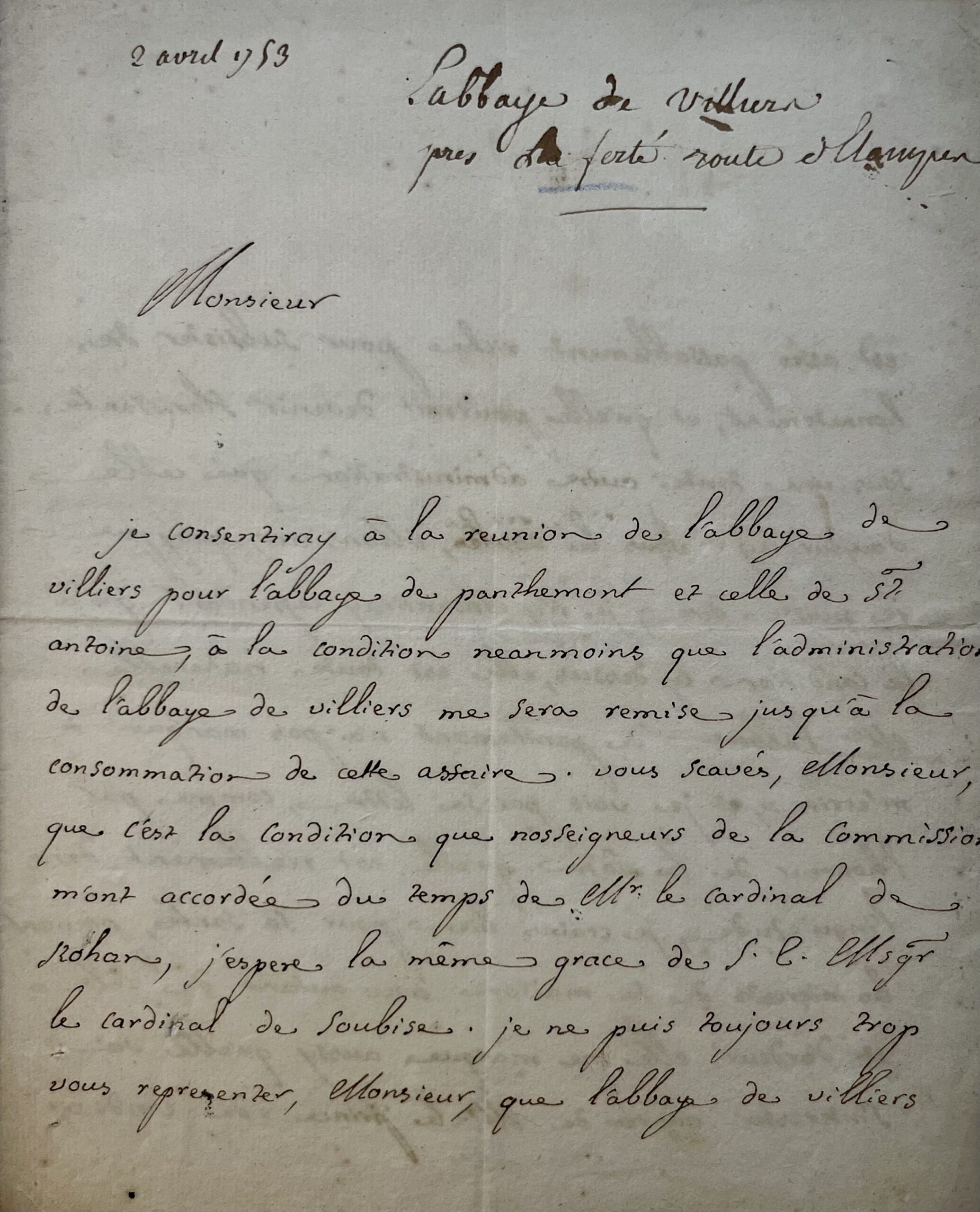 "Je consentiray à la réunion de l'abbaye de Villiers pour l'abbaye de Panthemont et celle de St Antoine, à la condition néanmoins que l'administration de l'abbaye de Villiers me sera remise jusqu'à la consommation de cette affaire. Vous scavés, Monsieur, que c'est la condition que nosseigneurs de la commission m'ont accordée du temps de Mr le Cardinal de Rohan, j'espère la même grâce de S.E. Msgr le cardinal de Soubise. Je ne puis toujours trop vous représenter, Monsieur, que l'abbaye de Villiers est assés passablement riche pour subsister tres honnetement, et qu'elle pourroit devenir florissante sous une toute autre administration que celle d'aujourd'hui [...] je n'y consentiray cependant qu'à la condition cy-dessus, elle est toute naturelle. Me l'abbesse de Panthemont [Marie-Catherine de Béthizy de Mézières, abbesse de Penthemont depuis 1743] n'a pas manqué de m'écrire, et je vois par sa lettre, comme par l'honneur de la vôtre qu'elle est réellement dans l'inquiétude, je crains bien pour sa santé, prenant les intérests de sa maison avec autant de zèle et d'ardeur. Elle me marque aussy qu'elle va s'intéresser aurpès de Mr le prince de Condé [...]". signée "F François abbé gnal de Cisteaux".