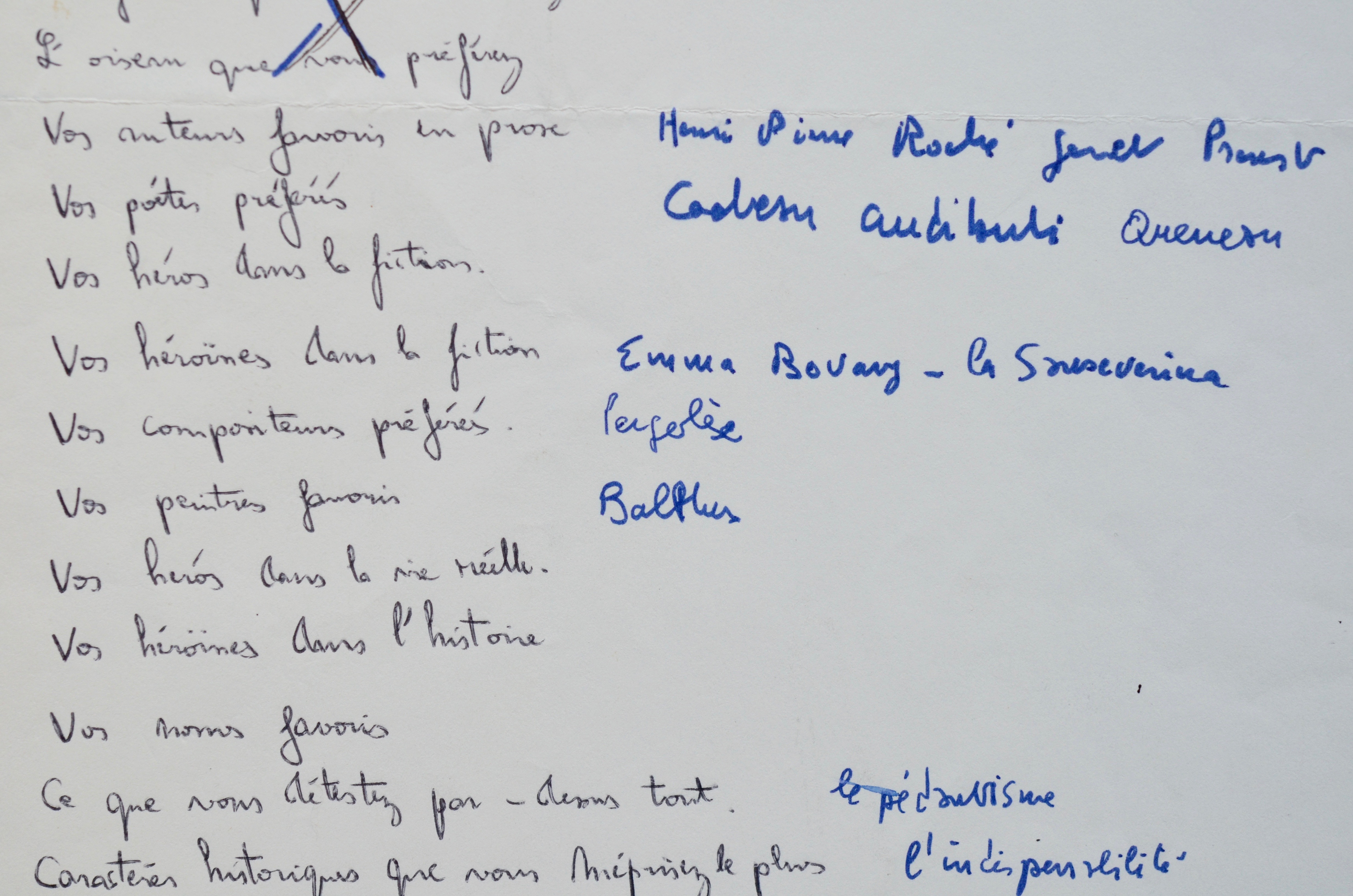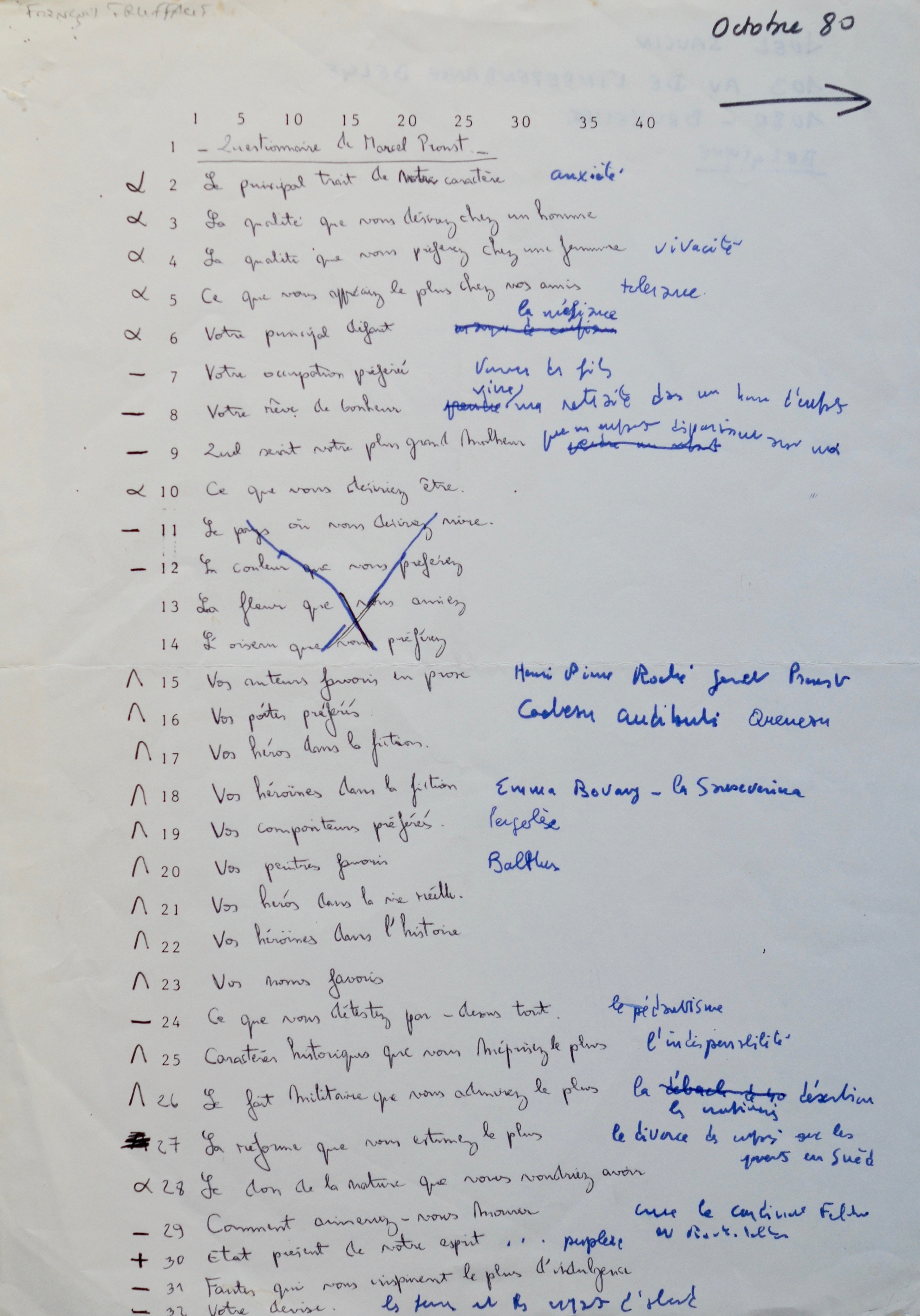 François Truffaut (Paris, 1932/1984)François Truffaut se prête à l’exercice du questionnaire de Proust. Les réponses sont de la main de Truffaut à l'encre bleue et les questions sont manuscrites au stylo noir (d'une autre main) :