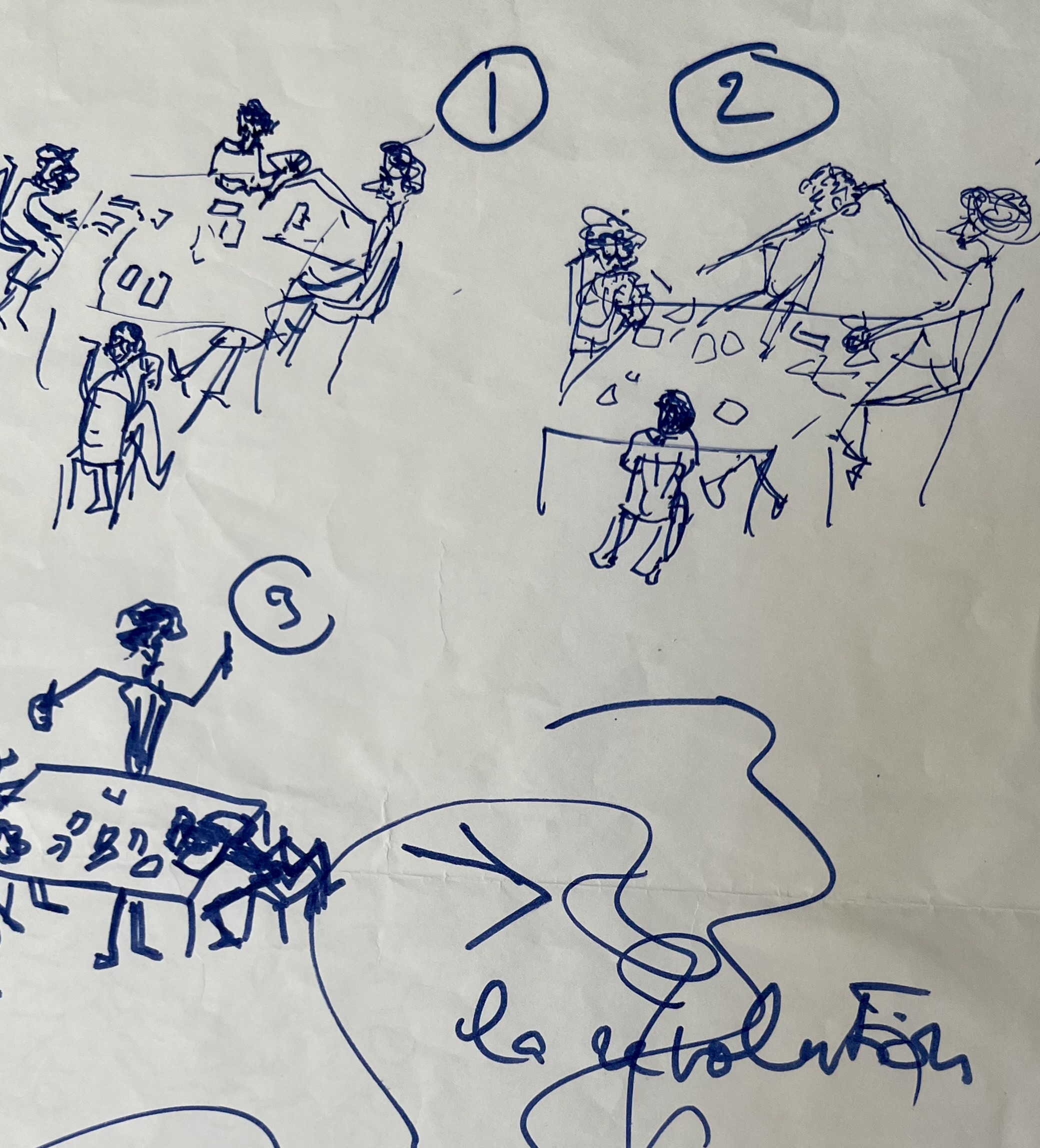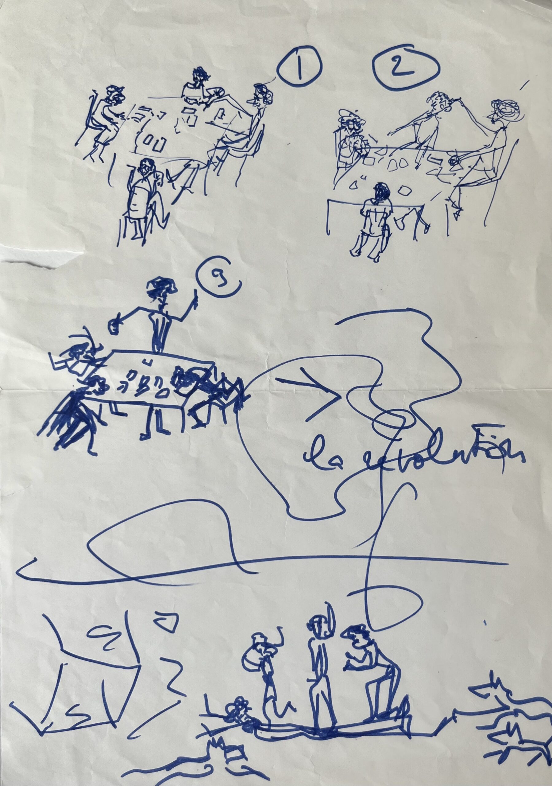 Dessins de la main de Françoise Sagan, sur un feuillet intitulé "Révolution". Plusieurs croquis de scènes figurant une réunion :