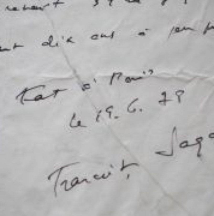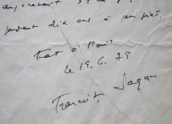 Françoise Sagan dresse un certificat de résidence pour son ami l'écrivain Bernard Franck (1929/2006), qu'elle héberge depuis dix ans. "Je soussignée Françoise [Quoirez] dite Sagan certifie [que mon]sieur Bernard Frank partage mon domicile 25 rue d'Alésia Paris 14è actuellement et le partageait anciennement 34 rue Guynemer pendant dix ans à peu près. Fait à Paris, le 19.6.75. Françoise Sagan". [Bernard Frank, très lié à Sagan, se décrivait lui-même comme un "parasite social" vivant chez les uns et les autres ; c'était un homme libre, amoureux fou de la littérature].