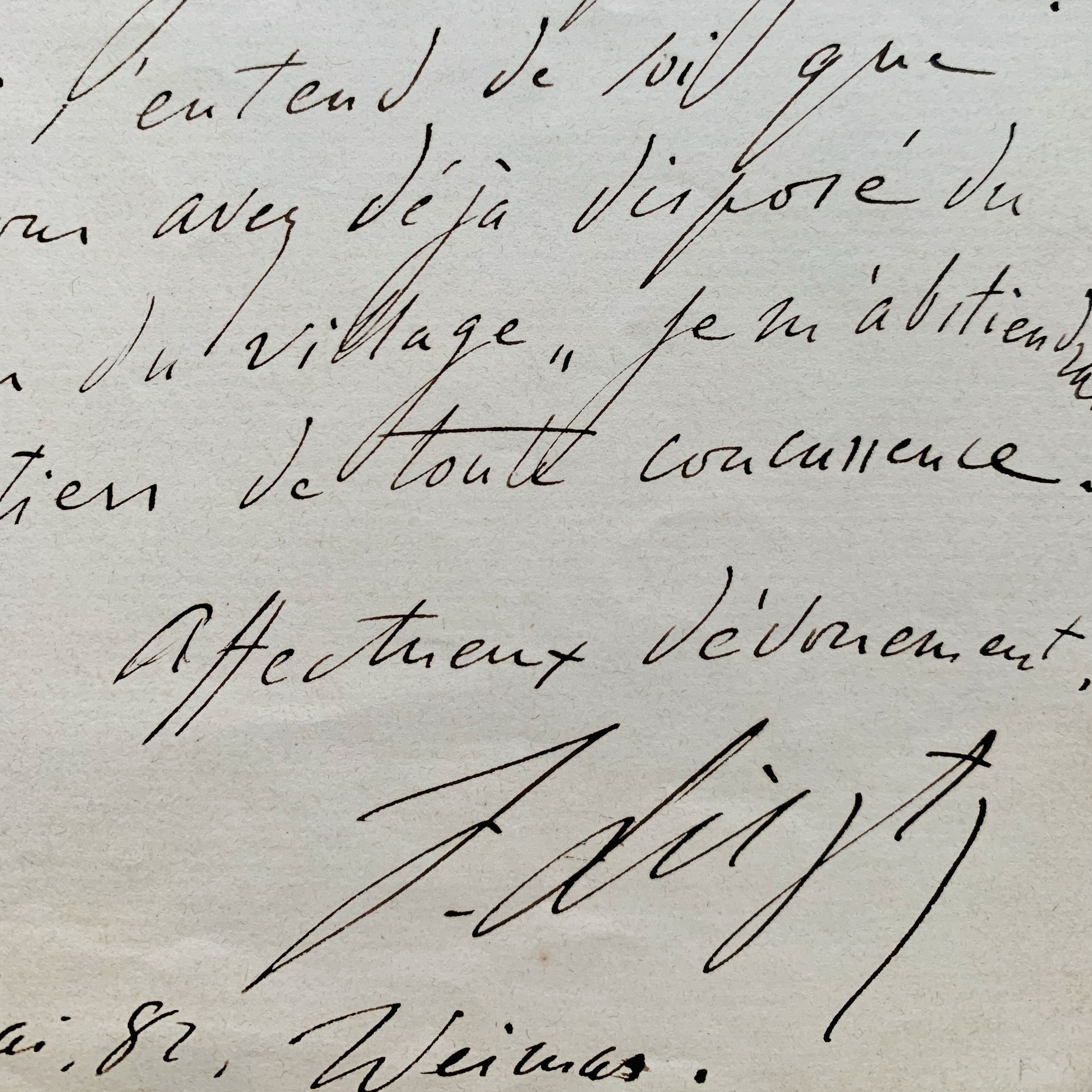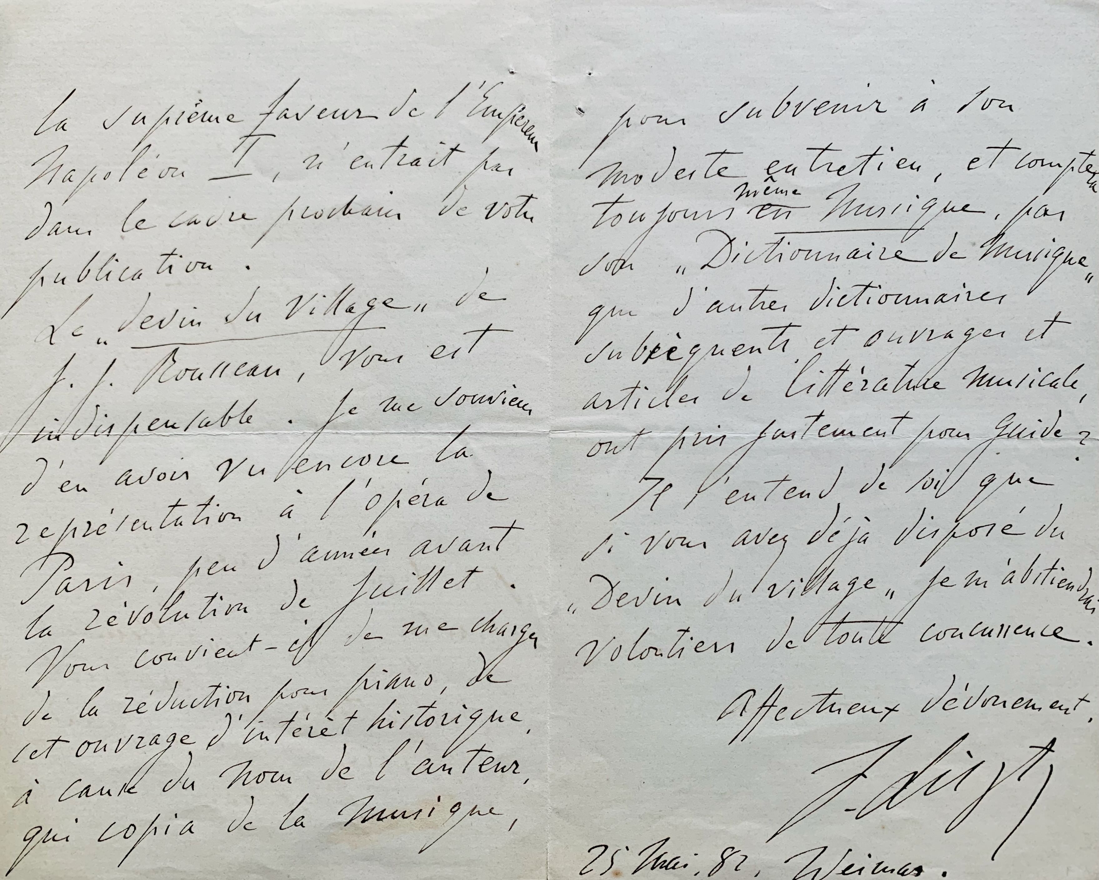 Franz Liszt (Raiding, 1811/1886)Belle lettre musicale de Franz Liszt évoquant ses maîtres Salieri et Paër et la réduction pour piano du Devin du village de Jean-Jacques Rousseau.