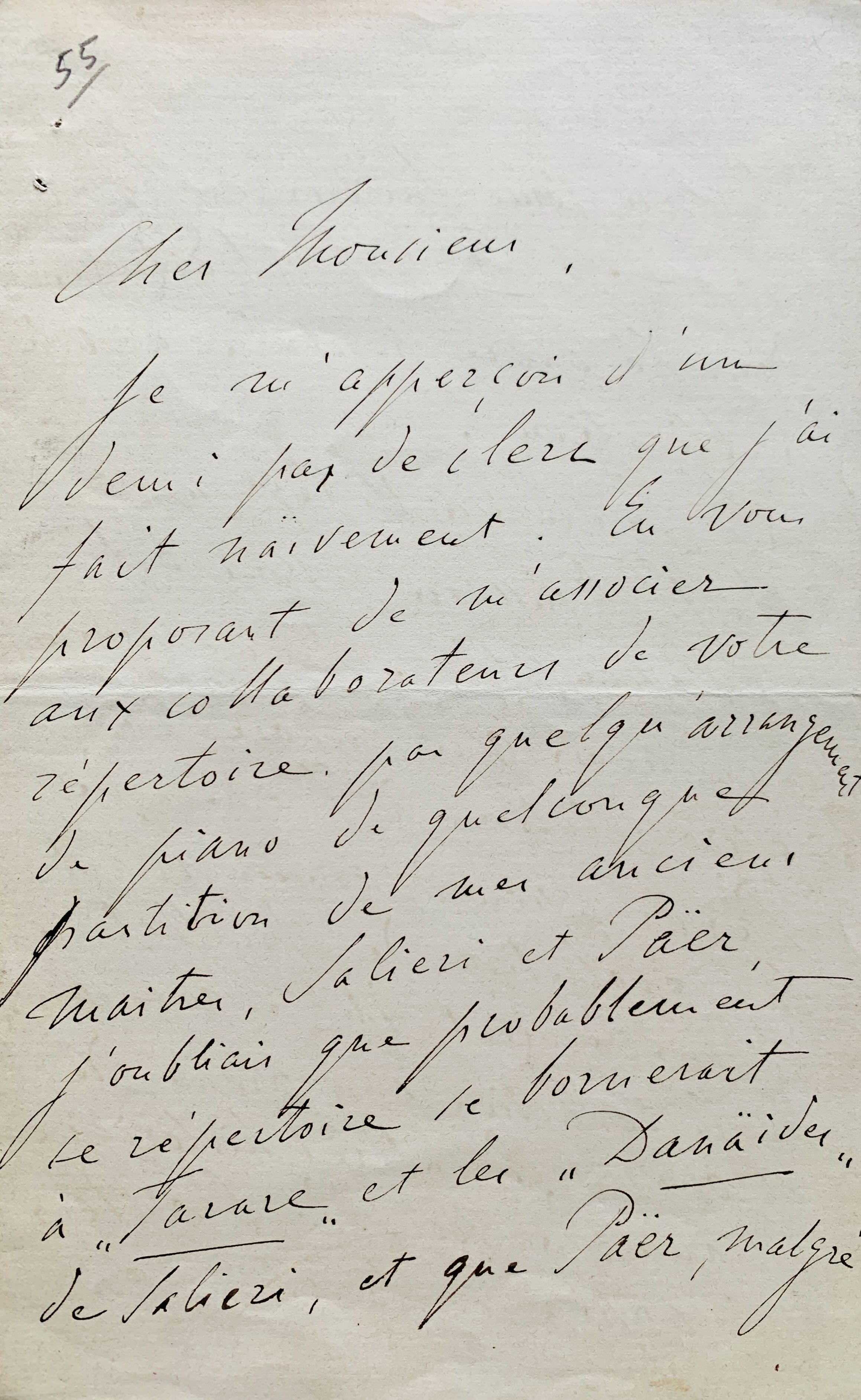 "Je m'aperçois d'un demi pas de clerc que j'ai fait naïvement. En vous proposant de m'associer aux collaborateurs de votre répertoire, par quelqu'arrangement de piano de quelconque partition de mes anciens maîtres, Salieri et Paër, j'oubliais que probablement ce répertoire se bornerait à "Tarare" et les "Danaïdes" de Salieri, et que Paër, malgré la suprême faveur de l'Empereur Napoléon I, n'entrait pas dans le cadre prochain de votre publication.