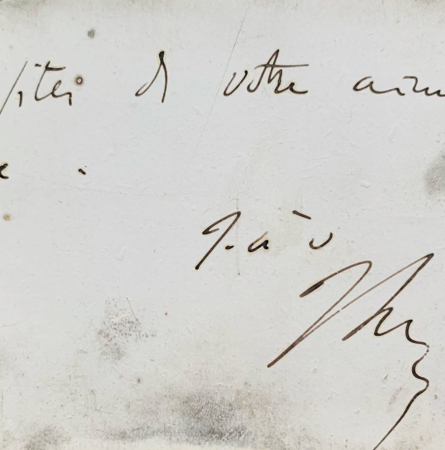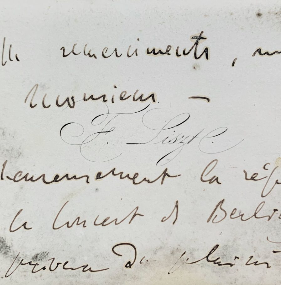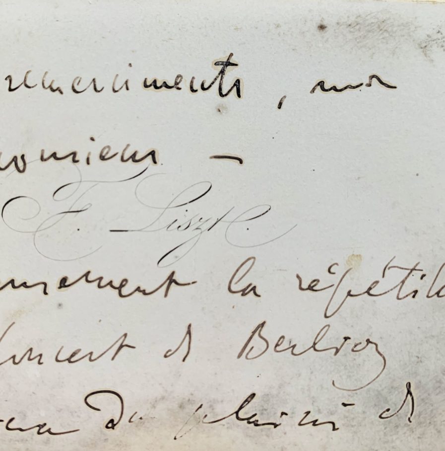 Sur sa carte de visite Franz Liszt a écrit ces quelques mots : "Mille remerciements, mon cher monsieur. Malheureusement la répétition pour le concert de Berlioz me privera du plaisir de profiter de votre aimable offre. T.à.v. FLiszt".