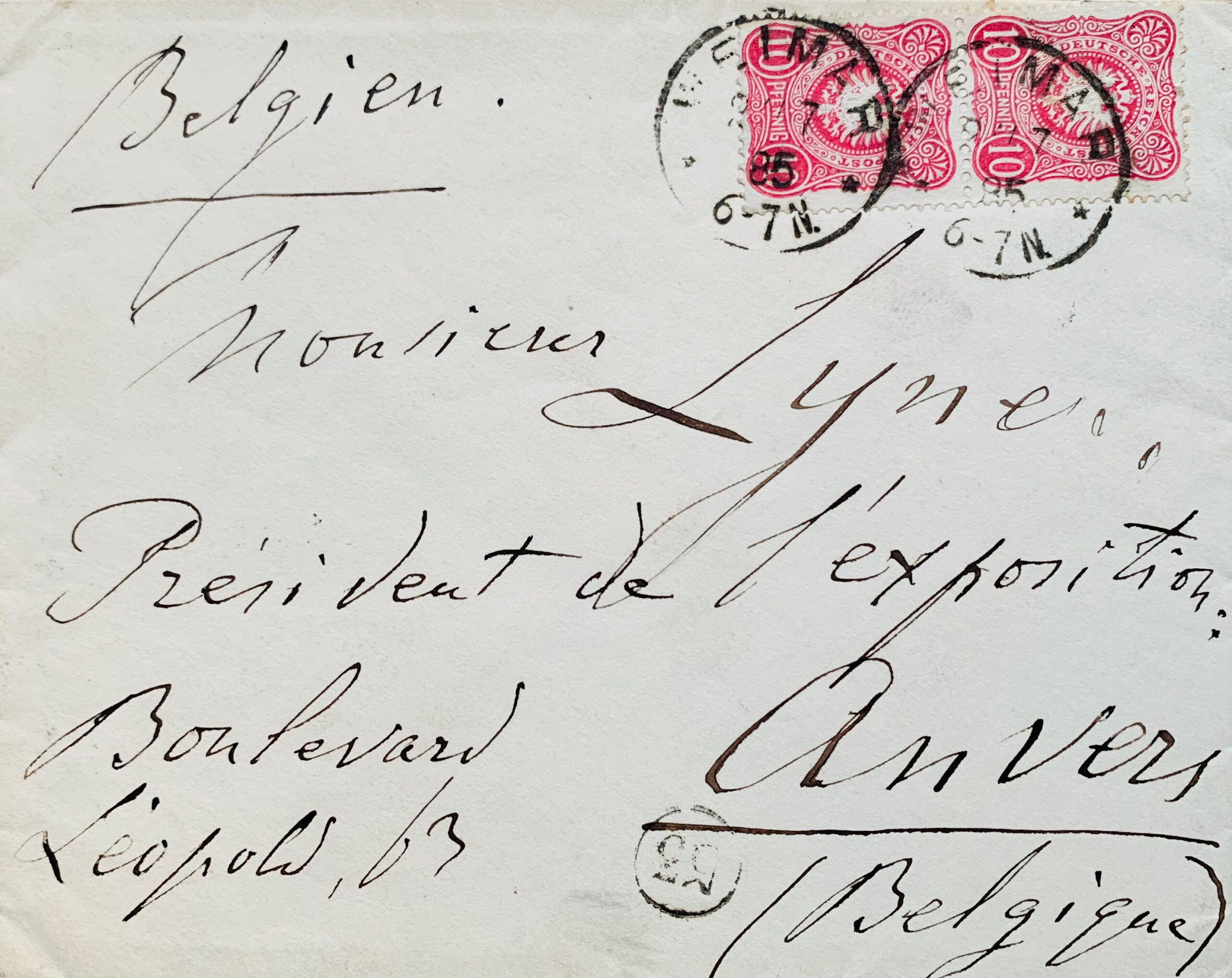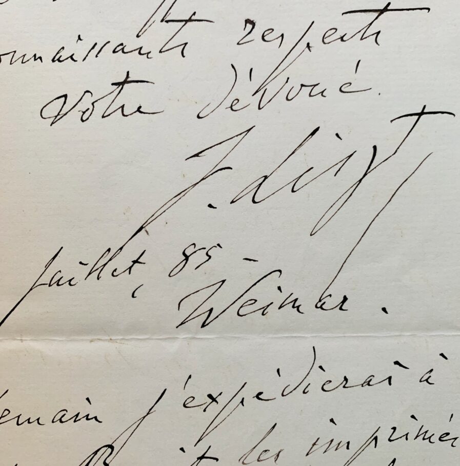 Franz Liszt (Raiding, 1811/1886)Jolie lettre de Franz Liszt, âgé, écrite après son séjour lors de l'exposition Universelle d'Anvers de 1885. Il en était l'invité d'honneur, et supervisa une série de concerts (certains dirigés par le chef d'orchestre Franz Servais) donnés dans le cadre du Congrès Musical International d'Anvers (intégré à l'Exposition Universelle). Il reçut un accueil triomphal. On le présenta à la reine des Belges ; le 8 juin, en l'église Saint-Joseph, il assista à l'exécution de sa Messe pour voix et orgue sous la direction de Peter Benoit. Victor Lynen et son épouse Marie, donnèrent pour l'occasion de grandes réceptions mondaines.