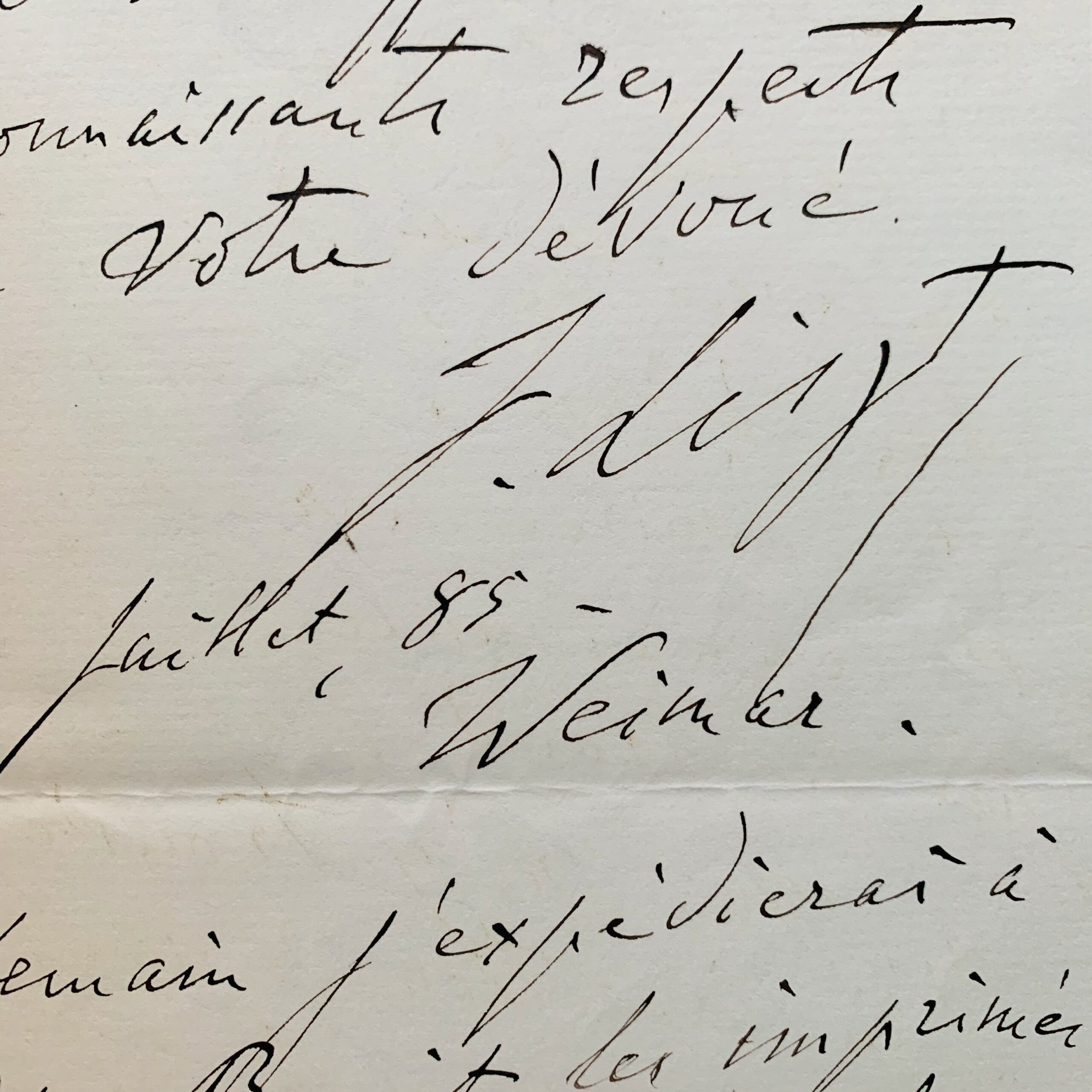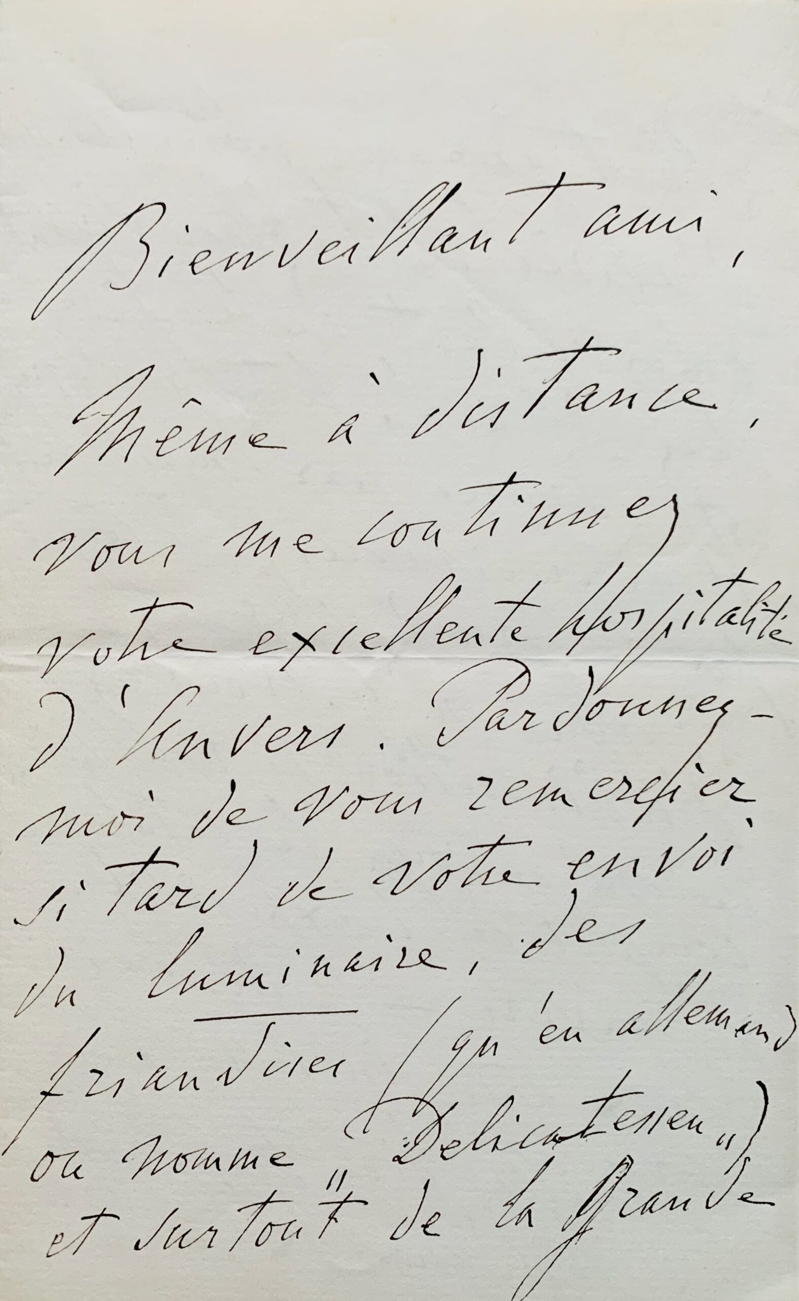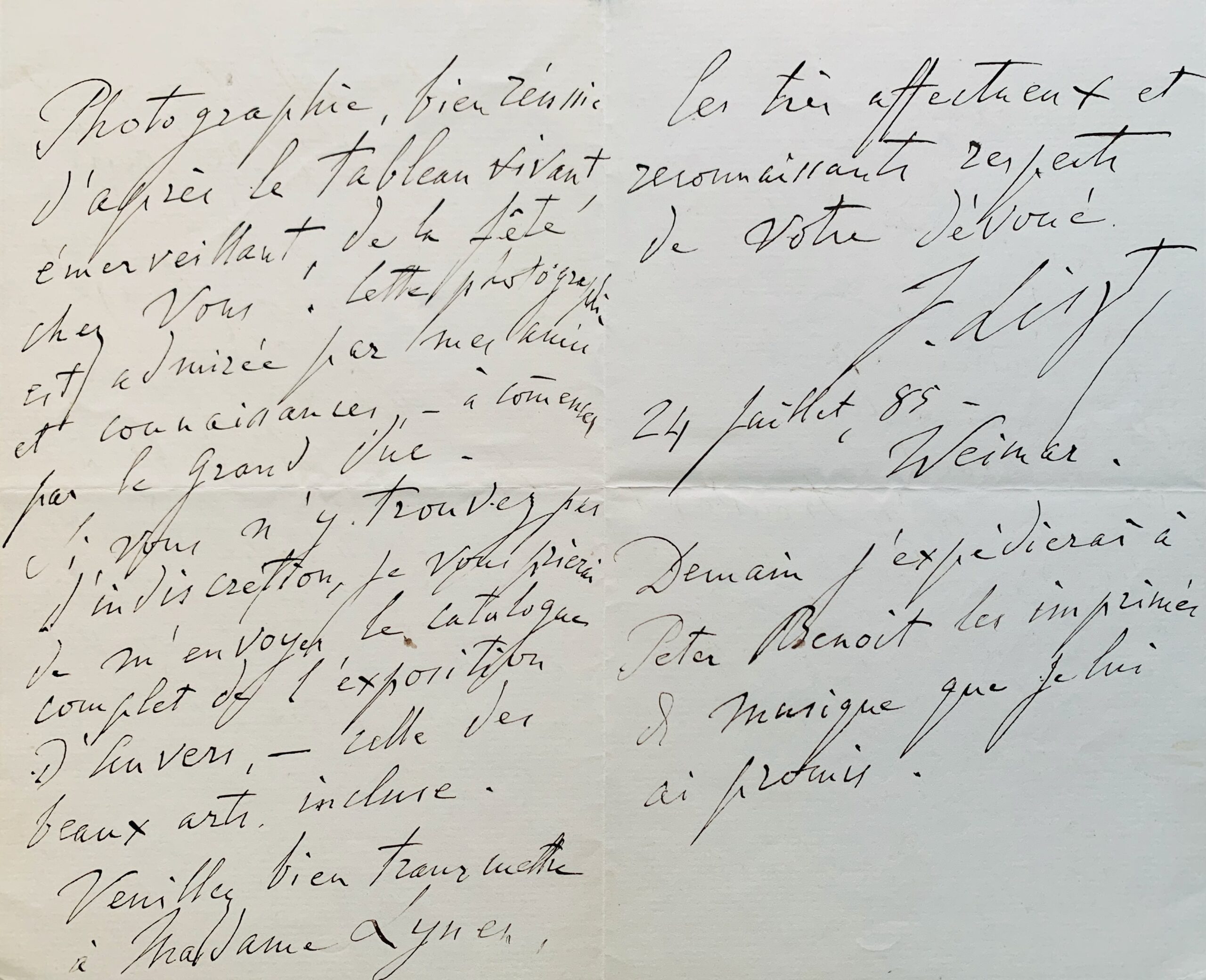 "Bienveillant ami, même à distance, vous me continuez votre excellente hospitalité d'Anvers. Pardonnez-moi de vous remercier si tard de votre envoi du Luminaire, des friandises (qu'en allemand on nomme "Delicatessen") et surtout de la grande photographie, bien réussie d'après la tableau vivant, émerveillant, de la fête chez vous. Cette photographie est admirée par mes amis et connaissances - à commencer par le Grand Duc. Si vous n'y trouvez pas d'indiscrétion, je vous prierai de m'envoyer le catalogue complet de l'exposition d'Anvers - celle des beaux-arts incluse. Veuillez bien transmettre à madame Lynen les très affectueux et reconnaissants respects de votre dévoué F. Liszt". Il ajoute en postscriptum : "Demain j'expédierai à Peter Benoit les imprimés de musique que je lui ai promis" [Peter Benoit (1834-1901), compositeur belge].