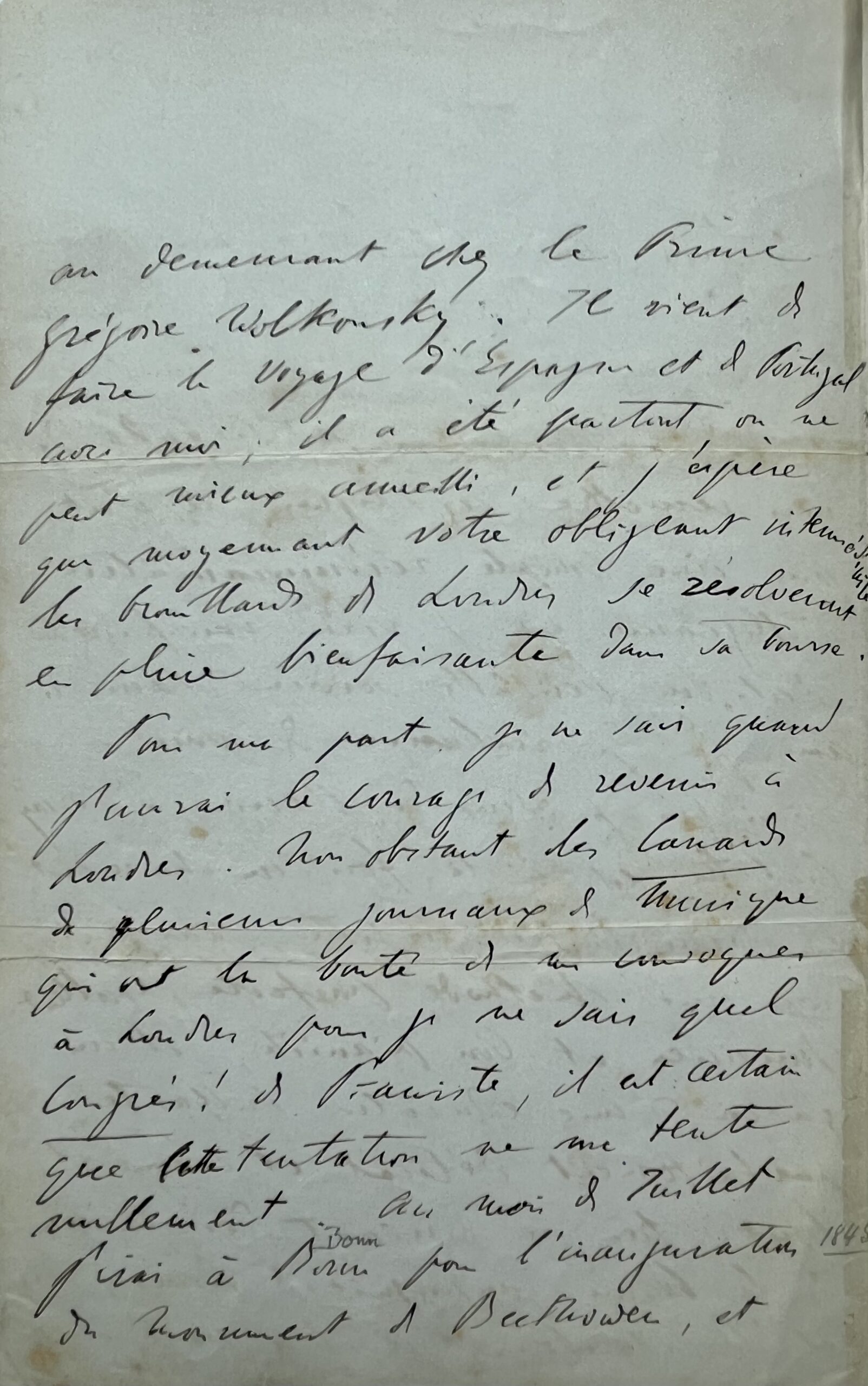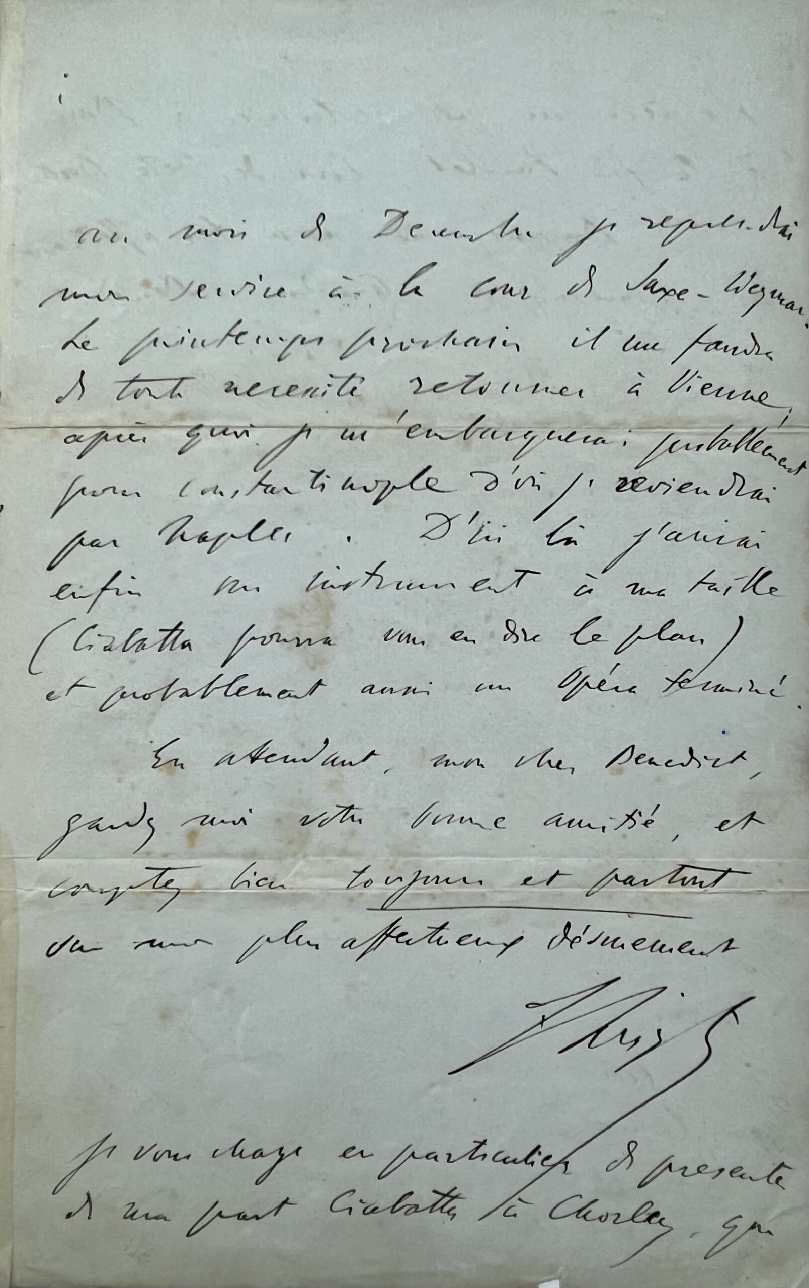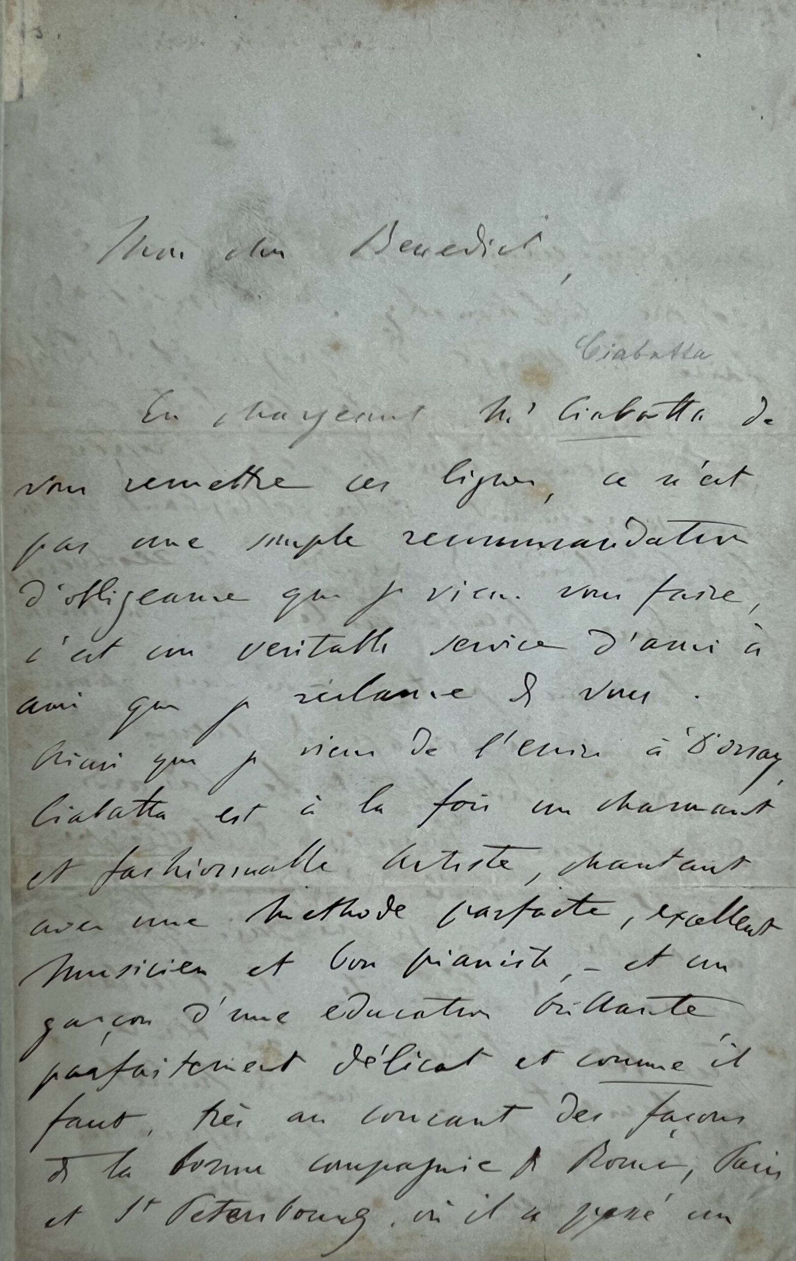 " En chargeant Mr Ciabatta de vous remettre ces lignes, ce n'est pas une simple recommandation d'obligeance que je viens vous faire, c'est un véritable service d'ami à ami que je réclame de vous. Ainsi que je viens de l'écrire à d'Orsay, Ciabatta est à la fois un charmant et fashionable artiste, chantant avec une méthode parfaite, excellent musicien et un bon pianiste, – et un garçon d’une éducation brillante, parfaitement délicat et comme il faut, très au courant des façons de la bonne compagnie de Rome, Paris et St Petersbourg, où il a passé un an demeurant chez le Prince Grégoire Wolkonsky". Il a accompagné Liszt pendant sa tournée en Espagne et au Portugal, où il a reçu bon accueil. Liszt espère que, grâce à Benedict, "les brouillards de Londres se résolveront en pluie bienfaisante dans sa bourse". Liszt, quant à lui, n’a pas "le courage de revenir à Londres", bien que "les Canards de plusieurs journaux de musique" le disent invité "par je ne sais quel Congrès ! de pianistes". "Au mois de juillet [1845], j'irai à Bonn pour l’inauguration du monument de Beethoven, et au mois de décembre je reprendrai mon service à la cour de Saxe-Weymar. Le printemps prochain, il me faudra de toute nécessité retourner à Vienne, après quoi je m’embarquerai probablement pour Constantinople, d’où je reviendrai par Naples. D’ici là, j’aurai enfin, un instrument à ma taille (Ciabatta pourra vous en dire le plan) et probablement un opéra terminé [...]. En attendant, mon cher Benedict, gardez-moi votre bonne amitié [...]. J'espère un peu retourner à Bonn à la fin de juillet, lors des Fêtes-Beethoven [...]". Signature « F. Liszt ».