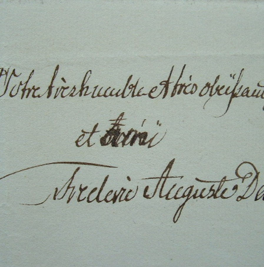 Frédéric-Auguste 1er Saxe (de) (1750/1827)Lettre amicale du futur roi de Saxe, pleine d'humilité. Il fera tout ce qui sera en son pouvoir pour mériter l'estime de son correspondant. «Tel que Rome augmenta toujours en grandeur quand Carthage sa rivale se trouva encore brillante, vous me servirez toujours, mon ami, à me faire bien juger par tout ce que vous me dites, ce qui me manque encore et ce qu'il faudrait ajouter pour mériter votre approbation. La plus grande de mes études est celle de tâcher à découvrir toujours mes défauts. Je l'envisage comme le moyen le plus utile pour devenir plus parfait et j'ai remarqué que quand on a le courage de se présenter tout nu, l'horreur qu'on prend pour ses imperfections, l'humilité de se sentir inférieur à tant d'autres, nous donne tout de suite plus de force pour entreprendre de meilleures actions, que quand l'on croit avoir déjà achevé sa tâche et se trouver au pinacle de la perfection [...] ; quand le voile n'est pas levé ou pour mieux dire que le nuage épais ne s'est point dissipé et nos yeux par conséquent pas entièrement dévoilés, nous n'arriverons jamais [...]».