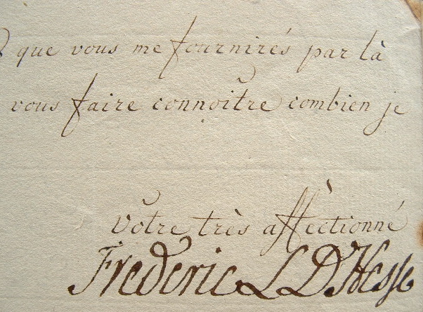 Frédéric II Hesse-Cassel (landgrave de) (Cassel, 1720/1785)Frédéric de Hesse, landgrave de Cassel, vient de recevoir la lettre de démission de son directeur des spectacles, le marquis de Luchet. «Je crois vous avoir prouvé combien j'aime à vous faire plaisir et vous me trouverés toujours dans les mêmes dispositions dès que l'impossibilité de s'y opposera pas. La proposition que vous me faites d'être déchargé de la direction de mes spectacles est cependant de nature à ne pouvoir vous l'accorder, parce que d'un côté je sens parfaitement le vide que vous y laisserés et que de l'autre personne à ma Cour ne possède l'art de manier cette partie, pour ne rien dire des connoissances qu'il faut pour cela et qu'un autre n'acquierera pas si aisément. Si vos autres départemens vous occupent, vous y trouvés de quoi vous retourner et ne manqués pas d'assistans qui feront le reste [...]». [Le marquis de Luchet participa grandement au faste et à la réputation de la Cour de Hesse-Cassel, en particulier, en représentant des pièces de Nerciat, le célèbre libertin].