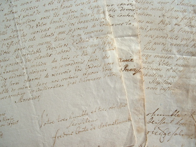 Deux lettres de Frédéric comte de Solms-Baruth (une signée par son secrétaire), et une de son épouse, la princesse d'Anhalt-Bernberg, demandant conseils pour des plantations dans le parc de leur château de Baruth (Saxe). Ayant lu dans le traité de Pellée, que les peupliers d'Italie seraient préférables, il demande conseil. «J'ai souhaité d'en pouvoir cultiver aussi, mais d'en avoir de véritables sans être trompé par différentes autres espèces [...]. L'espérance que M. Pellée donne de votre bonté, monsieur le marquis, de vouloir gratifier les curieux avec des branches véritables, a été l'effet de cette liberté que je prends de vous écrire et de vous prier en même tems de m'envoyer quelques branches de véritables peupliers d'Italie coupés de la façon de pouvoir les planter d'abord dans une pépinière [...]». La comtesse vient de recevoir l'ouvrage de Chambray [L'art de cultiver les pommiers, les poiriers et de faire du cidre selon l'usage de la Normandie, paru en cette année 1765] et l'en remercie. «Cet été les boutures des peupliers d'Italie qui sont venus d'une grandeur considérable, nous ont procurés un plaisir agréable de voir que les arbres poussent plus avant dans notre contrée [...]». De retour de Wismar, le comte de Solms remercie à son tour Chambray. «Je donnerai en attendant votre ouvrage pour traduire à l'usage de mes jardiniers et il est certain que quiquonque lira votre traité, souhaitera que tous les auteurs puissent vous imiter. Vos peupliers commencent bien [...]».