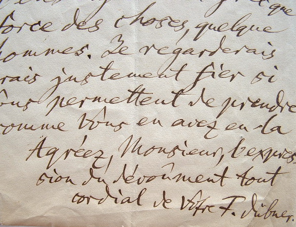 Frédéric Dübner (Hoerselgau, 1802/1867)Frédéric Dübner propose ses services pour la rédaction d'articles de la Bibliothèque Universelle, et adresse quelques ouvrages. Il propose des sujets à traiter, et dont il indique les grandes lignes. Puis il évoque la brochure qu'il vient de faire paraître et déplore le manque d'écho et d'intérêt qu'elle suscite. «Devant tous les hauts bonnets, le ministre, les inspecteurs généraux hellénisants, le recteur Artaud, etc., je me suis lamenté sur la honte hellénique de la France : rien n'a fait. Je viens donc de soumettre directement au Conseil Impérial la seconde brochure sur la Routine que j'ai l'honneur de vous envoyer et que vous trouverez passablement forte. Si le Grand Conseil ne fait rien, j'ai l'intention de publier le mois prochain une troisième brochure où le Conseil lui-même figurera parmi les trembleurs devant la routine. A l'heure qu'il est, je suis renié par tout le monde ici ; de quelques "amis" même je ne reçois plus de lettres depuis quelques temps. Tout cela ne m'inquiète pas le moins du monde : la réforme de l'enseignement grec à laquelle je veux arriver par la force des choses, quelque soit la conduite de nos hommes [...]».