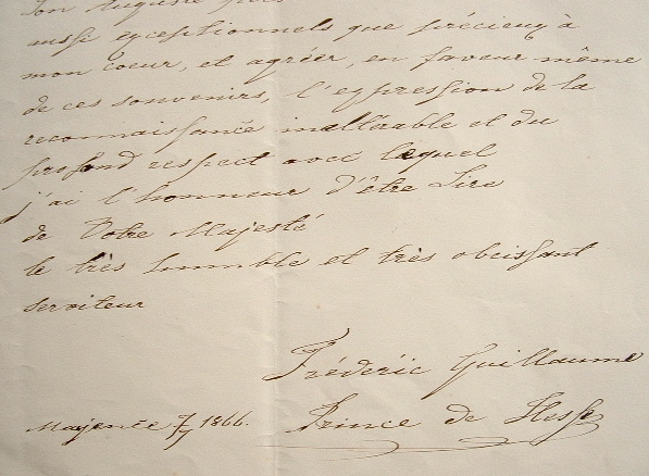Frédéric-Guillaume 1er Hesse-Cassel (de) (Philippsruhe, 1802/1875)[Lors de la guerre austro-prussienne de 1866, Frédéric-Guillaume 1er de Hesse, allié de l'Autriche, est vaincu militairement après la bataille de Sadowa (3 juillet 1866)]. Dans cette lettre, Frédéric-Guillaume 1er, aux abois, tente une ultime manoeuvre auprès de Napoléon III. «La phase critique dans laquelle se trouvent actuellement les intérêts dynastiques de l'Allemagne, et la confiance à laquelle Votre Majesté a daigné m'autoriser, quand naguère, j'osais m'adresser à elle dans la question du protocole de Londres, m'enhardit à derechef recourir à sa très haute bienveillance pour très humblement lui soumettre une question dont peut dépendre tout l'avenir, et de ma maison, et du rôle qu'elle sera appelée à jouer en Allemagne». Il avait réussi, au début de la guerre, à retirer le contingent électoral de Hesse et à l'incorporer à la garnison neutre de Mayence. «Cette mesure établit comme un fait la continuation d'existence du gouvernement électoral et lui donne - déplacé comme il l'est, mais non aboli par une prise partielle de possession étrangère effectuée avant même l'explosion de la guerre - le droit de se prononcer dans la grande question finale, qui va bientôt préoccuper les cabinets de l'Europe. Cette question, d'autant plus brûlante pour les états secondaires, qu'une paix séparée pourrait bien passer sous silence leurs intérêts particuliers, m'autorise à demander à Votre Majesté si, selon ses vues, je ne ferais pas bien d'engager mon cousin l'Electeur, à s'entendre à l'amiable avec la Cour de Berlin, auprès de laquelle le très haut appui de Votre Majesté daignerait peut-être, le cas échéant, nous accorder, deviendrait sans nul doute concluant [...]». Il lui demande son avis sur cette question cruaciale pour l'avenir de la principauté de Hesse. [Mais la Prusse le forcera à l'abdication et à l'exil. Par le traité de Prague, la confédération est dissoute et la Hesse annexée au royaume de Prusse].