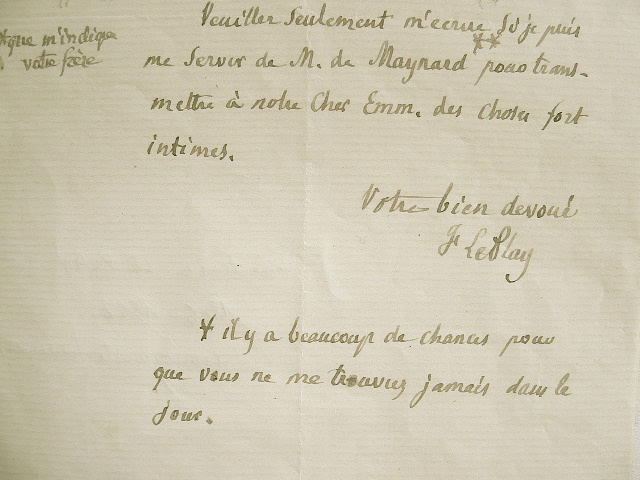 «La visite que vous m'avez faite par ce temps rigoureux me cause un vrai désespoir. Je vous supplie de ne plus rien tenter. Il y a beaucoup de chances pour que vous me ne trouviez jamais dans le jour ; et de me pardonner si je ne vais pas vous chercher : ma santé me l'interdit absolument [...]».