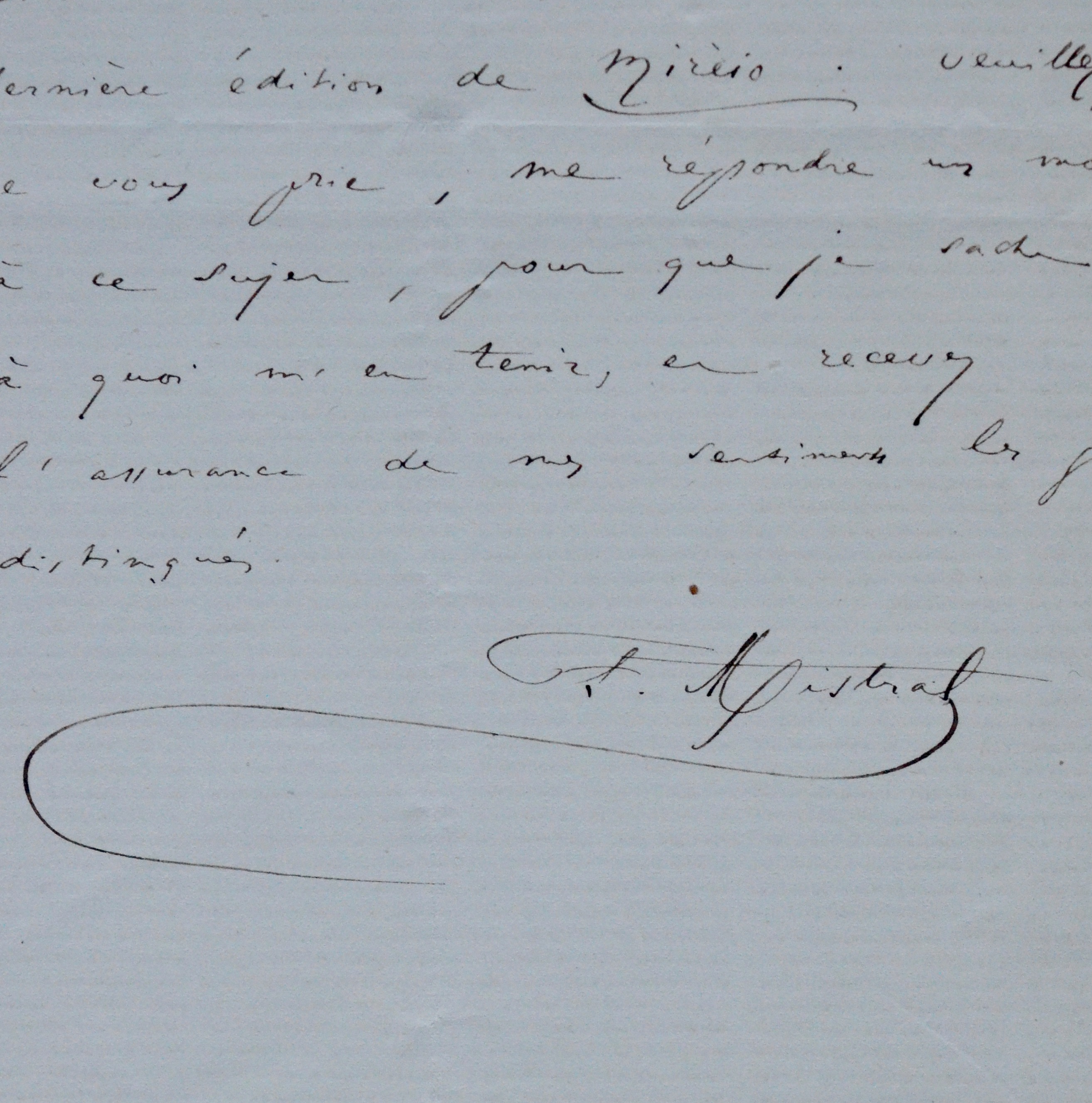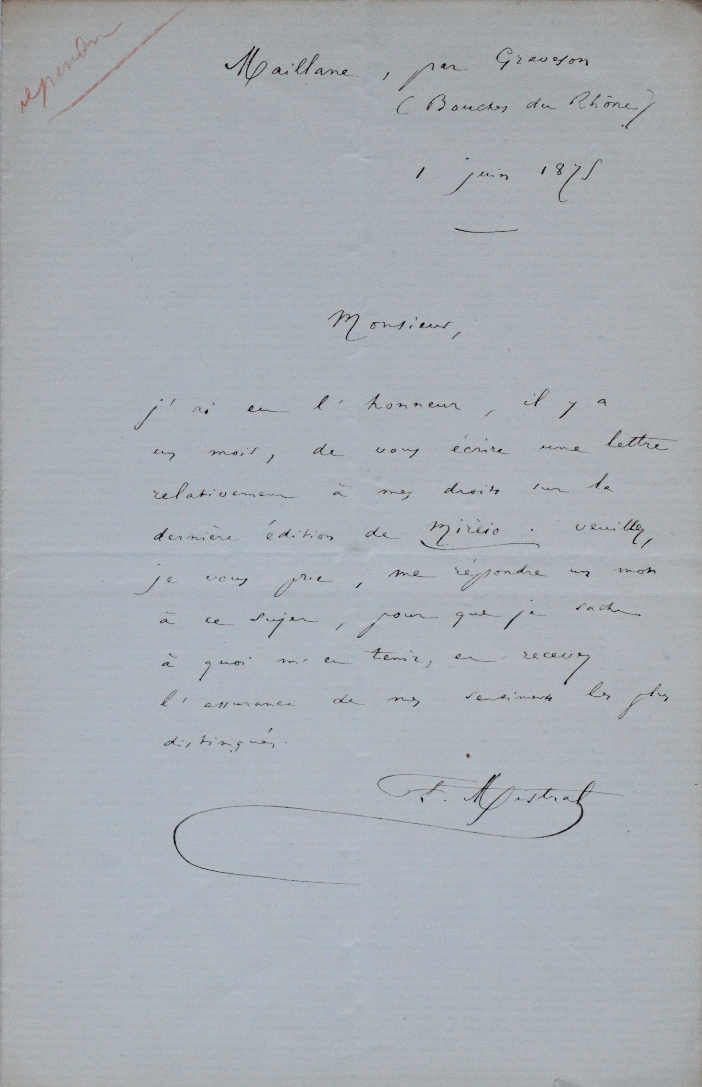 "J'ai eu l'honneur, il y a un mois, de vous écrire une lettre relativement à mes droits sur la dernière édition de Mirèio. Veuillez, je vous prie, me répondre un mot à ce sujet, pour que je sache à quoi m'en tenir [...]".