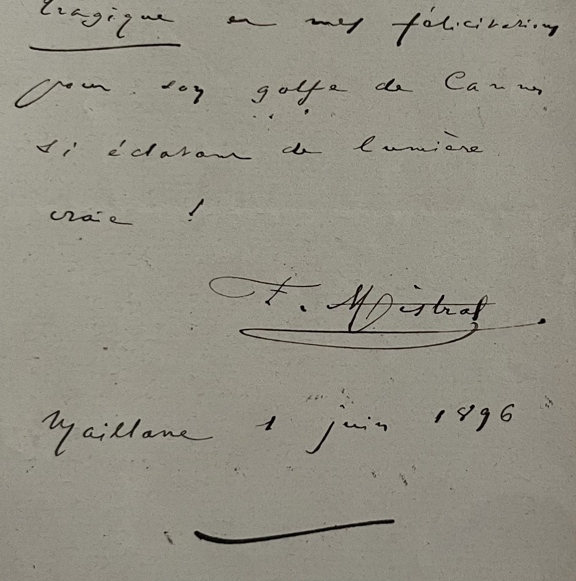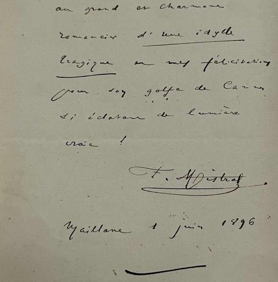 "Mon admiration continue au grand et charmant romancier d'une idylle tragique et mes félicitations pour son golfe de Cannes si éclatant de lumière vraie !"