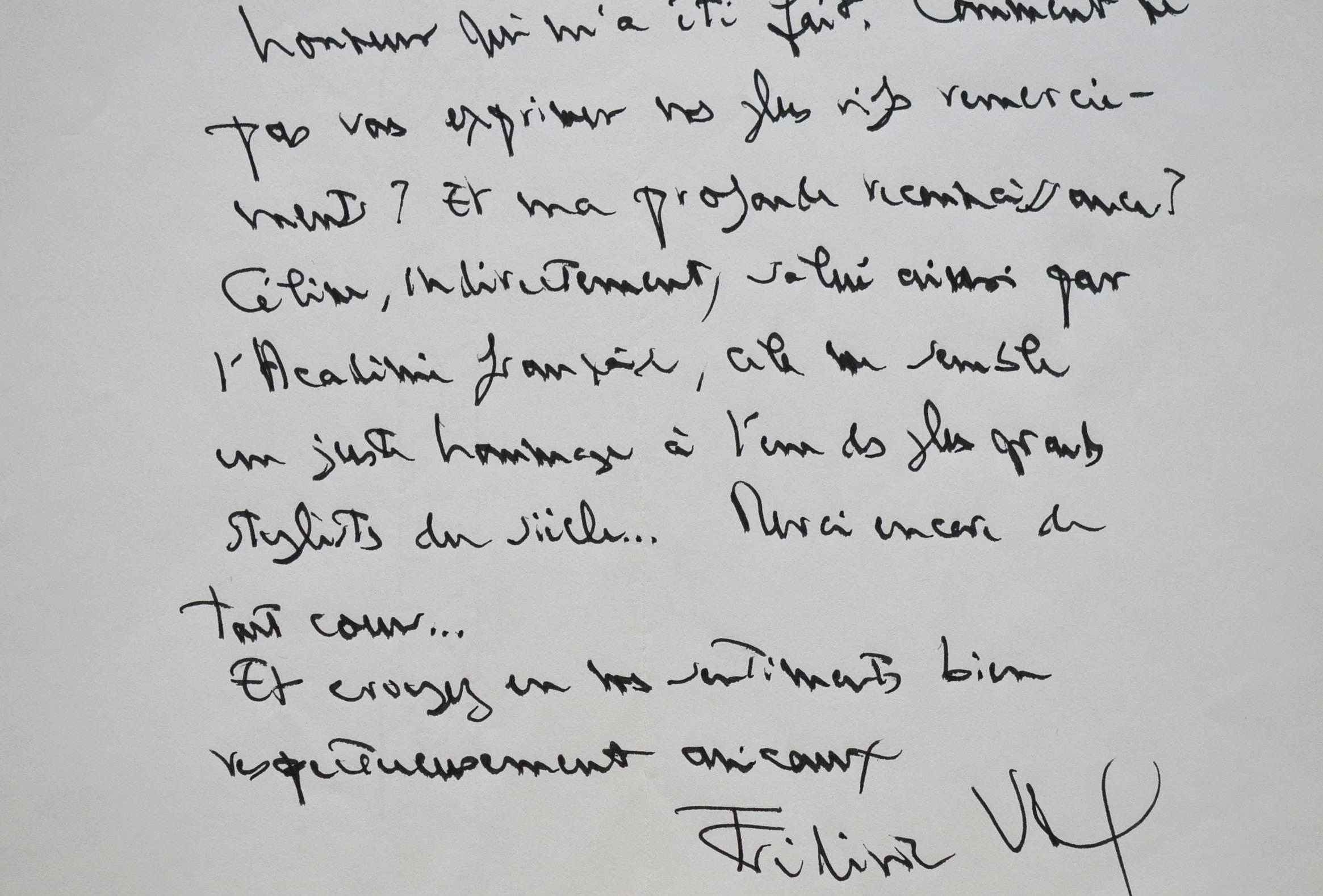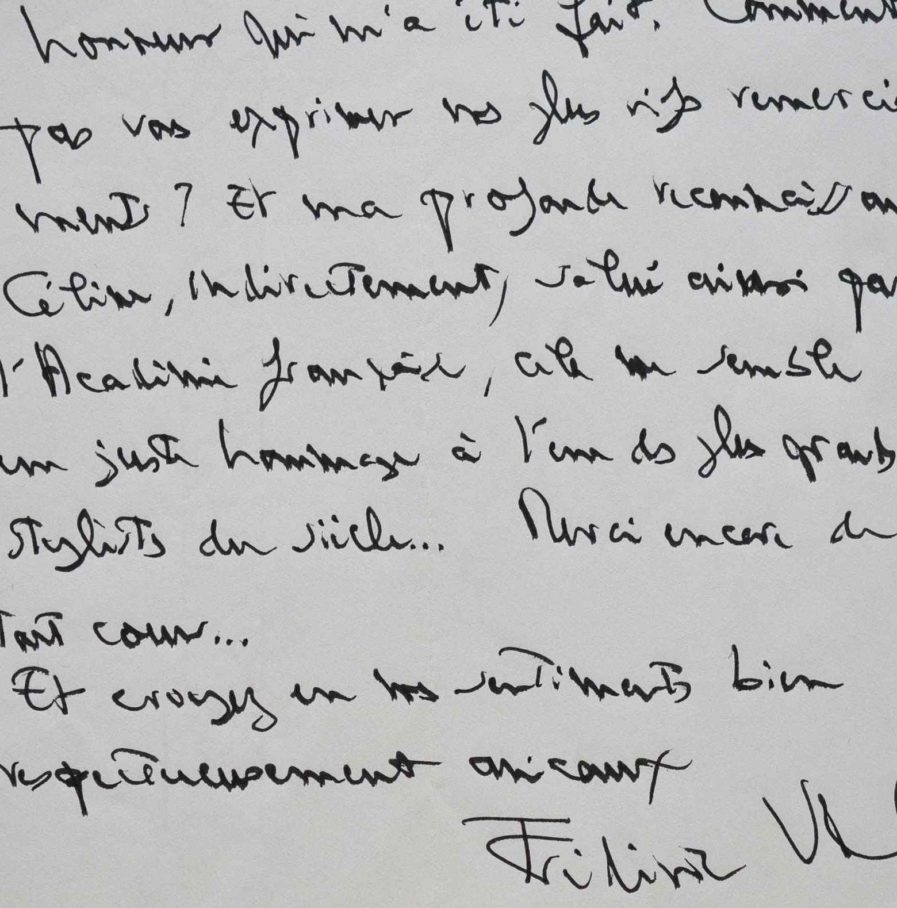 "Ce prix de la critique de l'Académie française pour "La Vie de Céline" m'a fait un très vif plaisir. Vous aviez bien voulu m'écrire un mot très chaleureux sur ce livre. Je pense que vous n'êtes pas étranger à cet honneur qui m'a été fait. Comment ne pas vous exprimer mes plus vifs remerciements? Et ma profonde reconnaissance? Céline, indirectement, salué ainsi par l'Académie française, cela me semble un juste hommage à l'un des plus grands stylistes du siècle [...]".