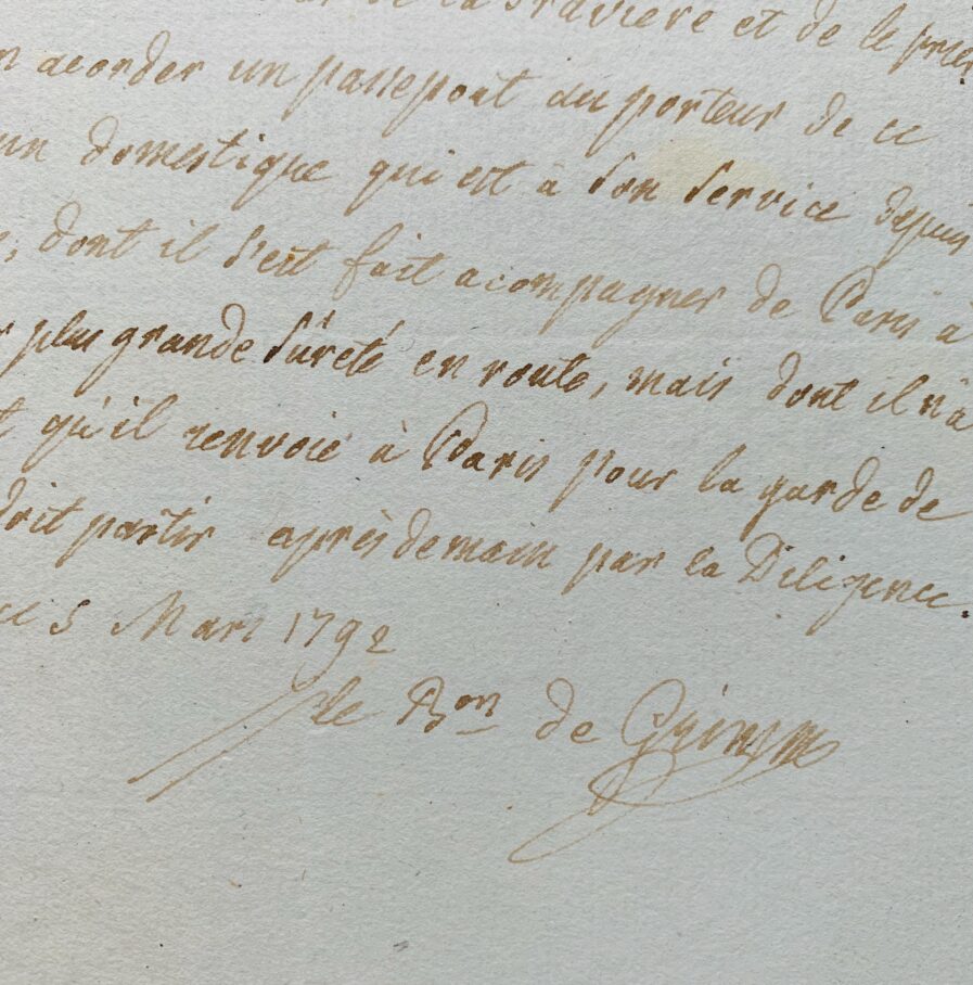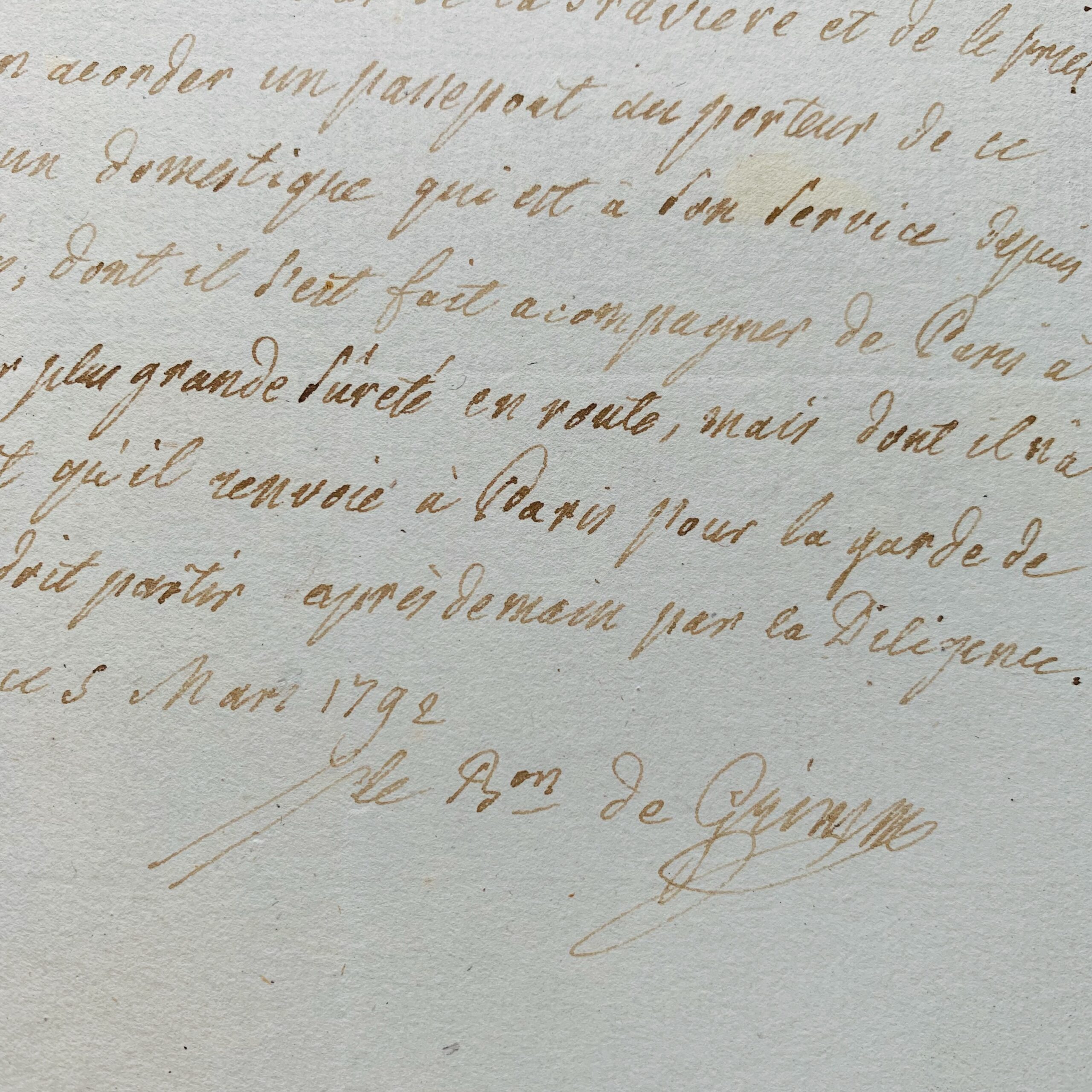 Frédéric Melchior Grimm (Ratisbonne, 1723/1807)Grimm ayant quitté Paris dès le début de la Révolution, demande un passeport pour un domestique chargé de surveiller sa maison à Paris.
