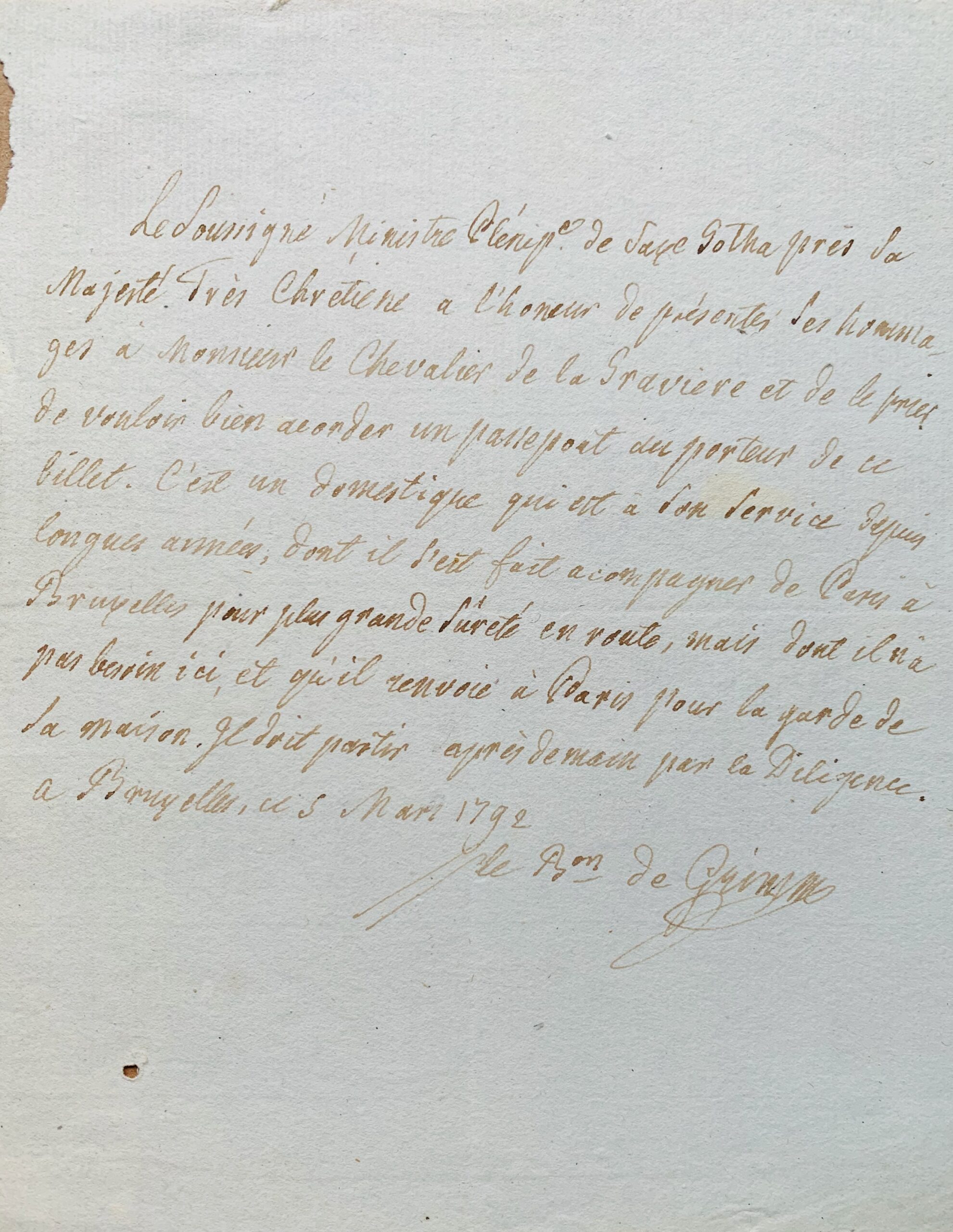 "Le soussigné ministre plénip[otentiaire] de Saxe Gotha près Sa Majesté Très Chrétienne a l'honneur de présenter ses hommages à monsieur le Chevalier de La Gravière [résident de France à Bruxelles] et de le prier de vouloir bien accorder un passeport au porteur de ce billet. C'est un domestique qui est à son service depuis [de] longues années, dont il s'est fait accompagner de Paris à Bruxelles pour plus de sûreté en route, mais dont il n'a pas besoin ici, et qu'il renvoie à Paris pour la garde de sa maison. Il doit partir après-demain par la diligence".